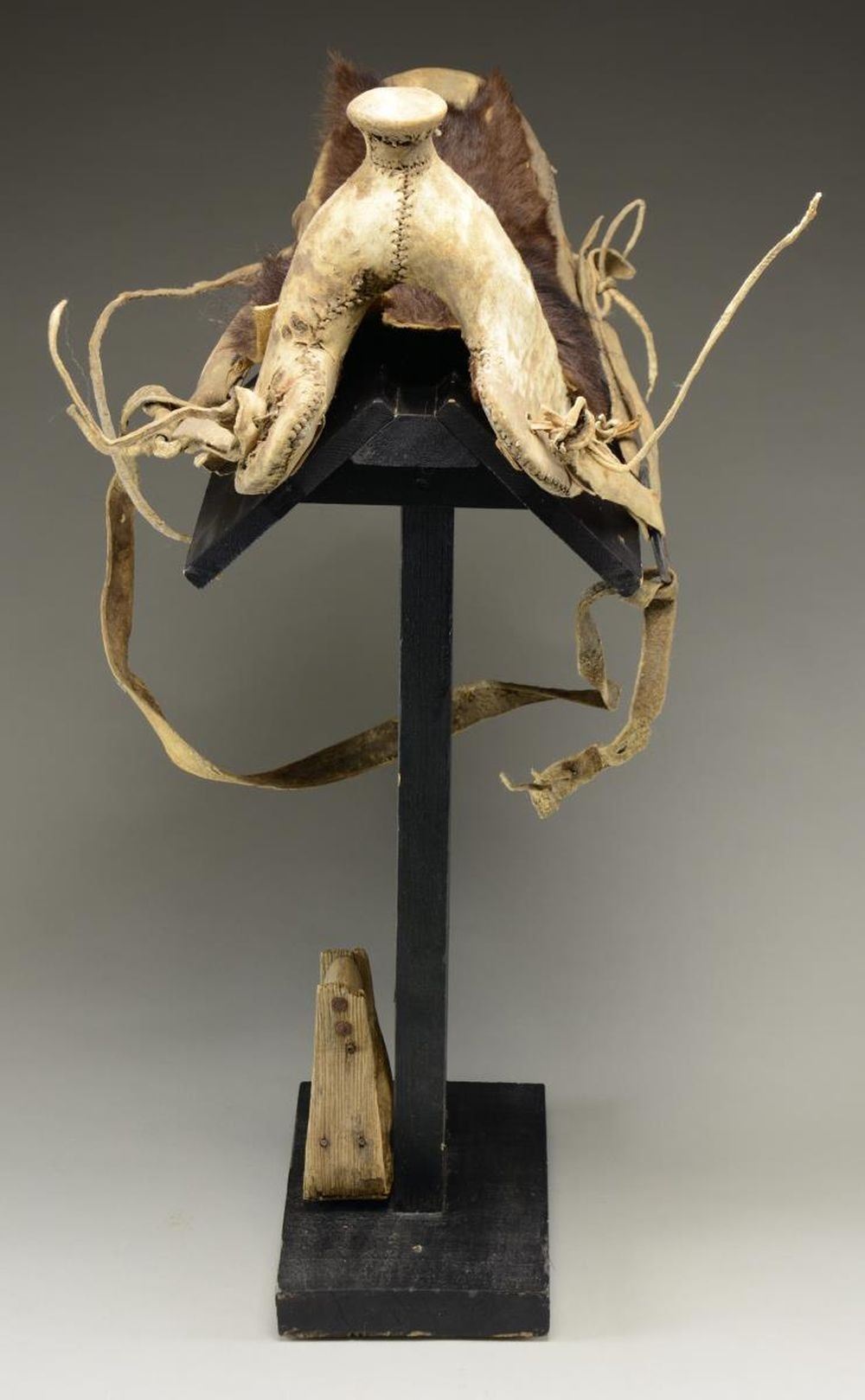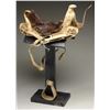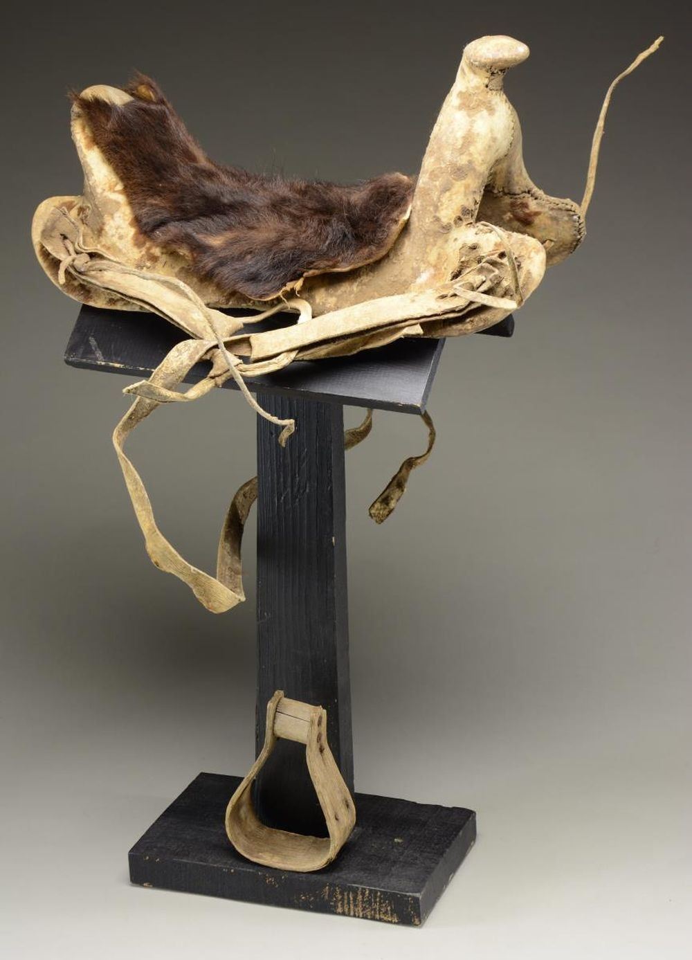 This saddle tree is pictured and described on page 231 in "THE FUR TRADE" by Author Milton von Damm: "This is a handmade saddle with both Spanish and Indian characteristics. It is small (16"x8") and was probably for a mule. It is very light and may have been made from Cottonwood, possibly in the wilderness. It is covered with rawhide and stitched with rawhide laces. The high horn and cantle are a Spanish style and the single rig, attached to the sidebars, made nearly entirely from tanned leather, is Indian. The saddle came from the Taos region and is circa 1820-30. The seat was probably a piece of blanket or buffalo hide. Trapper brigades were outfitted with manufactured Spanish style saddles, usually made in St. Louis." CONDITION: good overall, sections of new hide still have some fur attached with custom wood stand. UNATTACHED ACCESSORIES: descriptive sheet. PROVENANCE: Robert Blanchet Collection; Lifelong Collection of author Milton von Damm. (02-22233/JS). $1,000-2,000.