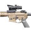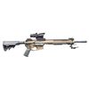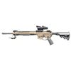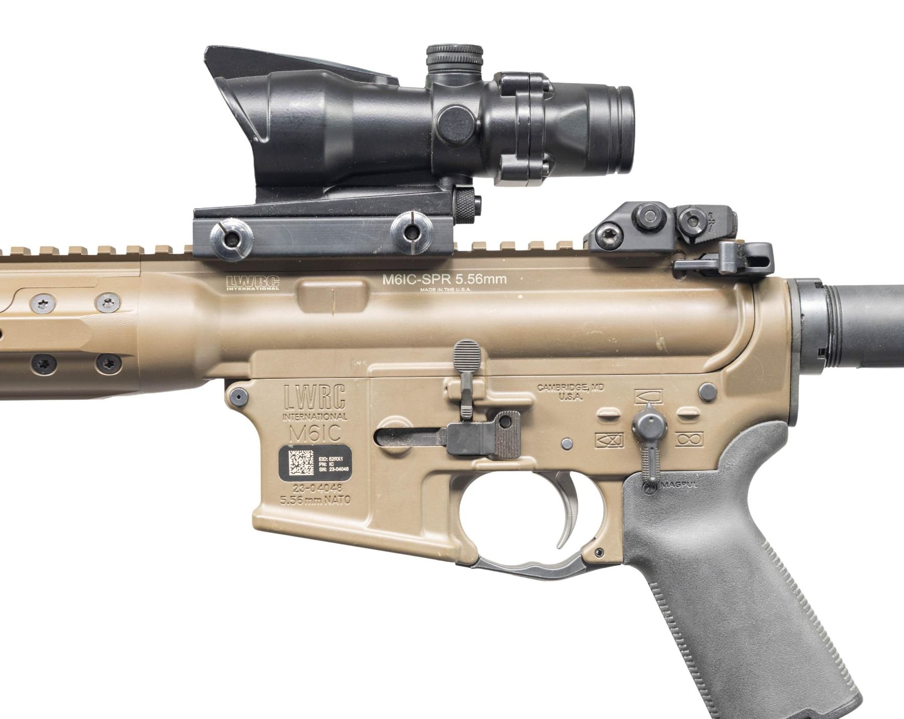 Cal. 5.56mm. S# 23-04048. Bbl. 16". M6IC-SPR (M6 Individual Carbine Special Purpose Rifle) semi-automatic rifle mfg. by LWRC. The left side of the receiver is marked "LWRC/ INTERNATIONAL/ M6IC/ (QR CODE PLATE)/ 23-04048/ 5.56mm NATO", with "CAMBRIDGE, MD/ U.S.A." marked towards the selector lever. 3-position pictogram selector is marked with an infinity symbol at the third position. Left side of the flat top upper is marked with the LWRC logo, followed by "M6IC-SPR 5.56mm/ MADE IN THE U.S.A.". Receiver, upper, and handguard exhibit a "Patriot Brown" cerakote finish. NiCorr treated spiral fluted bbl. and 4-prong flash hider exhibit a blue finish. Nickel-Boron coated bolt carrier with phosphate finished bolt. Black synthetic LWRC enlarged trigger guard, with MAGPUL MOE pistol grip, and black synthetic LWRC Compact adj. buttstock. Flip-up open top LWRC post front sight with LWRC flip-up 4-aperture rear sight. Upper is fitted with an IJK Optics Co. ACOG style (x1 power) green dot optic. Ventilated handguard features factory threaded holes for a picatinny rail attachment. Underside of handguard is fitted with 2 picatinny rails, 1 mounted with an IJK Optics Co. N2LG-SPX LED flashlight laser combo. Short stroke gas piston action with ambidextrous controls consisting of the bolt release lever, mag. release button, selector lever, as well as the charging handle. Mag. is absent. CONDITION: metal components retain the vast majority of their original factory finish, exhibiting some superficial handling marks overall. Mirror bore, exhibiting well defined rifling throughout. Proper manual mechanics. Polymer furniture shows some superficial handling marks, but otherwise remains very good overall. IJK green dot sight retains a clear optic. (25-5491/MLW). MODERN. $1,200-1,800.