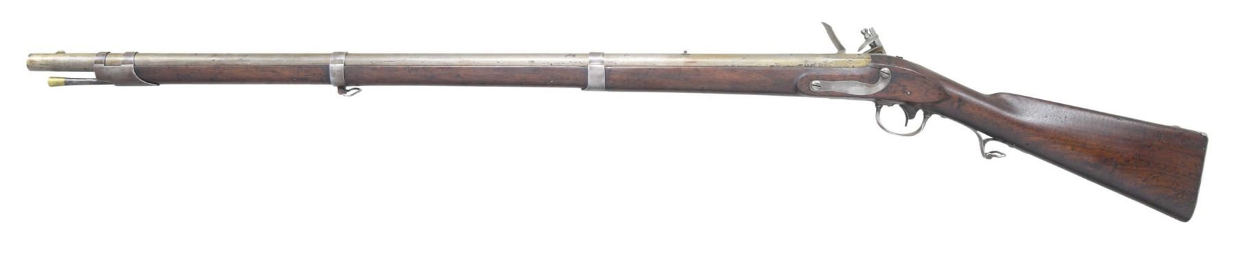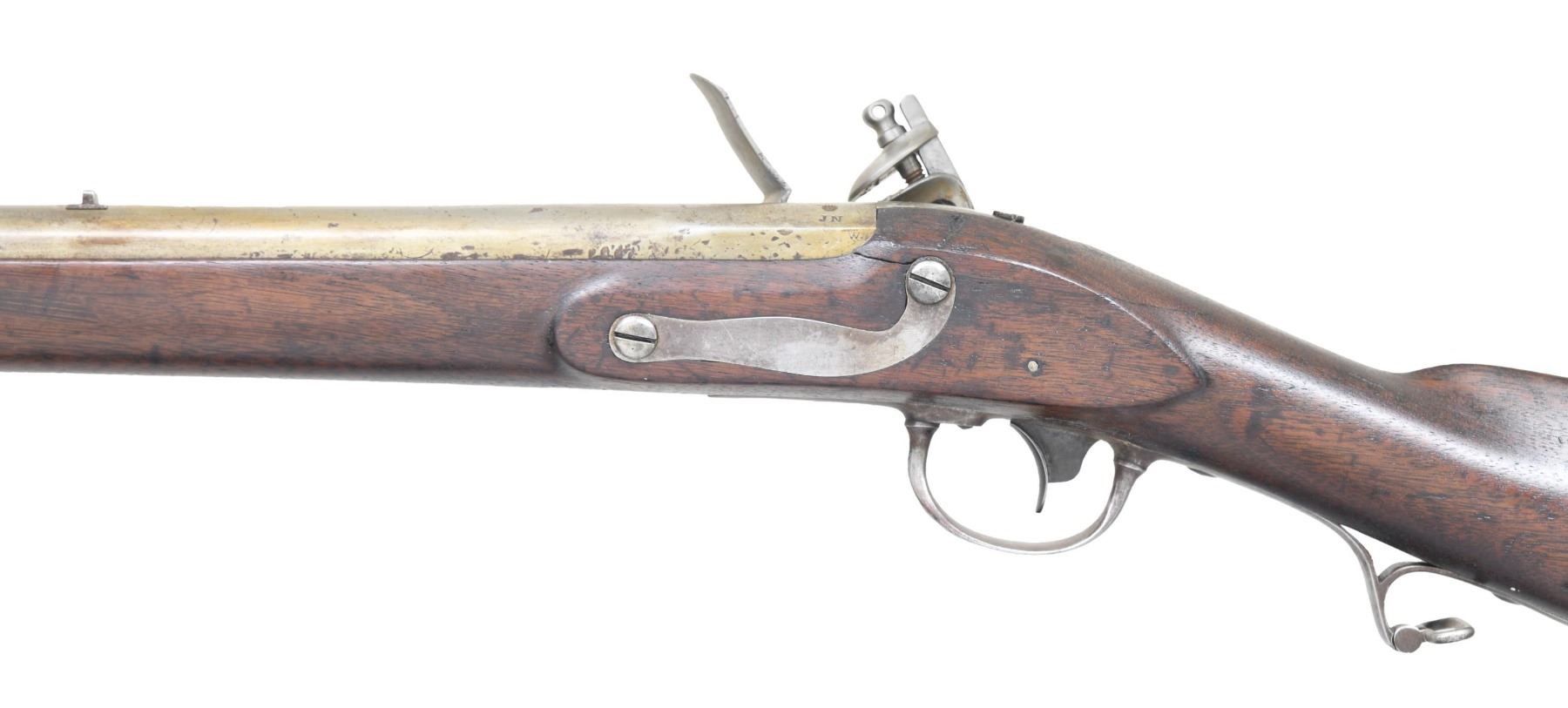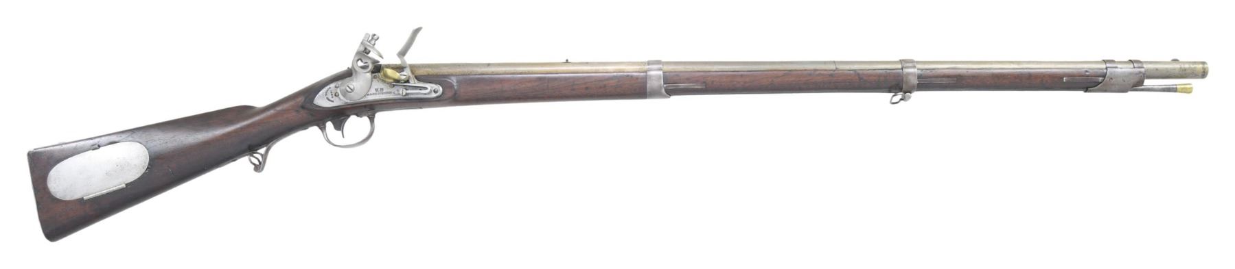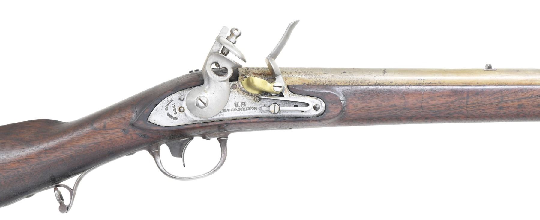 U.S. FLINTLOCK ARTILLERY MUSKET. Cal. 69. NSN. Bbl. 36" with smooth bore. Blade front sight with V-notch rear sight. Breech end of bbl. is marked "U.S." over "P" proof and inspection initials "JN". Top tang and lock are dated "1824". Forward portion of lock is marked "U.S./ R.&J.D. JOHNSON" with "MIDDLETON, CONN" address at the rear of lock below the date. Separate brass flash pan is without fence. 3-band fastened walnut stock with iron buttplate, oval lid patchbox, trigger guard with finger curl, and sling swivels. Brass tipped iron ramrod. R. & J.D. Johnson mfg. approx. 3,000 muskets 1824-1827, lowest quantity of all contract makers. CONDITION: metal shows evidence of heavy cleaning with dents and handling marks having pitting becoming heavy in the breech area. Heavily sanded and refinished stock shows dents and marks with a crack extending from the sideplate. Sound lock. Frizzen spring and some lock screws are apparent replacements. Dark lightly pitted bore. PROVENANCE: Estate of Russell Dickerman. (01-27119/DS). ANTIQUE. $1,200-1,800.
