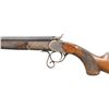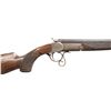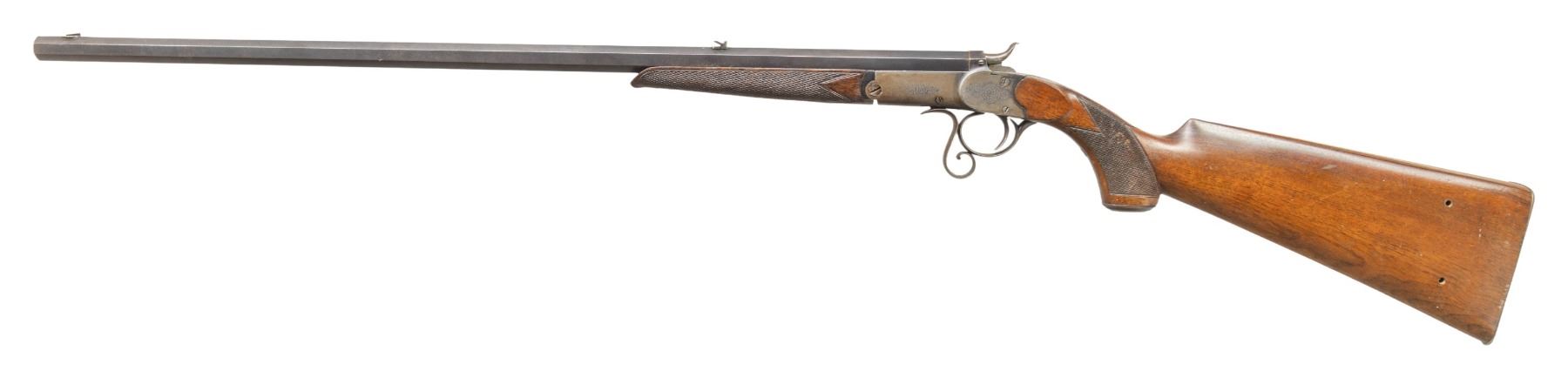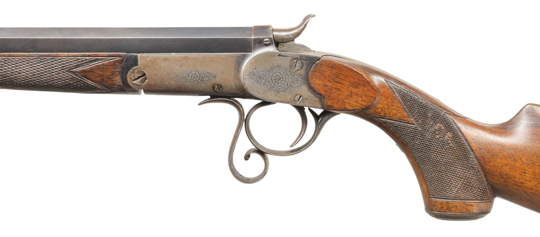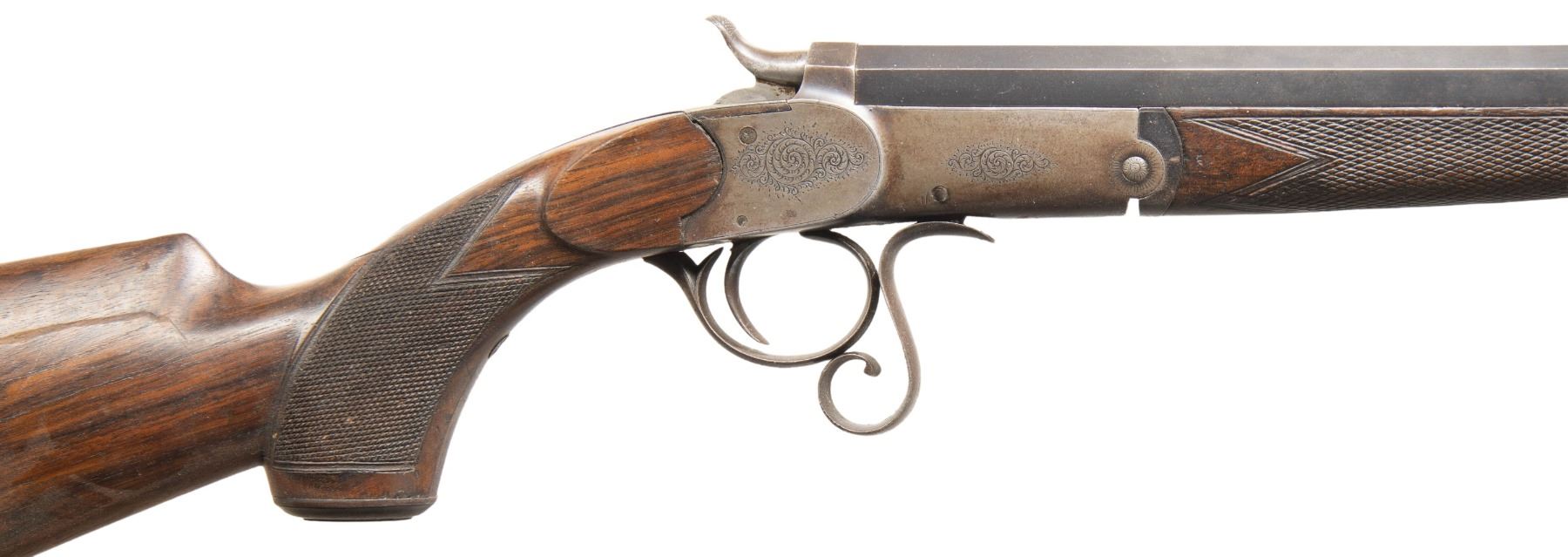 ROOK RIFLE. Cal. 380 Rook. S# 7129. Oct. 28" bbl. w/ blade front sight & 2 leaf rear sight. Round bodied action w/ sprays of acanthus scroll engraving; extends to grip cap. Action is opened by the curled lever that rest in front of triggerguard. Checkered walnut stock set w/ steel buttplate & grip cap. CONDITION: fair fading barrel blue mixing with brown patina showing peppery oxidation. Action has gray patina appearance with traces of blue, pinprick oxidation & a few marks. Good wood finish with dings, sm. gouges & drilled holes into left side buttstock. Good rifling with light pitting. PROVENANCE: Estate of Groves Herrick. (01-28900/MD). ANTIQUE. $300-600.