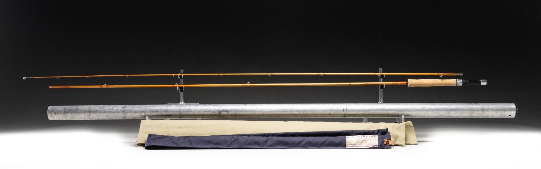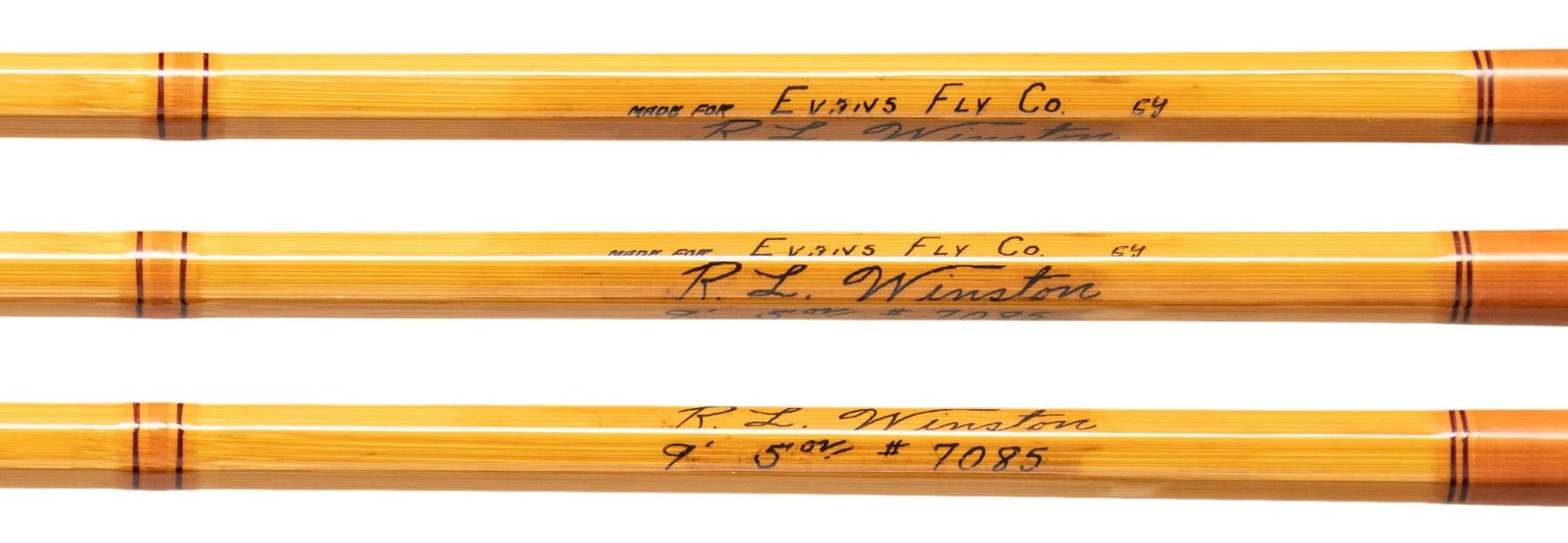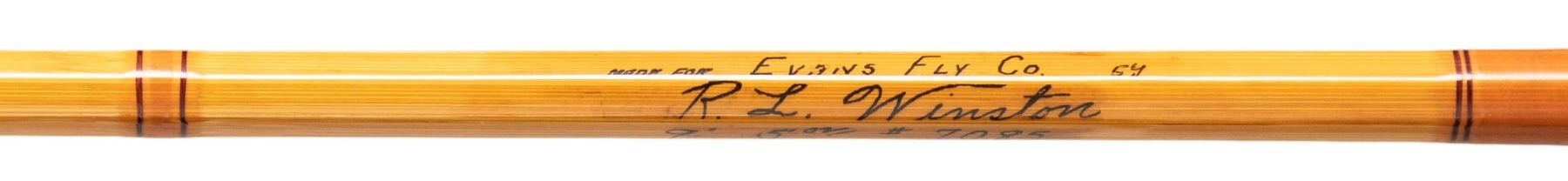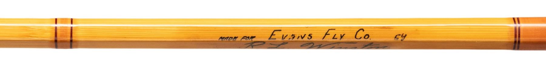 S# 7085. 9', 2 piece, 1 tip, marked "5oz" (probably for #8 line), tan wraps, flared cork handle, Bakelite reel seat, marked "Made for Evan's Fly Co 64" "R.L. Winston" "9' 5oz./#7085". with bag and original tube. CONDITION: very fine showing little use. Tube with old label shows considerable handling. PROVENANCE: From the Private Collection of Berrien Moore III. (02-25866-5/MGM) $500-1,000.
