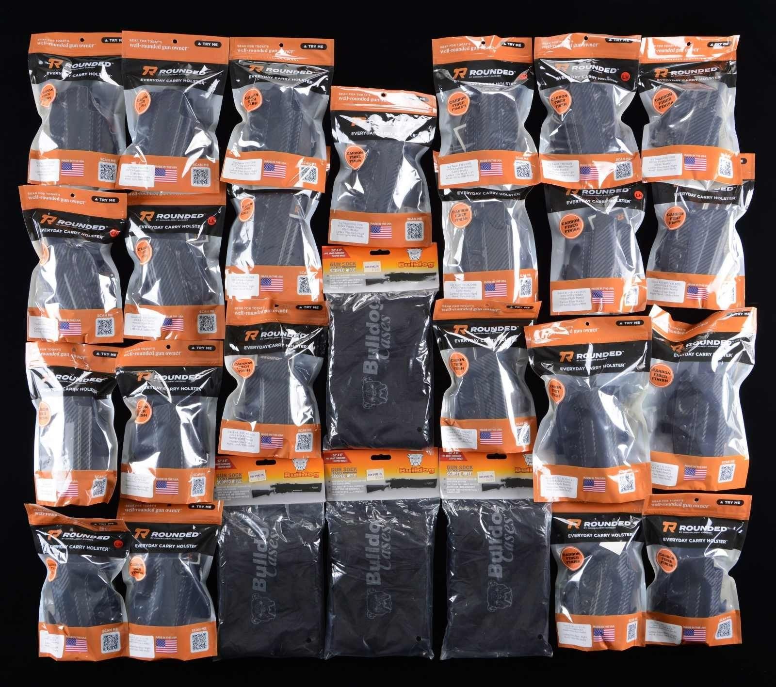 All items are right-handed (unless otherwise noted) and new in their original packaging. All have a carbon fiber finish. TUARUS: 4 for PT111/PT140, Millenium G2/G2C Kydex Paddle. / 3 for G3C Kydex Paddle. / SMITH & WESSON: 5 for M&P Shield, Shield Plus, etc. optics & RMR cut. / 2 left handed for M&P Shield, Shield Plus, etc. optics & RMR cut. / 2 for 1911 Government 5" non-rail Kydex Paddle. / SPRINGFIELD HELLCAT: 4 OWB Kydex Paddle Optic Ready. / BROWNING: 3 for 1911 in 380 IWB Kydex. / 1 left handed for 1911 in 380 IWB Kydex. / SIG SAUER P365 KYDEX OPTIC READY: 5 OWB Paddle. / 2 left handed OWB Paddle. / 1 IWB. / 4 XL OWB Paddle. / GLOCK OWB KYDEX PADDLE OPTIC READY: 5 for 43, 43X or 43X MOS. / 2 for 17, 22 or 31 Gen. 1-5. / 5 for 19, 19X, 23, 32 or 45 Gen. 1-5. / 2 for 17, 22 or 31 Gen. 1-5. / 2 left handed for 19, 19X, 23, 32 or 45 Gen. 1-5. / MISC. 4 Bulldog 52"x6" Gun Socks for scoped rifles. PROVENANCE: the collection of Gun Sport Ltd., owned by Jon R. Thomas. (02-20849/NW). $500-750.