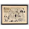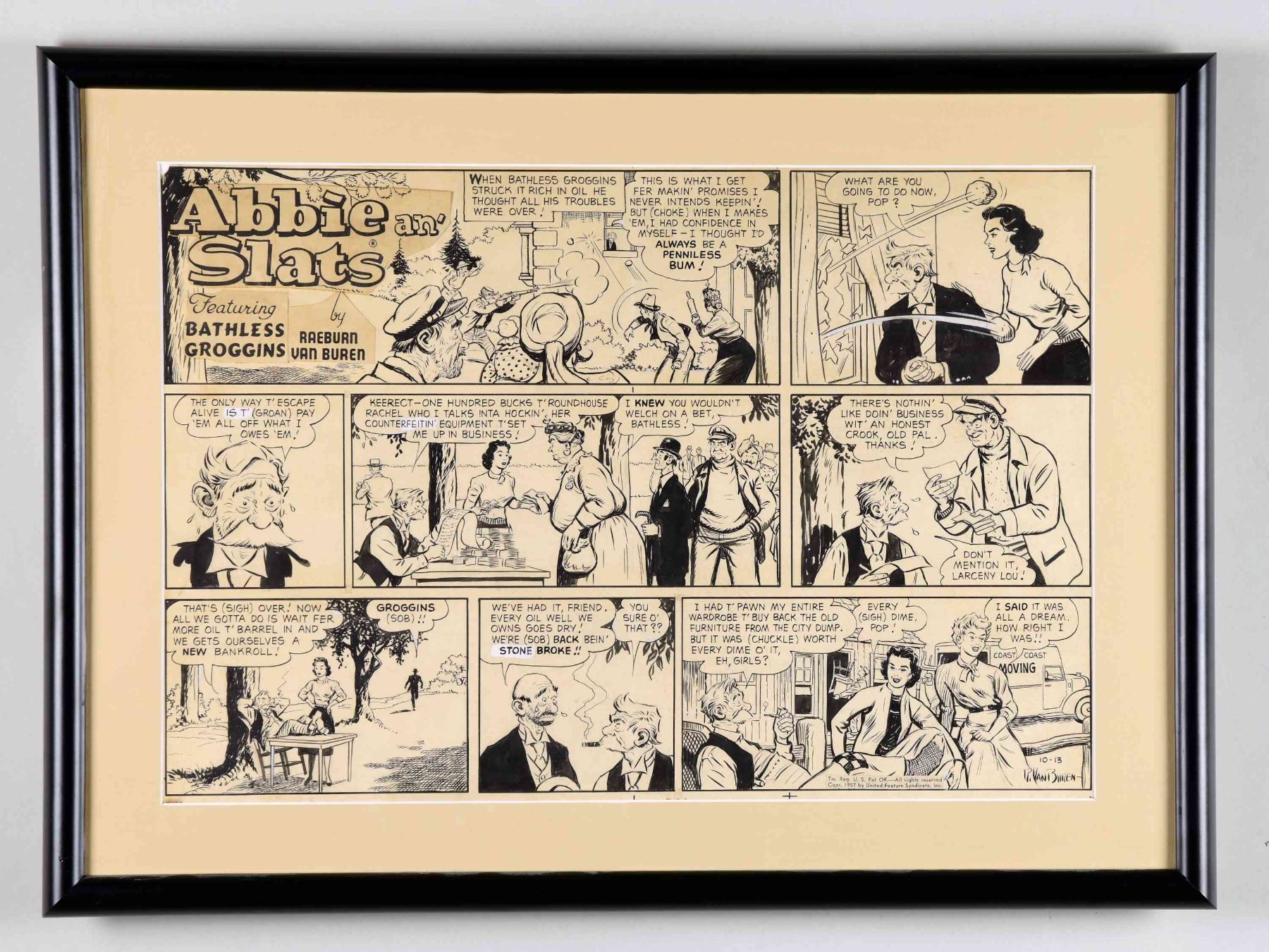 SLATS". Circa 1957 ,10/13. "When Bathless Groggins struck it rich in oil, he thought all his troubles were over!" A three line comic strip sheet with title and credits overlaid in pre-production. Housed in a black molded frame, matted under glass. SIZE: overall 21" x 28 1/2", sight 15 1/2" x 22 3/4". UNATTACHED ACCESSORIES: a copy of 'Abbie an' Slats' comic book. CONDITION: light toning throughout with artist proof typeset corrections in multiple cells. PROVENANCE: from a Private Florida Collection. (05-920/TG). $350-550.