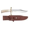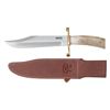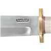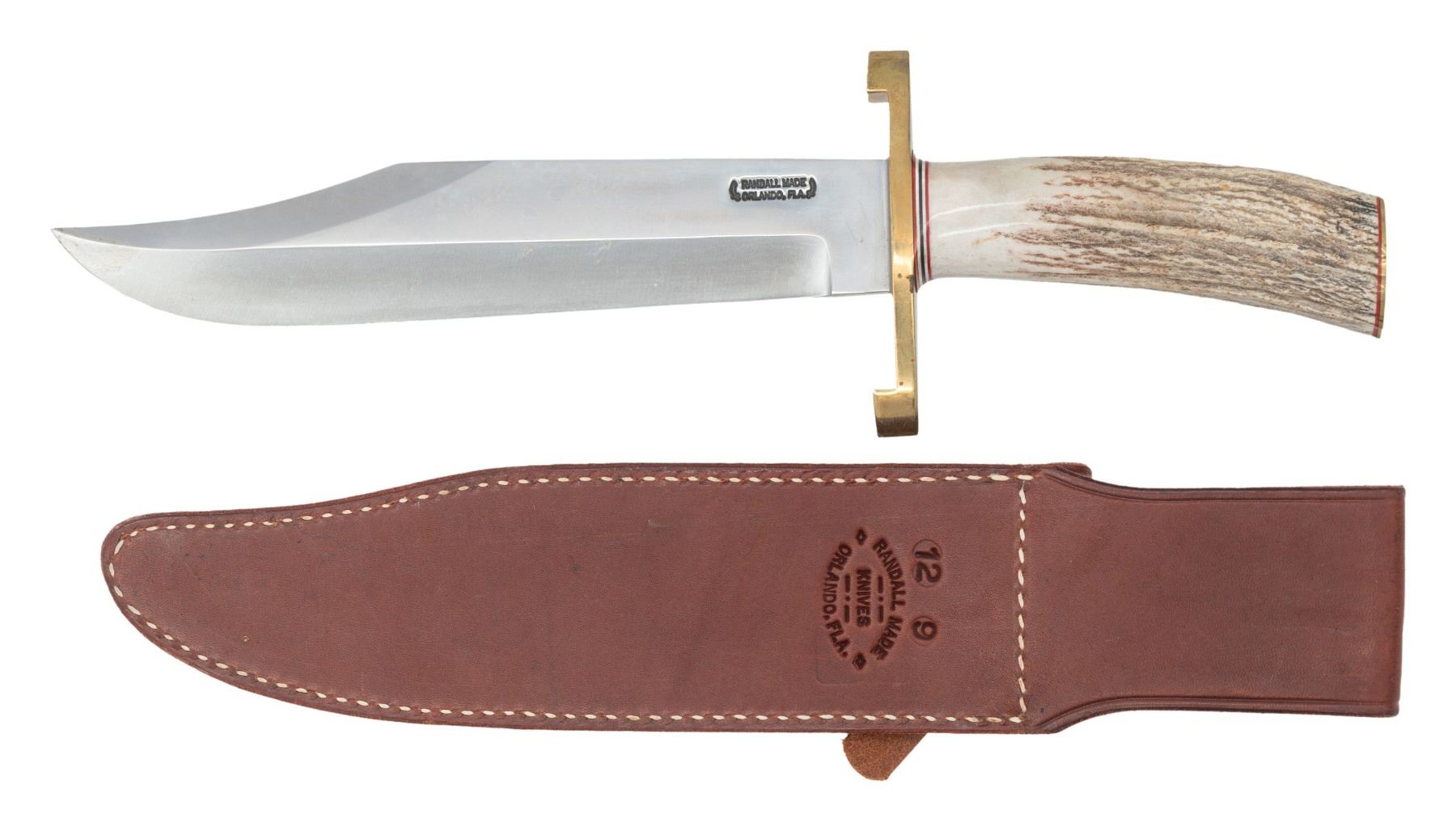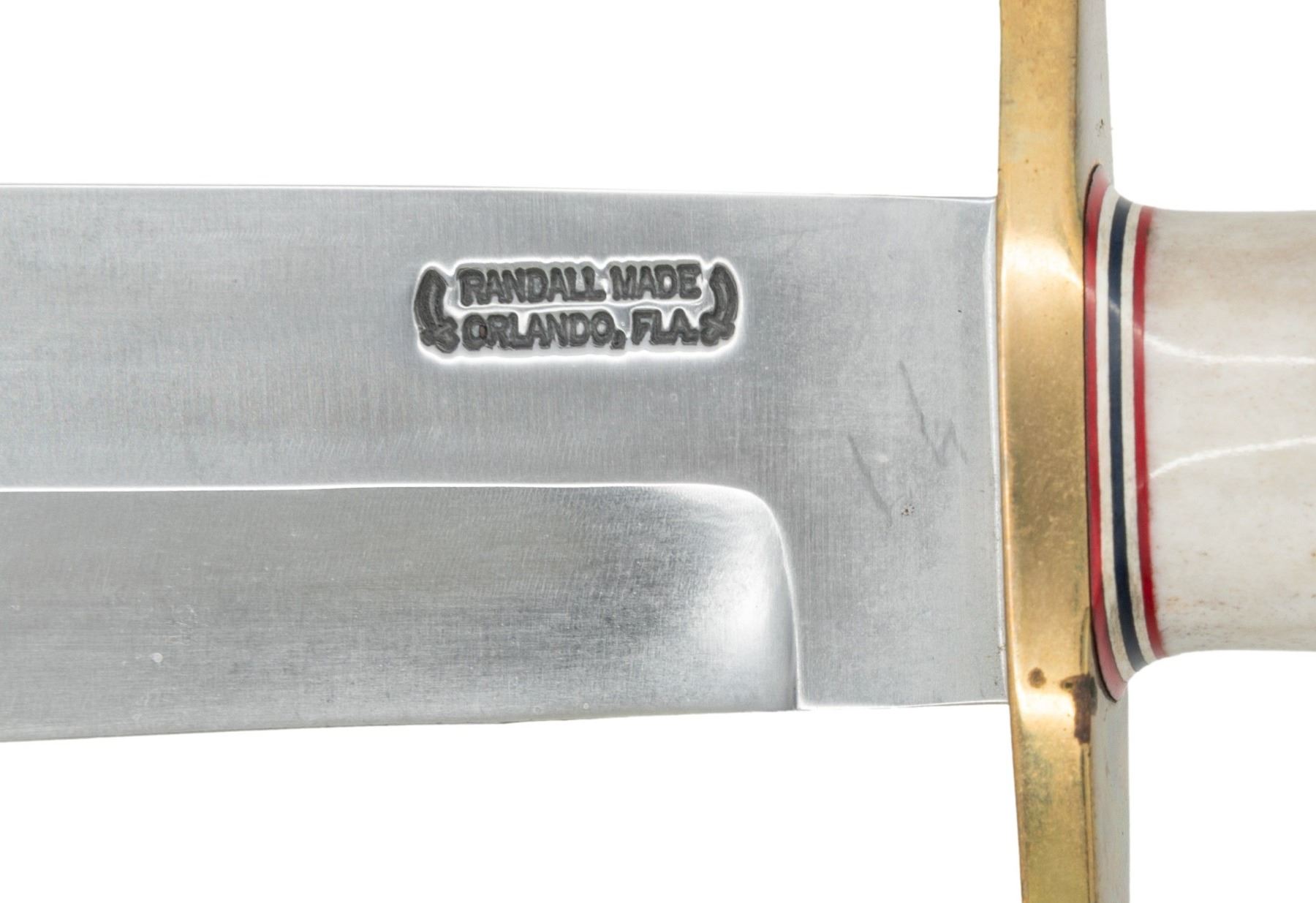 9" blade with 13 1/4" OAL. Blade marked "RANDALL MADE/ORLANDO, FLA". White stag grip handles. Brass grip cap & crossguard. 12-9 marked Randall leather scabbard with stone. CONDITION: blade shows some small oxidation spots & staining. Brass parts show some flaking with tarnishing. Stag handles show light handling wear. Leather scabbard shows some scuffing, crazing & light flaking. (02-25156/MJC). NON-GUN. $800-1,200.