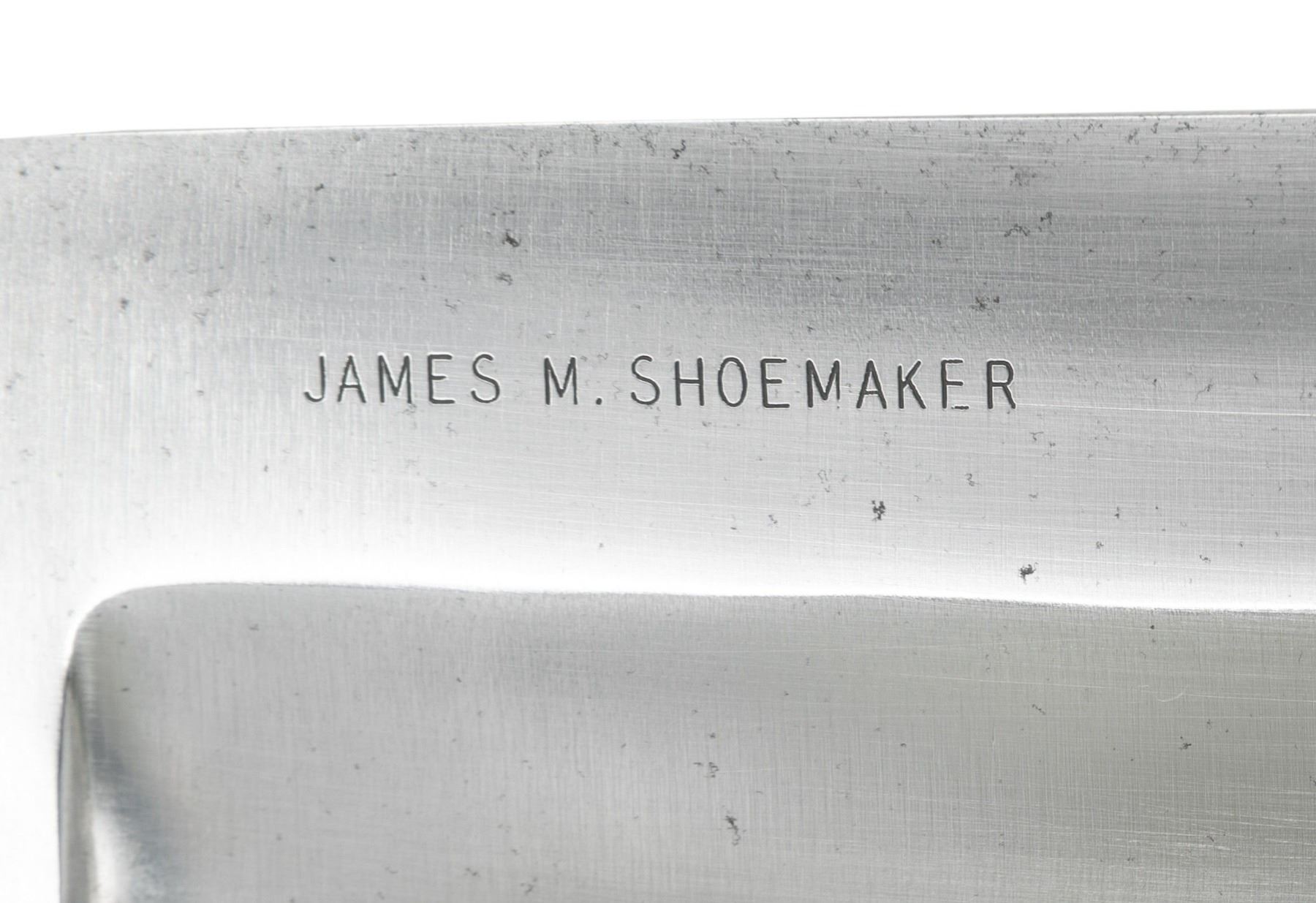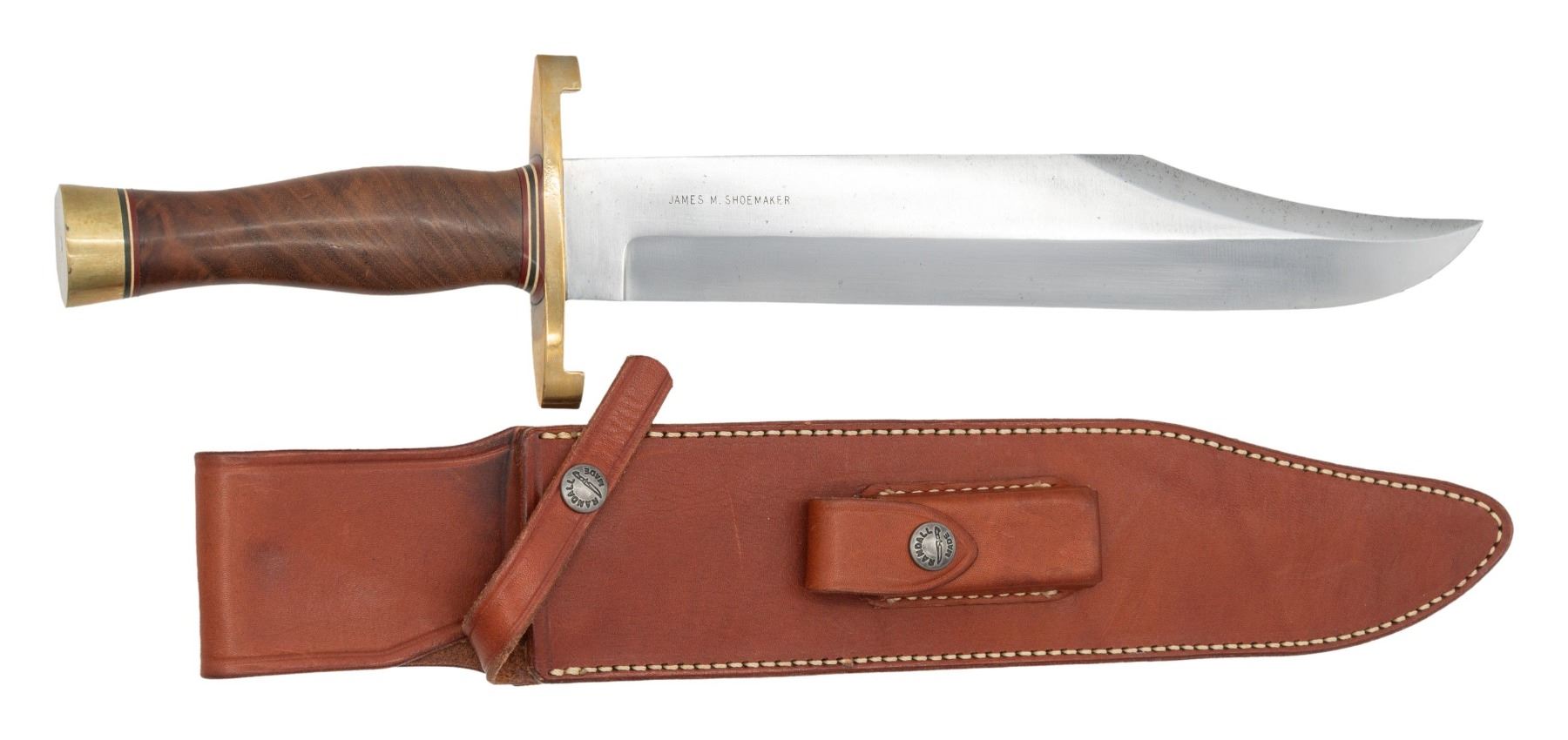 11" blade with 16 1/4" OAL. Blade marked "RANDALL MADE/ORLANDO, FLA". Opposite side of blade has "JAMES M SHOEMAKER" marking. Brass crossguard & pommel. Hardwood handles. Leather scabbard marked "12-11c" with sharpening stone. CONDITION: blade shows some scattered light oxidation stain spots. Brass parts show some light oxidation & tarnishing. Wooden grip shows light handling marks. Scabbard shows some light scuffing, crazing & usage marks. (02-25159/MJC). NON-GUN. $800-1,200.