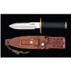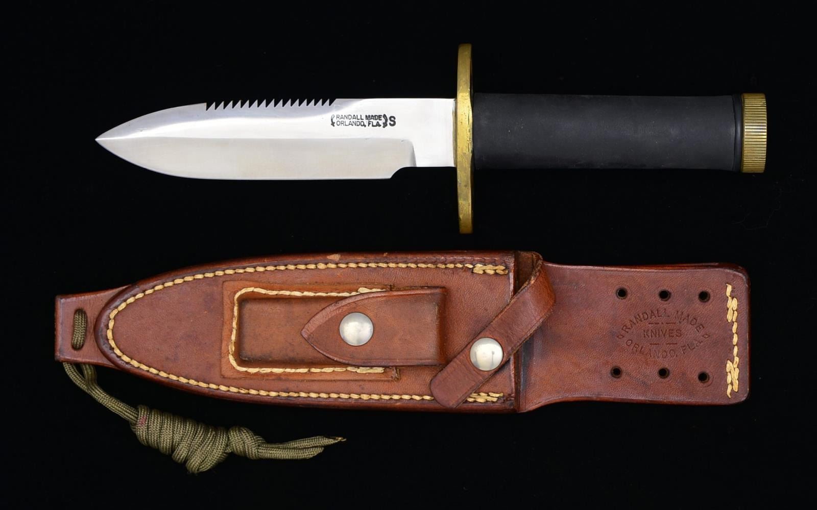 Knife is 10 1/2" OA. Spear point blade w/ sawtooth edge on top; blade marked "RANDALL MADE ORLANDO FLA. S". Neoprene covered steel tubular handle; straight brass cross guard w/ holes at tips; 30 brass butt cap w/ water proof O ring. Cap contains internal compass, survival items including: fish hooks, lines & matches. Heavy brown leather sheath; sheath marked "RANDALL MADE KNIVES ORLANDO FLA." w/ sharpening stone & unmarked snaps. Tip has paracord thong. CONDITION: very good blade; cross guard has spots of oxidation; neoprene handle in very good condition; brass cap has slightly worn appearance. Sheath has tight stitching & good serviceable appearance w/ light wear & staining. PROVENANCE: Collection of Alan Bradley Shepherd. (02-14668/RW). $400-600.