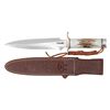 12 1/2" overall length with 8" blade marked "RANDALL MADE/ORLANDO, FLA". Silver plated brass hilt. Stag grips. Duralumin butt with leather thong. Leather 2-8 Randall scabbard with sharpening stone. Sharpening stone pouch is lighter in color than scabbard but has Randall button. CONDITION: metal parts of knife show light usage wear & some minor flaking on hilt. Handles show light handling wear. Scabbard shows slight flaking & scuffing. (02-25160/MJC). NON-GUN. $500-800.