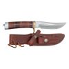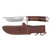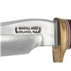 5" blade with "RANDALL MADE/ORLANDO, FLA" with two scimitars marking. 9 3/4" OAL. Brass crossguard. Leather wrapped handles. Pommel nut. Leather 3 5 scabbard & stone. CONDITION: knife rates very good with small oxidation specks. Scabbard shows scuffing & light usage wear. (02-25166/MJC). NON-GUN. $400-600.
