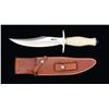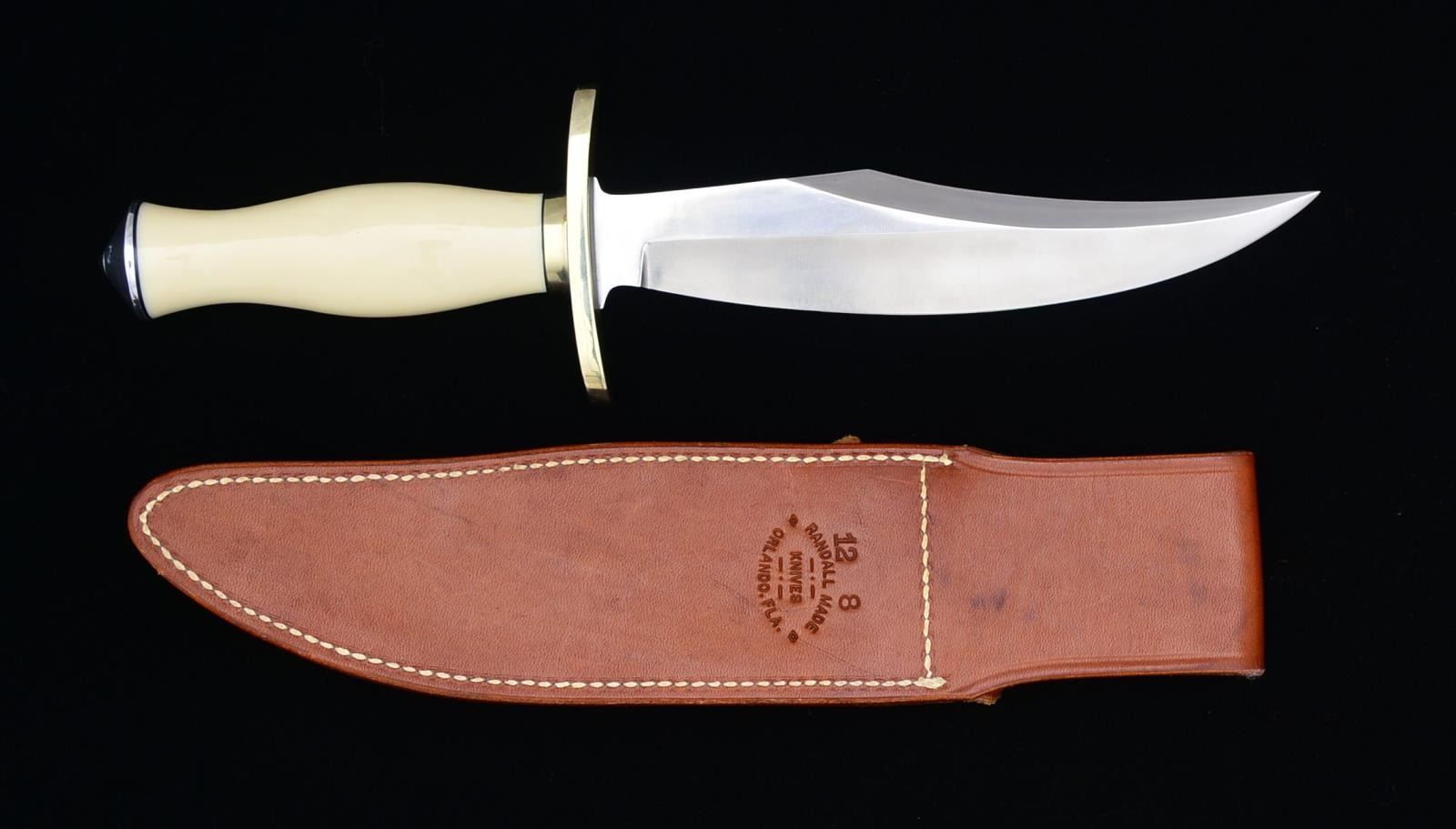 GRIP, SCALLOPED BUTT CAP BEAR BOWIE. 8" Blade, 13 1/4" overall. Blade marked “RANDALL MADE / ORLANDO FLA.”, “S”, & “A/I”. Dbl. brass hilt. UNATTACHED ACCESSORIES: brown leather sheath w/ sharpening stone. Sheath is marked on back “RANDALL MADE KNIVES / ORLANDO FLA.”, “12”, & “8”. Snaps are marked “RANDALL MADE” CONDITION: blade has very good shiny appearance. Hilt has very light high point wear & near excellent ivorite handle. Scabbard is in very good condition w/ light wear & scattered staining, along w/ 3 added punched holes in front side of belt loop. PROVENANCE: Collection of Alan Bradley Shepherd. (02-14661/RW). $600-900.