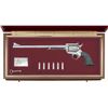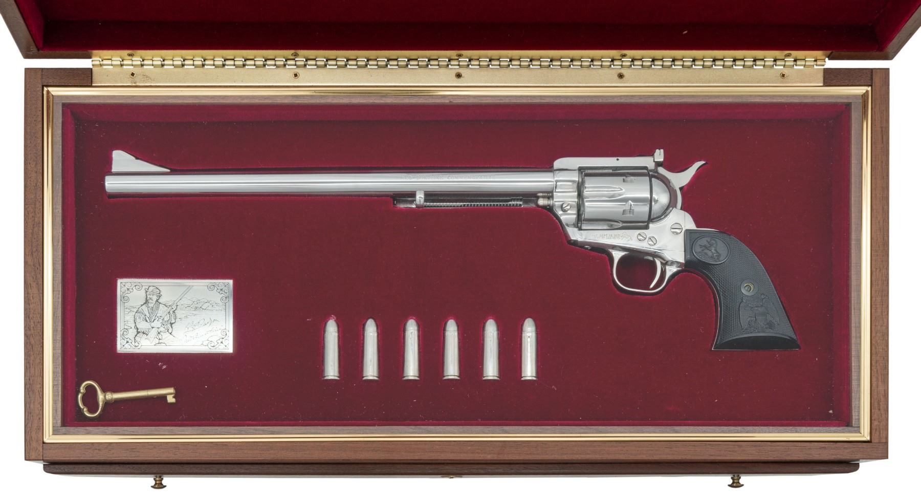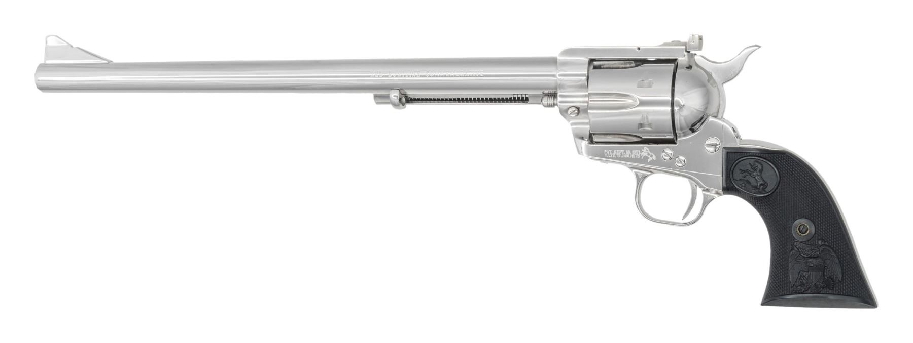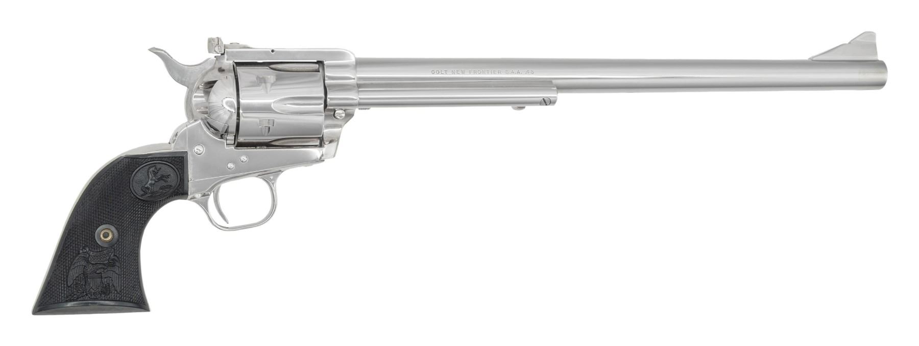 BUNTLINE COMMERORATIVE NEW FRONTIER SINGLE ACTION ARMY COMMEMORATIVE REVOLVER WITH DISPLAY CASE. Cal. 45 Colt. S# NB2611. Bbl. 12". 1 of only 3,000 New Frontier Single Action Army Ned Buntline commemorative revolvers mfg. by Colt circa. 1979. The left side of the bbl. is marked "NED BUNTLINE COMMEMORATIVE", with Colt's single line address marked across the top, and "COLT NEW FRONTIER S.A.A. .45" marked on the right. Left side of the frame is marked with Colt's 2-line patent information, followed by the Rampant Colt logo. Metal components exhibit a lustrous polished nickel plated finish. Frame is mounted with 2-piece Colt checkered black synthetic grips. High profile ramped blade front sight with adj. square notch rear sight on the flat top frame. Matching assembly # "3620" is present on the frame, cyl., and grip straps, and are also lightly etched on the interior of the grip panels. UNATTACHED ACCESSORIES: wood Abercombie & Fitch style presentation / display case, featuring a red felt French fitted lining and a plaque engraved with E.Z.C. Judson's and Ned Buntline's signatures. Case contains 6 nickel plated .45 Colt dummy cartridges, case key, and a page from November 1979 issue Arms Gazette featuring an advertisement of this revolver. CONDITION: near new, with metal components retaining virtually all of their bright original factory nickel plated finish overall. Cyl. bears no dragline. Mirror bore, retaining well defined rifling throughout. Action has not been checked due to hammer being zip tied, but is presumed to be fine. Grips are excellent overall. Case shows a few superficial marks from handling and storage, but otherwise remains very good overall. A rare and attractive Colt Ned Buntline commemorative New Frontier SAA. PROVENANCE: The Esteemed Norm Greenberg Collection. (25-4169/MLW). MODERN. $1,200-1,800.