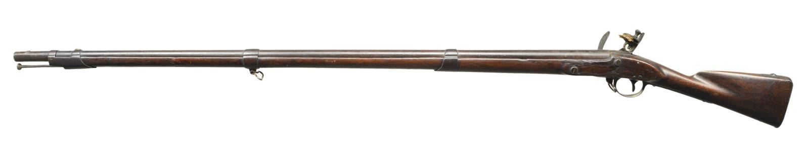 BAYONET. Cal. 70. NSN. Standard configuration of type II model 1795 (made 1806-1809), 59.25” overall, 44.5” barrel proofed on left “eaglehead / P” & small “SNY” on top. Pointed tail lock dated 1808, forward of cock: script “US” over eagle & “SPRINGFIELD in arc. Battery with flat cock with heart shaped cutout, removable round bottom iron pan, frizzen face with medial ridge & straight tail, frizzen spring terminates in triangular finial. Walnut stocked with 3 spring retained bands, buttplate dated “1808”. Bayonet has 14” thin fullered blade stamped “US”. Less than 6000 muskets were made in 1808. CONDITION: good to very good overall, sling swivels are later additions. Metal is smooth iron patina, sharp markings. Stock is sound with hand worn patina, no discernible inspection marks. Lock functions fine, smooth dark bore. Bayonet fits musket well with “C” proof near lug marked “G”. (01-22770/JS). ANTIQUE. $2,500-3,500.