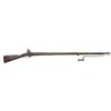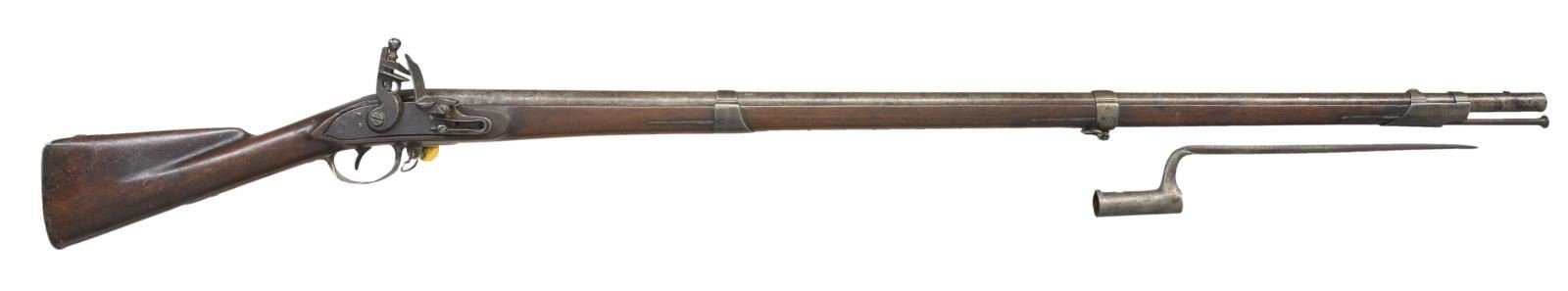 & BAYONET. Cal. 69. NSN. Standard configuration of type III model 1795 (made 1809-1814), 59.5” overall, 44.5” barrel stamped top of breech “US” & proofed on left “P / eaglehead / V”. There is also later deep punched cartouche. Pointed tail lock dated 1812, script “US” over eagle & “SPRINGFIELD in arc. Original correct battery with flat cock with heart shaped cutout, integral round bottom pan, faceted frizzen face with medial ridge & straight tail, frizzen spring terminates in triangular finial. High comb walnut stocked with 3 spring retained bands, buttplate dated “1812” on top. Final inspection proof of intertwined script “US” opposite lock. “JS” inspection initials rear of triggerguard. Bayonet has 12.5” shortened blade inspected with early “U.S”. Only 10,000 muskets were made in 1812; few survive in original flint with no later armory modifications. CONDITION: very good overall, original flint, ramrod is reproduction and slings later additions. Metal has mottled iron patina, sharp markings other than eagle on lock weak. Stock is sound with hand worn patina, discernible inspection marks. Lock missing mainspring, but other components have same tiny proofs as battery. Smooth dark bore. Bayonet fits musket well with “M” proof near lug marked “H”. (01-22766/JS). ANTIQUE. $2,000-3,000.