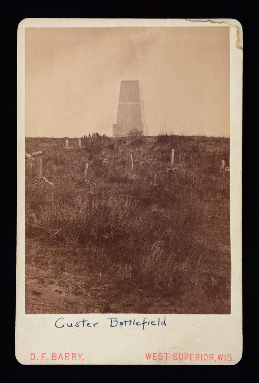 MONUMENT ON "LAST STAND HILL" SHOWING SOME ORIGINAL GRAVE MARKERS OF "CUSTER CLAN" WHO MOSTLY DIED CLOSE TOGETHER, 1882. Last Stand Hill where George Custer fell, photo was taken in 1882, same year that the large 7th Cavalry Monument was placed on the mass grave of the soldiers. CONDITION: Fair to good overall, good contrast, toned, soiled, stained in upper right corner. PROVENANCE: Martin Lane Historic & Western Americana Lifetime Collection. (02-21899/JS). $300-500.