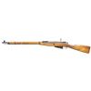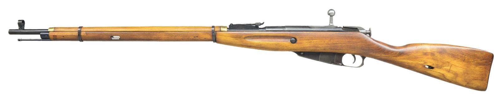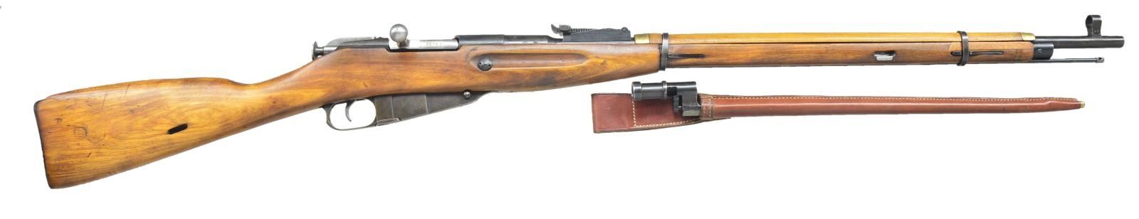 RIFLE. Cal 7.62x54r. S #PS9059. 29" Bbl. import marked on left side. Bolt and floorplate are crudely renumbered matching, buttplate is mismatched. Top of Bbl. has Tula star, 1941 date S # with importer translated prefix and Finnish "D" marking. Left of Bbl. has Finnish boxed "S.A." marking. 1941 Tula rifles are very hard to find, as Tula was focused on SVT-40 and Maxim production that year. However some Tula barrels were assembled at the Izhevsk plant that year and it is probable this rifle was one of them. Straight bolt handle. Rear sight graduated to 2000 meters. Protected globe front sight. Cleaning rod is present. Wartime sling slots without metal inserts. Hardwood stock with faint Izhevsk roundel. UNATTACHED ACCESSORIES: 91/30 spike bayonet and leather scabbard. Bayonet is numbered "2471". CONDITION: sanded hardwood stock has an armorer patch repair on both sides of the front and some scattered handling marks. Bolt was cleaned long ago with a grind mark area where numbers were restamped. Blued surfaces retain 70% original blue with perhaps some touched-up areas, scattered fading and some silvering on buttplate. Good shiny bore with some minor pitting. (22-2333/MJC). CURIO. $100-200.