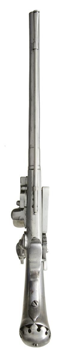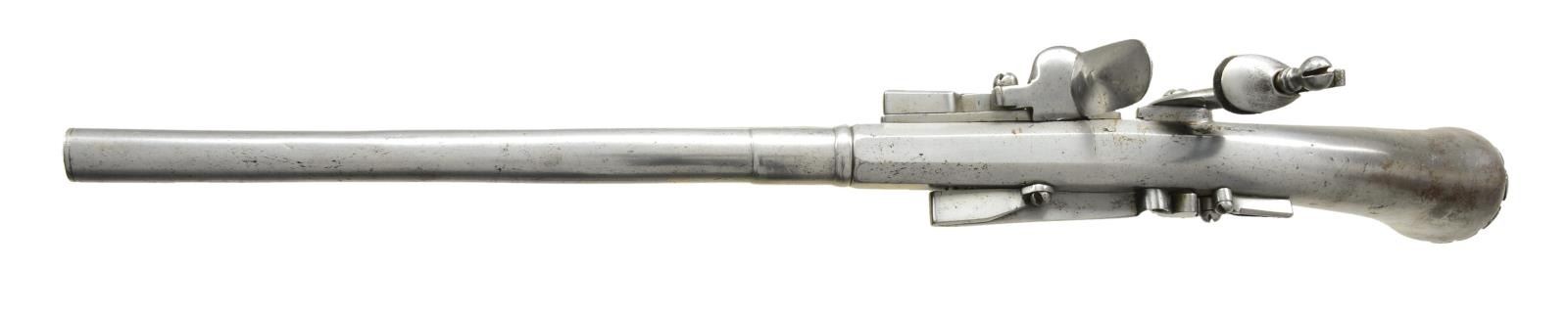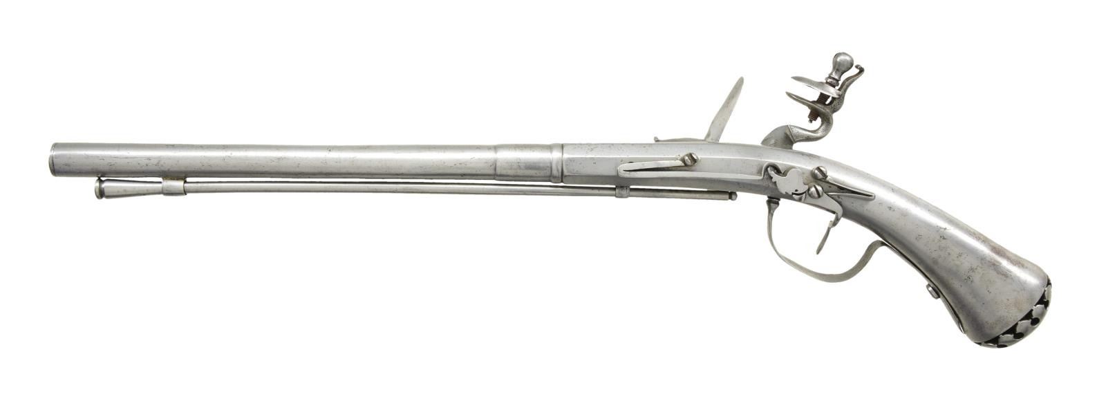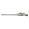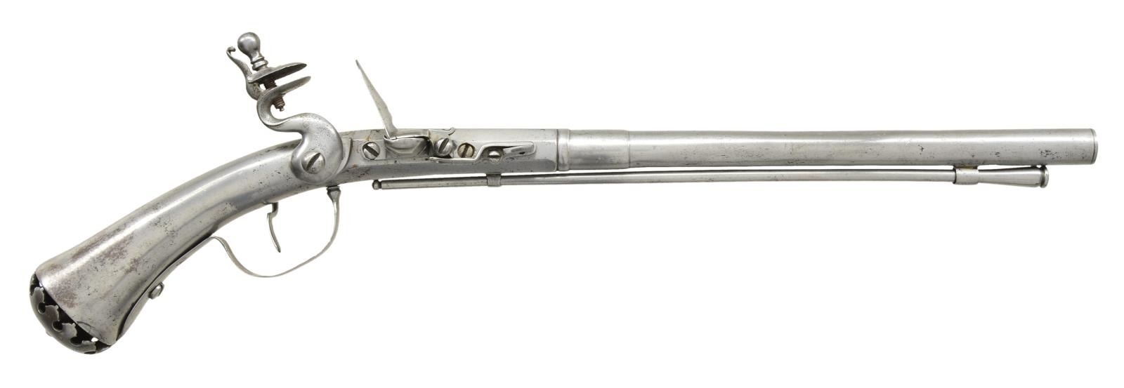 OF DUTCH/GERMAN CLOETER FAMILY. Cal. 54. NSN. 17.5”overall, oct. to round 3 stage 11” barrel with wedding ring transition. Hollow forged receiver with battery on right side and main spring external on left which is unique to Jan Cloeter (active 1660-1680) and his other family members. Jan worked in Dusseldorf, and other family in Mannheim & Maastricht. This pistol does have 4 cartouches observed on bottom of frame which are only partly discerned, domed butt cap with cutout border design, 2 ramrod pipes and tapered trumpet headed ramrod. Cloeter family firearms are unique and desirable arms, found in museums worldwide. CONDITION: appears complete and original, functional action, and clear bore rusted at breech. PROVENANCE: Robert Amalric collection, sold by Christies, London May 23, 2006. (01-21848/JS). ANTIQUE. $3,000-4,000.