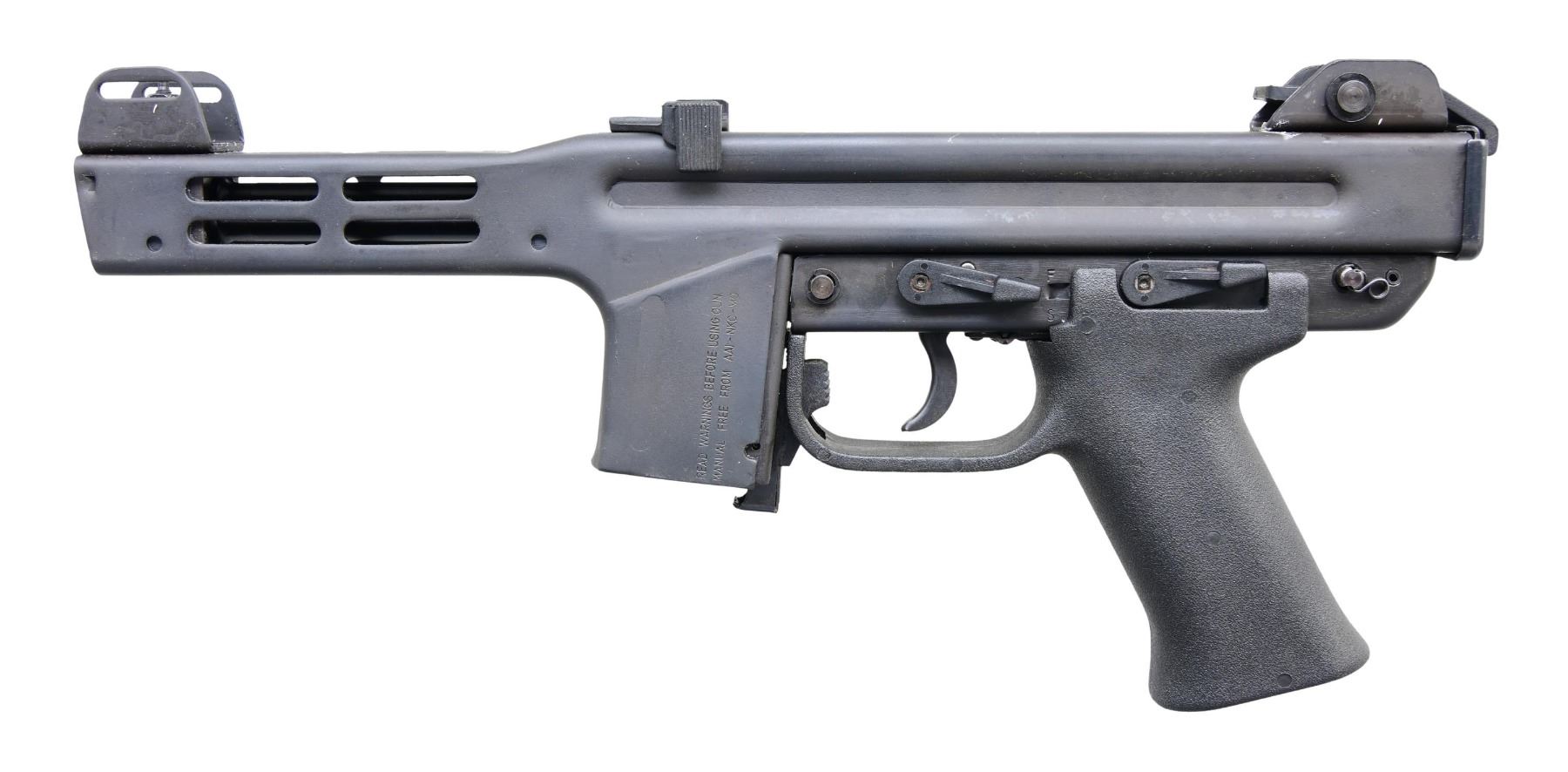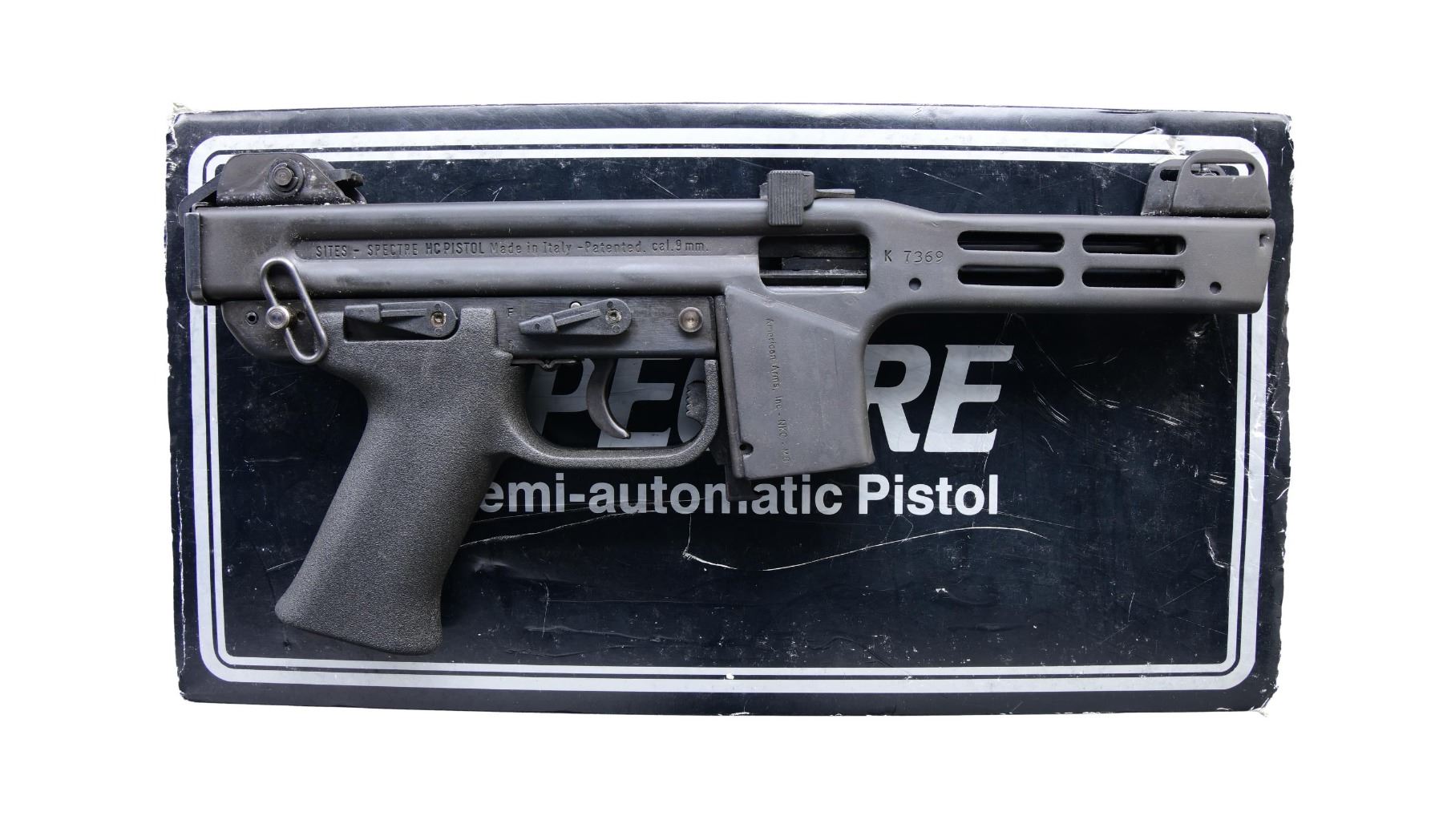 Cal. 9mm. S# K7369. Bbl. 5.5" Italian Spectre HC Pistol chambered in 9mm with a unique "triple-action" firing mechanism. More resembling a submachine gun than a traditional pistol, the Spectre features a steel receiver w/ a plastic trigger pack. It utilizes a square receiver that extends into a ventilated barrel shroud. All controls are ambidextrous. Protected post front sight w/ small notch rear sight. Non reciprocating, top mounted charging handle. Right side, rear mounted sling swivel. Ambidextrous safety / selector & decocker. Right side ejection port below charging handle & above mag-well. Magazine release located inside trigger guard. MAGS: 1 steel 30 rd. UNATTACHED ACCESSORIES: Factory box, mag loader, & paperwork. CONDITION: All aspects indicate very little use, if any. Finish is complete & consistent w/ only very light thinning in areas of mechanical intervention. Bright bore w/ strong rifling. Fire control mechanism appears to function correctly when cycled by hand. PROVENANCE: Lifelong Collection of Terrence McCarty. (24-160/JZ). MODERN. $900-1,200.