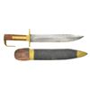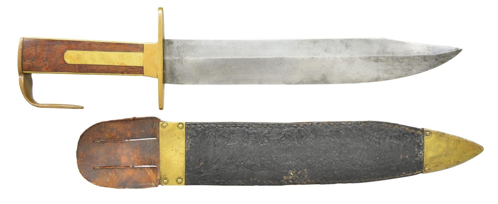 ORIGINAL SHEATH. 14.5”overall, 9.75” clip point slightly upswept blade, unique to Hicks. Grip is made by encasing walnut slabs with brass side pieces each attached with 6 iron screws, the heavier gauge brass pommel with turned sculpted 2” turned down hook is attached with 2 larger iron screws. Stamped in 3 lines in wood "A.G. HICKS / MAKER / CLEVELAND, O". The original and unique design sheath is 3-layered tarred leather sewn at edges with pinned & soldered 3-piece brass tip and pinned brass reinforcement at throat, integral belt loop. Once thought to be Mexican war era rifleman's knives as speculated by Berkeley Lewis in his 1956 “Small Arms & Ammunition in the United States Service”, later reinforced by Harold Peterson in his 1958 “American Knives”, these knives are now known to have been made no earlier than 1856. Mark Zalesky wrote wonderfully researched article in November 2015 “Knife Magazine” “The A.G. Hicks “Rifleman’s Knife” A Sixty Year Old Mystery Finally Solved”. The most interesting part of the article Is a quote from the Cleveland Plain Dealer July 18, 1861 telling of confiscation of trunk with 102 of these knives, “A Walking Arsenal” was title in newspaper. The confiscated trunk was sent to Governor Morton of Indiana. Another news article referring to these knives “He said he expected to find a ready sale for his knives among the Indiana volunteers. It is suspected that he designed taking them South.” of the approximately 20 known survivors, one is inscribed to a “Louisiana Tiger” captured at Manassas. There are several images of Union soldiers with Hicks Bowies, so they did get around. Hicks died in 1866 at age of 59. A lifetime maker of planes and other cutting tools, he also made some of the most desired of all American Civil War Bowies and this is the best survivor of them all. CONDITION: Fine overall, grey blade with staining, pinprick pitting. Sheath is sound, complete, brass mounts cleaned & varnished en suite to brass mounted grip, minor cosmetic scratches, and dents unaffecting the overall aesthetic. PROVENANCE: ex-Ray Bentley collection, Josh Phillips collection. (02-19365/JS). $10,000-15,000.