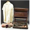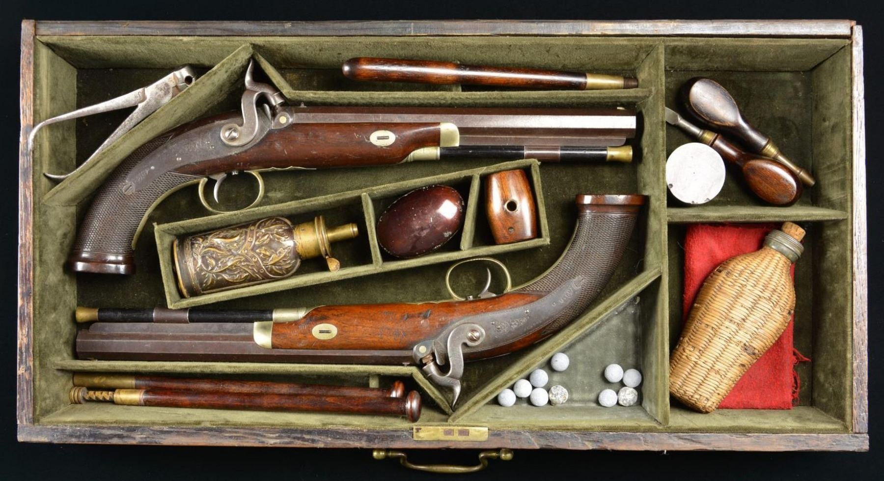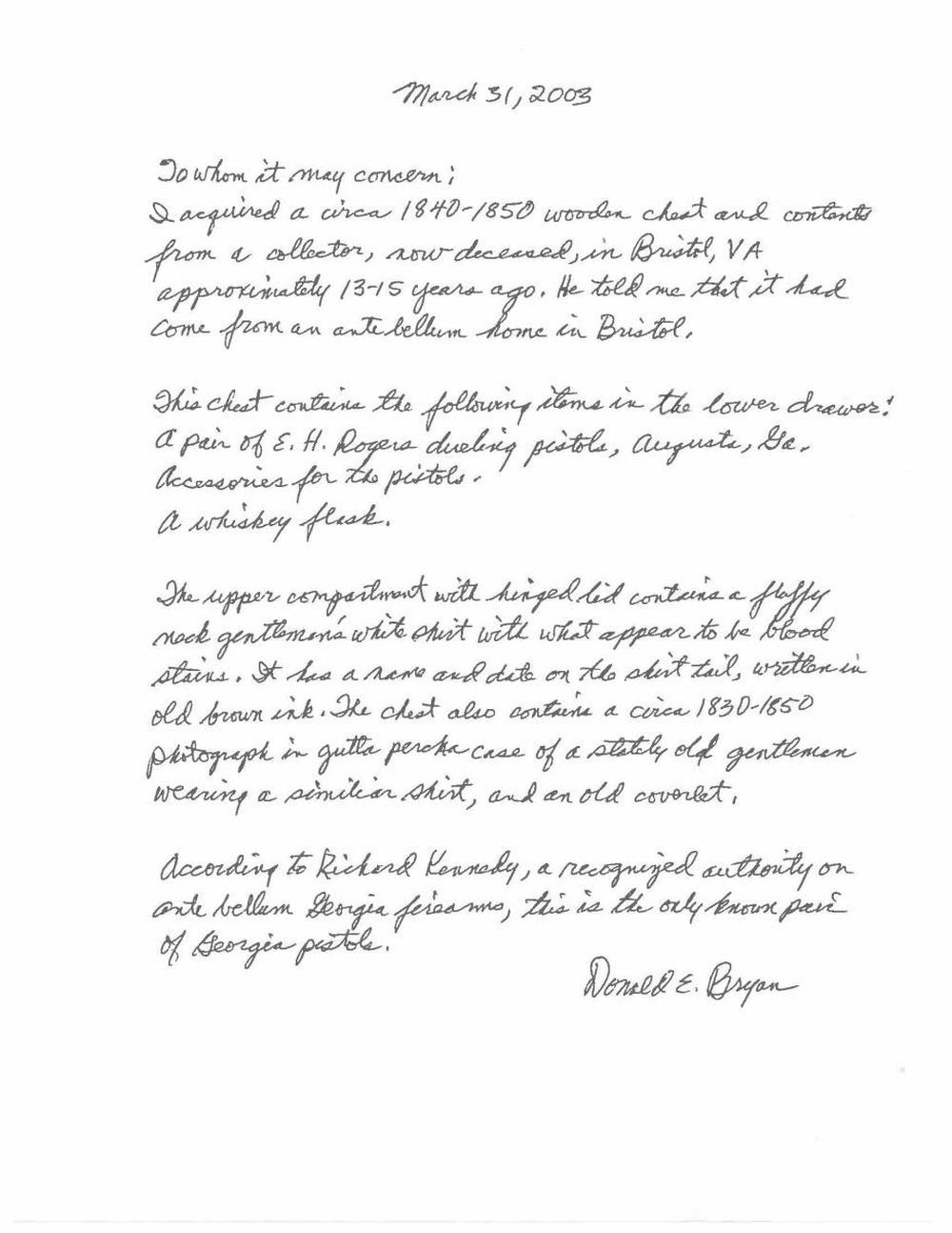 16” overall, 10” octagonal barrels engraved on top flat “E H ROGERS AUGUSTA, GEO”. Back action lock engraved “E H ROGERS”. Bottom of barrels are English proofed and stamped “E. Smith”. Locks, hammers, and breeches scroll & edge engraved, German silver mounted, checkered walnut grips, brass tipped ebony ramrods. Not only is this the only pair of Rogers pistols known, they are the only known pair of antebellum Georgia pistols known according to accompanying letter from the late GA firearm authority Dick Kennedy who wrote the earliest monographs on antebellum Georgia gun manufacture. Pistols are housed in bottom drawer of old Southern dovetailed constructed oak & maple chest measuring 24” x 12” x 12”. Pistols are “cased” in 11.5” x 23” x 2.75” drawer compartmentalized, and green baize lined just like any other pistol case of the era. Compartments contain two-piece wood mallet, brass & wood loading tool, brass & wood cleaning tool, screwdriver, nipple wrench, balls, enameled tin of caps, decorated 3 cavity powder flask, cylindrical horn lubricant container, and improvised wicker covered glass flask for powder. The hinged top reveals a fluffy neck white shirt with what appears to be blood stains according to the late well known collector Don Bryan’s letter, the shirt has old ink inscription written in old brown ink “Sam’l Fales No. 8 ’46 of unknown meaning, wrapped in shirt is quarter plate tintype of unknown gentleman wearing similar shirt, along with frayed earthtone coverlet. This is among the most interesting pistol casing you will ever see. UNATTACHED ACCESSORIES: Several letters of provenance. CONDITION: pistols are matching and very good overall, pistol accessories are also very good. The small chest has dark patina, both brass bale handles complete and functionable, back edge of drawer is replaced. There is 12” high stand with wheels apparently added at later date which has been stained to match and has loose joint but easily repaired or removed. PROVENANCE: Bristol Virginia Estate, Don Bryan Collection, Lee Pollock collection, John Montague collection. (01-22820/JS). $8,000-12,000.