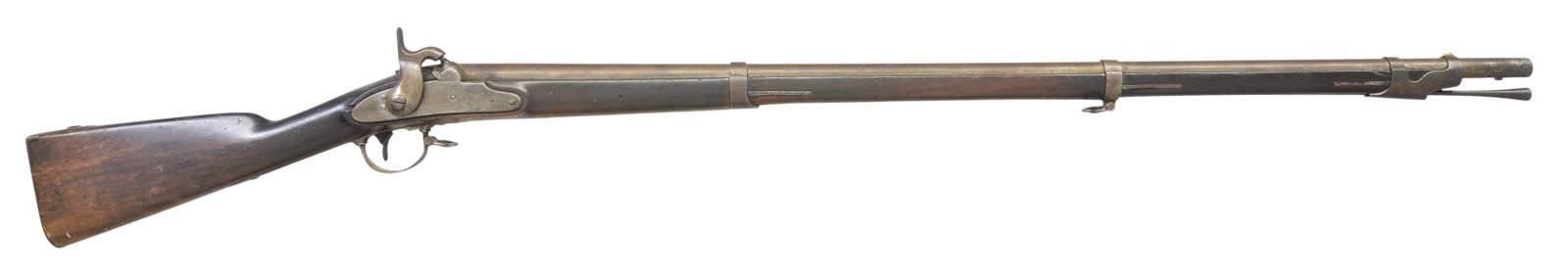 Cal. 69. NSN. Asa Waters made Model 1842 percussion muskets from mostly surplus and condemned national armory parts. He sold this musket most likely to South Carolina. He was paid for 640 muskets November 1853. This musket conforms to the pattern 1842, 57.5" overall, 42" smoothbore barrel proofed with VP/eaglehead and “B” inspector on left breech. Lockplate is a reconfigured from Model 1840 flintlock. Is undated and simply marked in two lines vertically on the tail "A.H.WATERS & Co." / "MILBURY MASS". UNATTACHED ACCESSORIES: 1999 John Ewing article on these name Waters contract muskets. CONDITION: good to very good overall, complete and original, good mechanics, dark smooth bore. Well fit stock, stamped “DD” opposite lock. (01-23107/JS). ANTIQUE. $1,000-2,000.