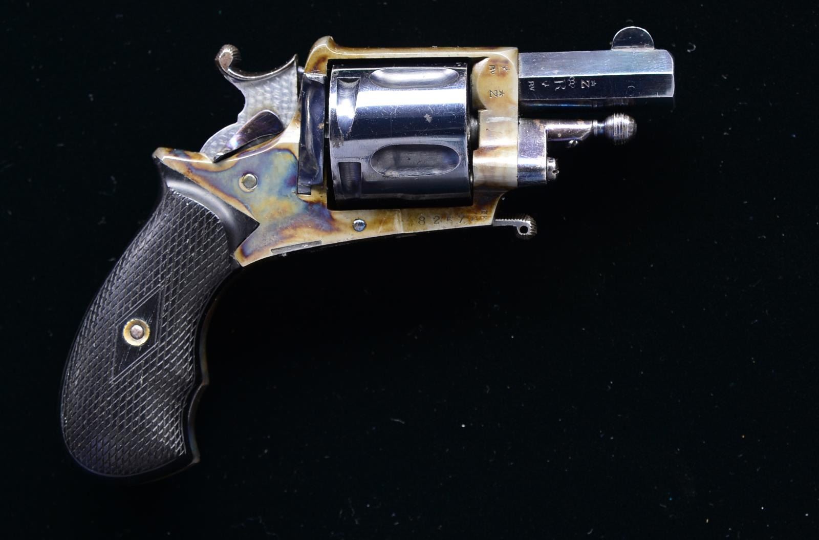 REVOLVER. Cal. 7.65mm. S# 8257. Bbl. 1 1/2". Salt blued bbl & cyl. Nitre blued trigger, hammer, safety bar, & small parts. Case hardened receiver. Checkered two piece walnut diamond grips. Belgian proofed. "BROWNING" on top strap. Jeweled hammer. Hammer safety. CONDITION: overall very good attractive appearance w/ only minor handling parts & strong finish. Rear gripstrap does have fading case coloring w/ fine freckled pinprick oxidation. Very good rifling. Grips are very nice w/ only a small amount of wear & very minor handling marks. A very nice example that would be very hard to find in better condition. (20-3892/ZAL). CURIO. $400-600.