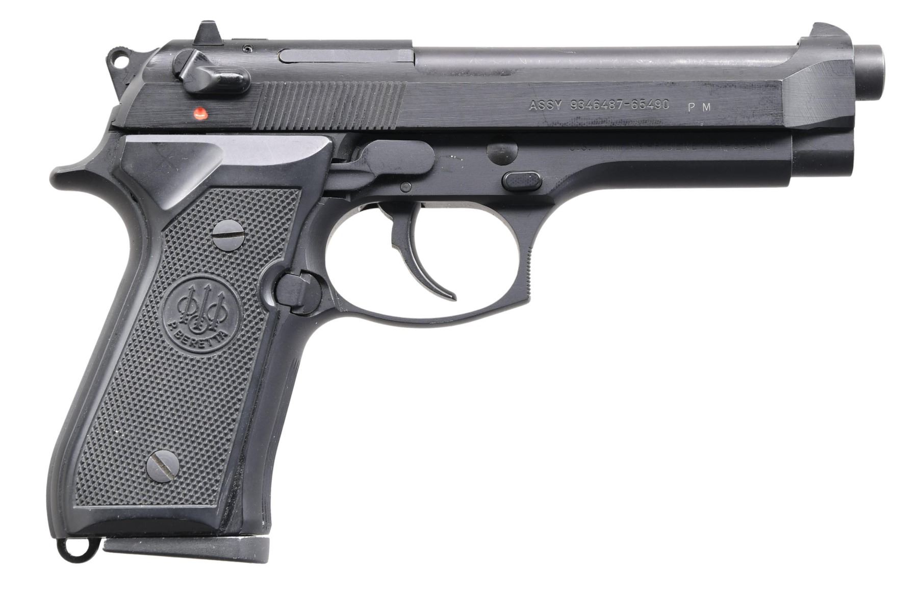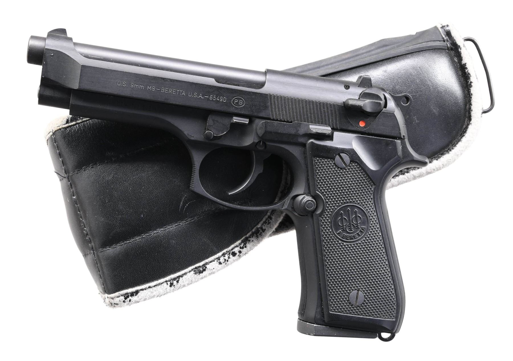 Cal. 9mm Luger. S# GO-00881. Bbl. 5". White dot front sight. Square notch rear sight with white line. Original US military-issued M9 Beretta General Officer's pistol. While Beretta 92 pistols are common on the civilian market, genuine military-issued examples, such as this, are very scarce. The "GO" prefix denotes the right side of the slide has a government "PM" acceptance stamp ahead of the assembly number. Ambi safety that also acts as a decocker. Black parkerized finish. Checkered black grips with Beretta logo. MAGS: one 15 rd., marked "PB CAL. 9 PARA MADE IN ITALY". UNATTACHED ACCESSORIES: Bianchi G100 General Officer's holster, in fair condition, with notable wear around the edges. CONDITION: grips show light handling marks. Metal retains 95-97% original finish, with some light edge and handling wear. Action functions properly when handcycled. Bright, near excellent bore. (24-2407/MJC). MODERN. $4,000-6,500.