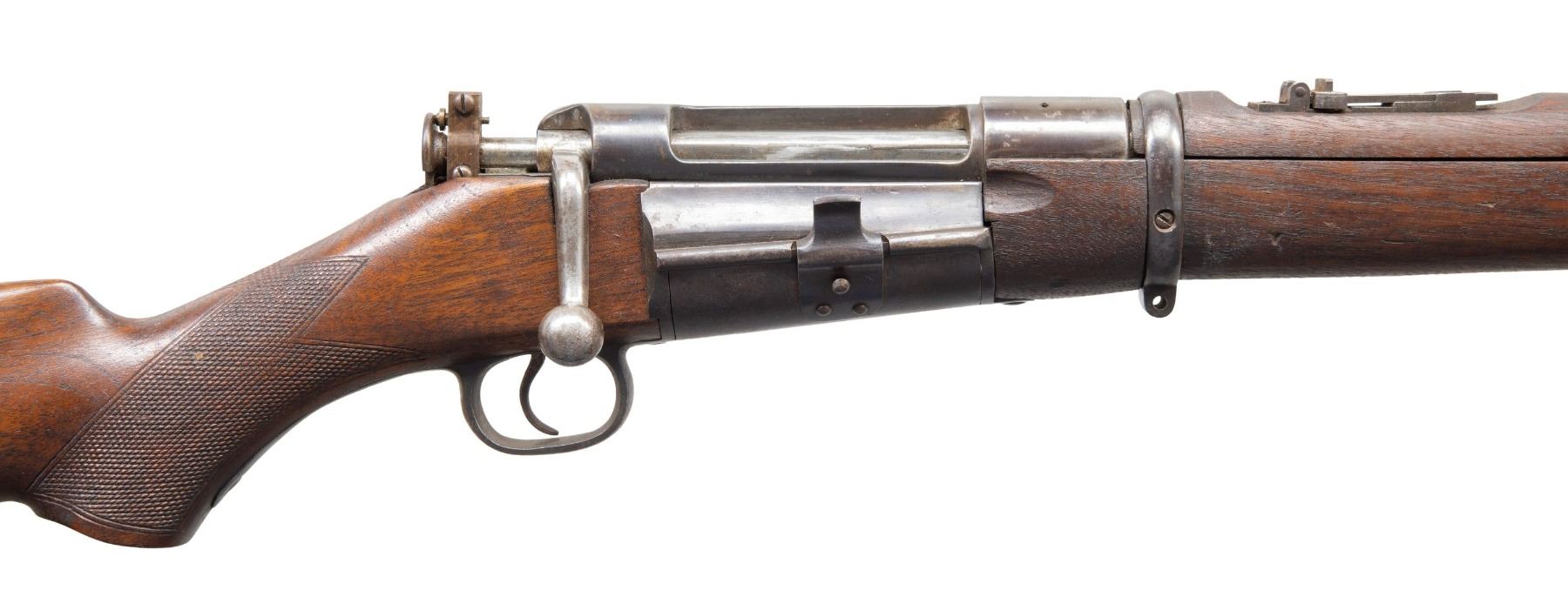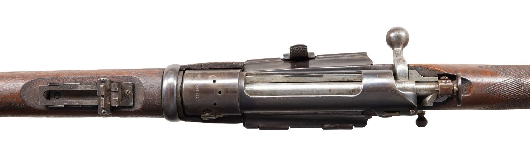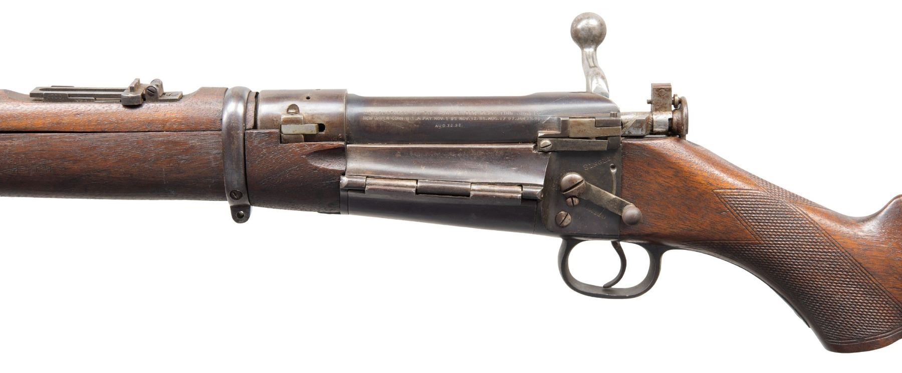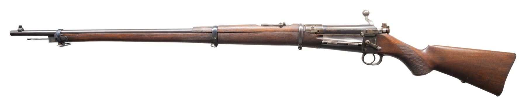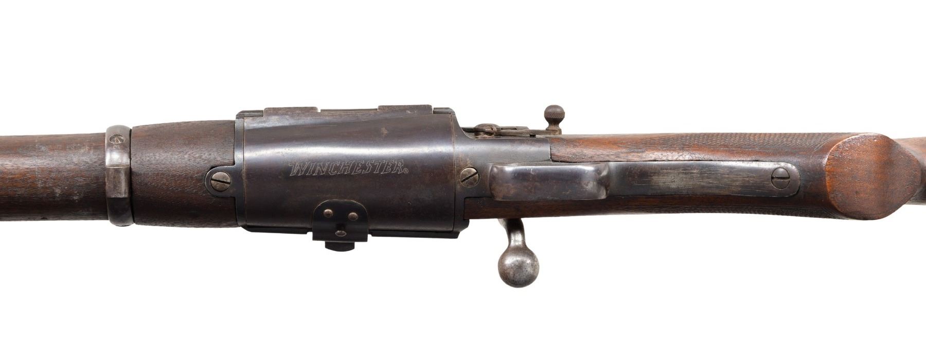 WINCHESTER MARKED HOOK GUARD BAYO. Cal. 30 Army (30-40 Krag). S# 246.These rare bolt action rifles were design by John H Blake. They were submitted in the US Army rifle trials in 1893 and later in the 1895 Navy rifle trials losing out the bid to be adopted by the US military. The unique rotary magazine is detachable and allows for speedy reloads. After the failed trials he attempted to sell his rifles on the civilian market. This example has a 30" bbl with a dovetailed high bead front sight. Military wind gauge rear sight. The receiver has added markings which appear hand engraved "Manufactured by the Winchester Repeating Arms Co. / New Haven Conn. U.S.A. Pat. Nov. 5 95 Nov. 12. 95. Aug. 17 97. Jan 25. 98 / Aug 23 98". The breech ring has an added hand engraved "30 US". A hand engraved "Winchester" has been added to the bottom of the magazine well. Left of receiver has a magazine selector "Single" over "Rapid". Mounted with a 2-pc walnut stock set with short handguard fastened with 3 bands. The butt terminates with a serrated semi crescent buttplate. UNATTACHED ACCESSORIES: Winchester Repeating Arms marked bayonet with hooked guard. CONDITION: overall fair. Bbl and receiver finish has faded with approx 40% of the finish remaining with the balance turning to a brown patina. Replacement front band. Sanded and refinished stock set with scattered handling marks and scratches. Bore has distinct rifling with some areas of pitting. (25-1355/ZAL). CURIO. $1,000-2,000.