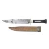 11.5" overall, 7.5" clip point blade, "MANUFACTURED / R. BUNTING / SHEFFIELD" stamped on ricasso and "W. GREAVES & SONS" lengthwise. 2" sculpted German silver cross guard, German silver trimmed handle with pinned Rosewood slab grip. This is a good survivor of the iconic "dog bone" bowie. Accompanied by well patinaed vintage brass sheath. CONDITION: good to very good overall, blade is overall grey with staining, pitting, and old sharpening, makers marks are mostly discerned. Accompanying sheath missing frog stud fits loosely. (02-23094/JS). NON-GUN. $2,500-3,500.