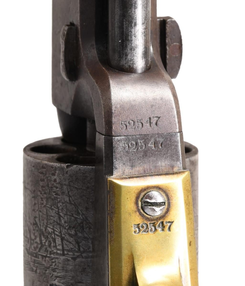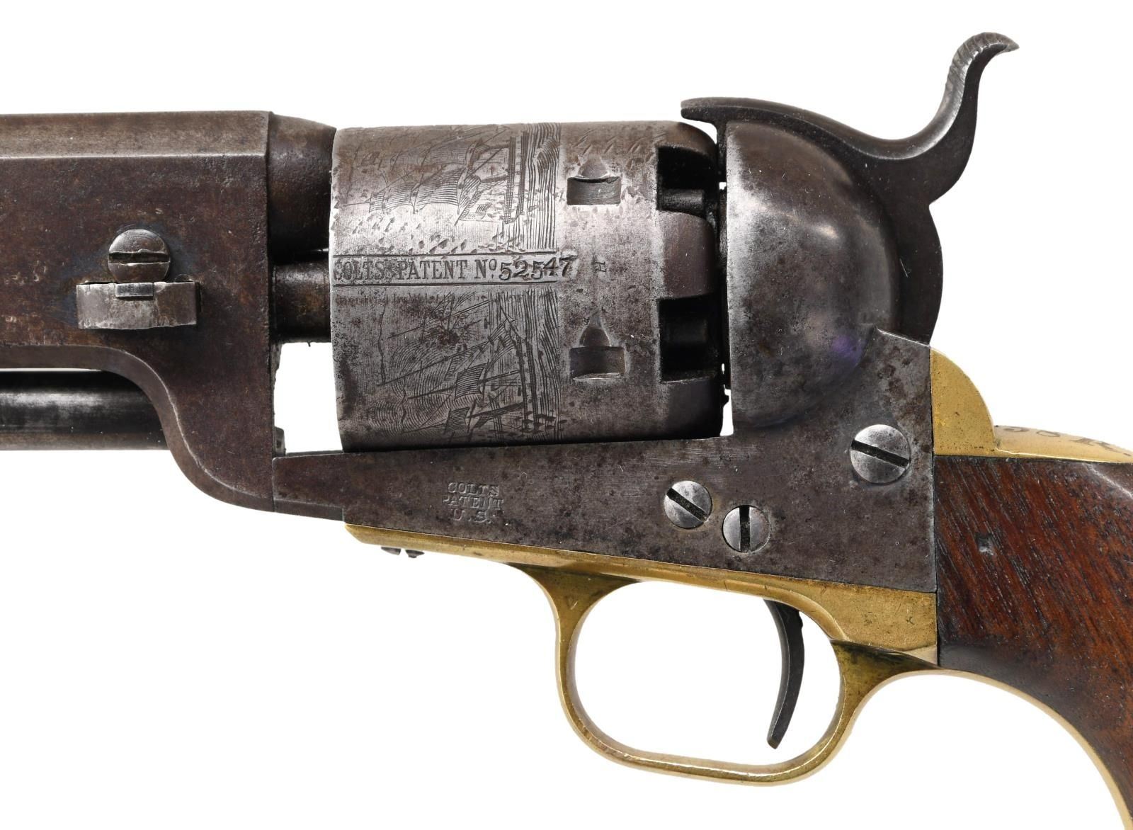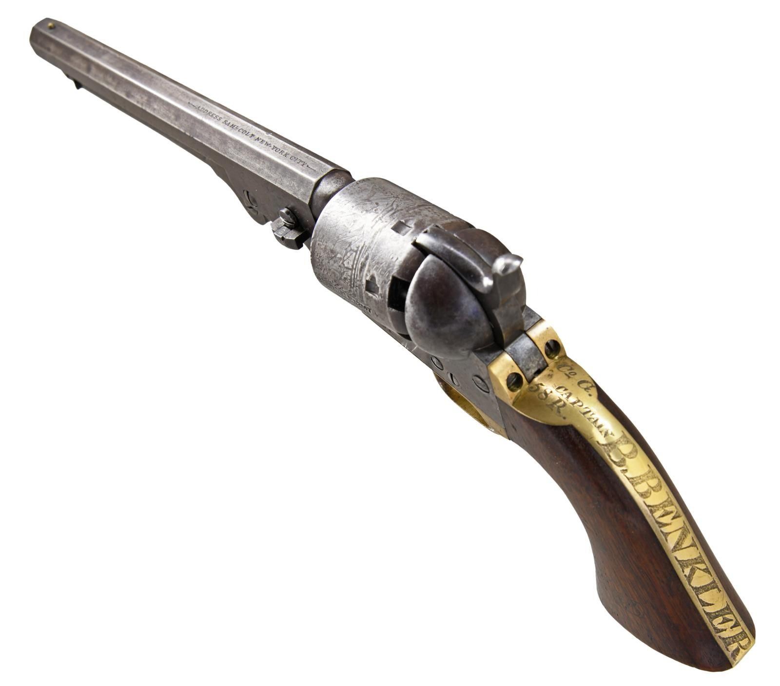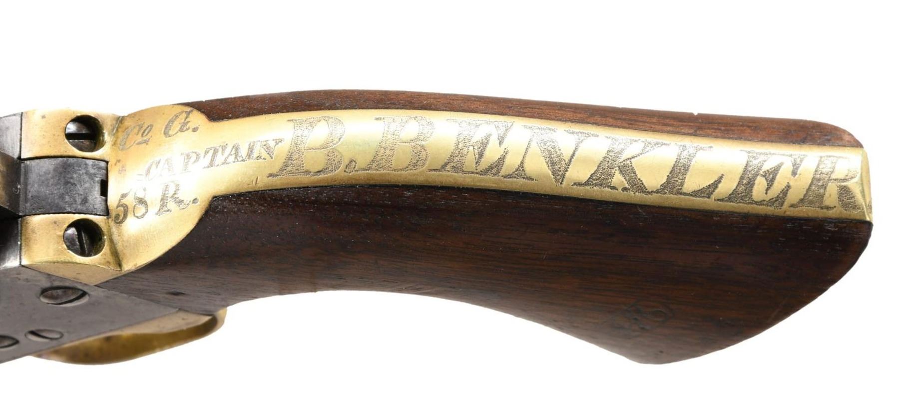 COLT 1851 NAVY REVOLVER, CAPT. BAPTIST BENKLER, 58TH OHIO. Cal. 36. S# 52547. Standard configuration M-1851 navy, 7.5" octagonal barrel, 1-line New York address. "COLTS / PATENT / U.S." stamped on left side of the frame. Grips with inspector cartouches, and small inspection initials on some parts. One of the most unusual wartime inscriptions you will find Was made with hundreds if not thousands of small punches with a hand tool. "CAPTAIN B. BENKLER, CO. G. / 58 R." fill virtually all of the surface area up the back strap. "O.V.U.A." is inscribed identically on the butt. Revolver is housed in an original walnut Colt casing with dark green lining and compartments for the revolver, angled spout "COLT PATENT" Navy flask with panoply of arms, exceptional early brass "COLT PATENT" 2-cavity mold with inspected iron sprue cutter, along with some loose original bullets & cap tin. Also in casing is reproduction cartridge packs, and a functional key. Baptist B. Benkler (1822-1883) was born in Bavaria, he was naturalized US citizen in 1860 at Summit, OH. He served in several units during the war, entering service in 24th OVI as lieutenant in 1861, mustering out as captain in the 58th Ohio January 30, 1863. Amazingly he had further service enlisting as a private in the 178th Ohio, mustering out June 29 1865 at Charlotte NC. Benkler originally mustered into service with 1st lieutenant Jacob Haring in his company. There is a virtually identically inscribed revolver to him that belongs to the Ohio Historical Society in Columbus OH, in same serial range. There must have been an artist in his company who inscribed both revolvers. UNATTACHED ACCESSORIES: Small file of research, copies of partner pages from John Hamilton's 1963 text where pictured. CONDITION: fine overall, complete and all matching, revolver retains strong traces of original blue finish, overall smooth plum patina, fine cylinder scene, well fit oil finished grip with two very good inspector cartouches, mechanics are fine, crisp rifled bore. Casing is very good, green baize lining soiled and worn. The early rare Colt brass bullet mold is excellent and among the best you will find. The "Colt Patent" flask is good, heavily stained on reverse. PROVENANCE: John G. Hamilton collection; pictured in 1963 text "Colt’s History & Heroes"; James D. Julia Auctions, lot 1202, Oct. 5, 2004; Lifelong Collection of Robert "Mike" Bricker. (01-25067/JS). ANTIQUE. $4,000-6,000.