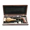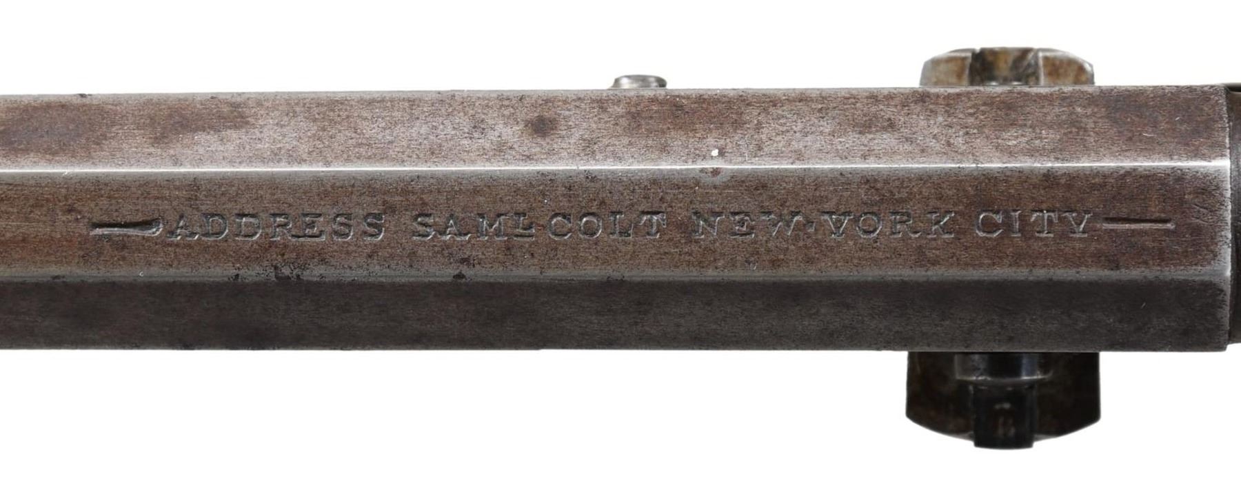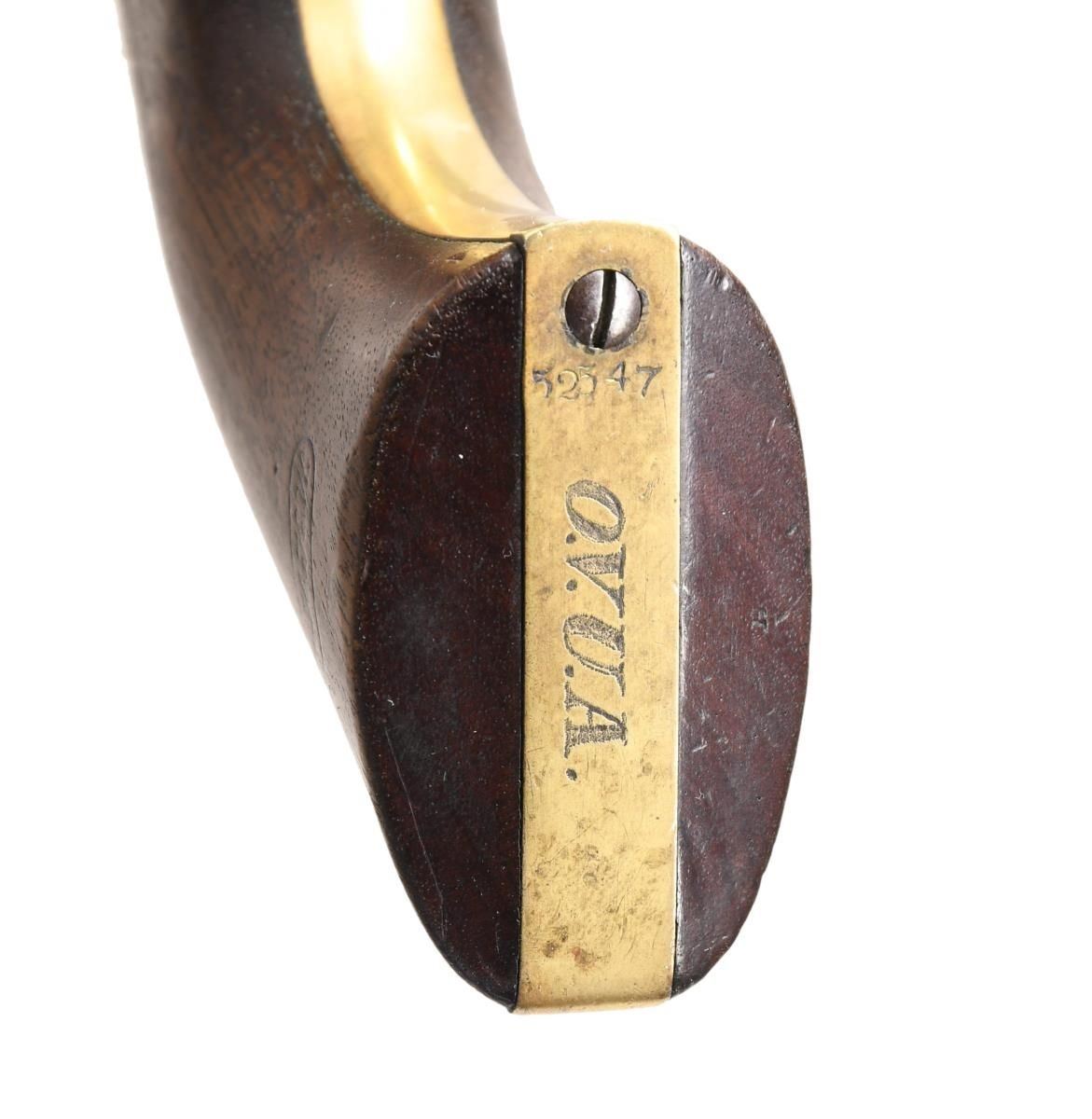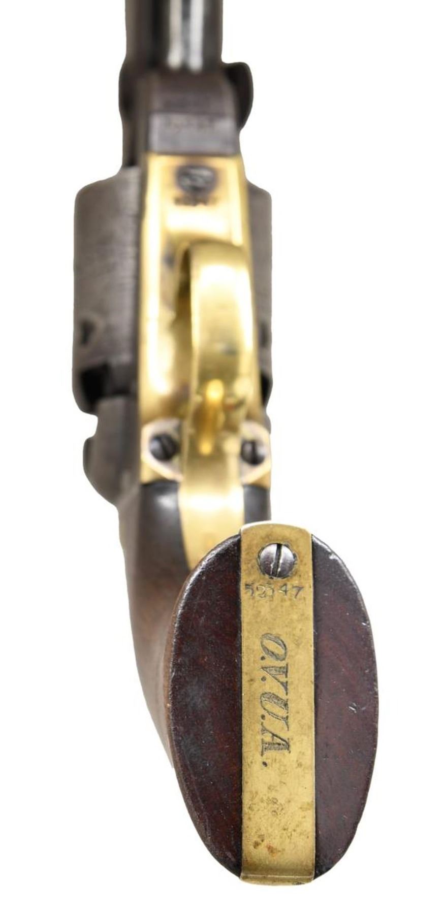 COLT 1851 NAVY REVOLVER, CAPT. BAPTIST BENKLER, 58TH OHIO. Cal. 36. S# 52547. Standard configuration M-1851 navy, 7.5" octagonal barrel, 1-line New York address. "COLTS / PATENT / U.S." stamped on left side of the frame. Grips with inspector cartouches, and small inspection initials on some parts. One of the most unusual wartime inscriptions you will find Was made with hundreds if not thousands of small punches with a hand tool. "CAPTAIN B. BENKLER, CO. G. / 58 R." fill virtually all of the surface area up the back strap. "O.V.U.A." is inscribed identically on the butt. Revolver is housed in an original walnut Colt casing with dark green lining and compartments for the revolver, angled spout "COLT PATENT" Navy flask with panoply of arms, exceptional early brass "COLT PATENT" 2-cavity mold with inspected iron sprue cutter, along with some loose original bullets & cap tin. Also in casing is reproduction cartridge packs, and a functional key. Baptist B. Benkler (1822-1883) was born in Bavaria, he was naturalized US citizen in 1860 at Summit, OH. He served in several units during the war, entering service in 24th OVI as lieutenant in 1861, mustering out as captain in the 58th Ohio January 30, 1863. Amazingly he had further service enlisting as a private in the 178th Ohio, mustering out June 29 1865 at Charlotte NC. Benkler originally mustered into service with 1st lieutenant Jacob Haring in his company. There is a virtually identically inscribed revolver to him that belongs to the Ohio Historical Society in Columbus OH, in same serial range. There must have been an artist in his company who inscribed both revolvers. UNATTACHED ACCESSORIES: Small file of research, copies of partner pages from John Hamilton's 1963 text where pictured. CONDITION: fine overall, complete and all matching, revolver retains strong traces of original blue finish, overall smooth plum patina, fine cylinder scene, well fit oil finished grip with two very good inspector cartouches, mechanics are fine, crisp rifled bore. Casing is very good, green baize lining soiled and worn. The early rare Colt brass bullet mold is excellent and among the best you will find. The "Colt Patent" flask is good, heavily stained on reverse. PROVENANCE: John G. Hamilton collection; pictured in 1963 text "Colt’s History & Heroes"; James D. Julia Auctions, lot 1202, Oct. 5, 2004; Lifelong Collection of Robert "Mike" Bricker. (01-25067/JS). ANTIQUE. $4,000-6,000.