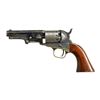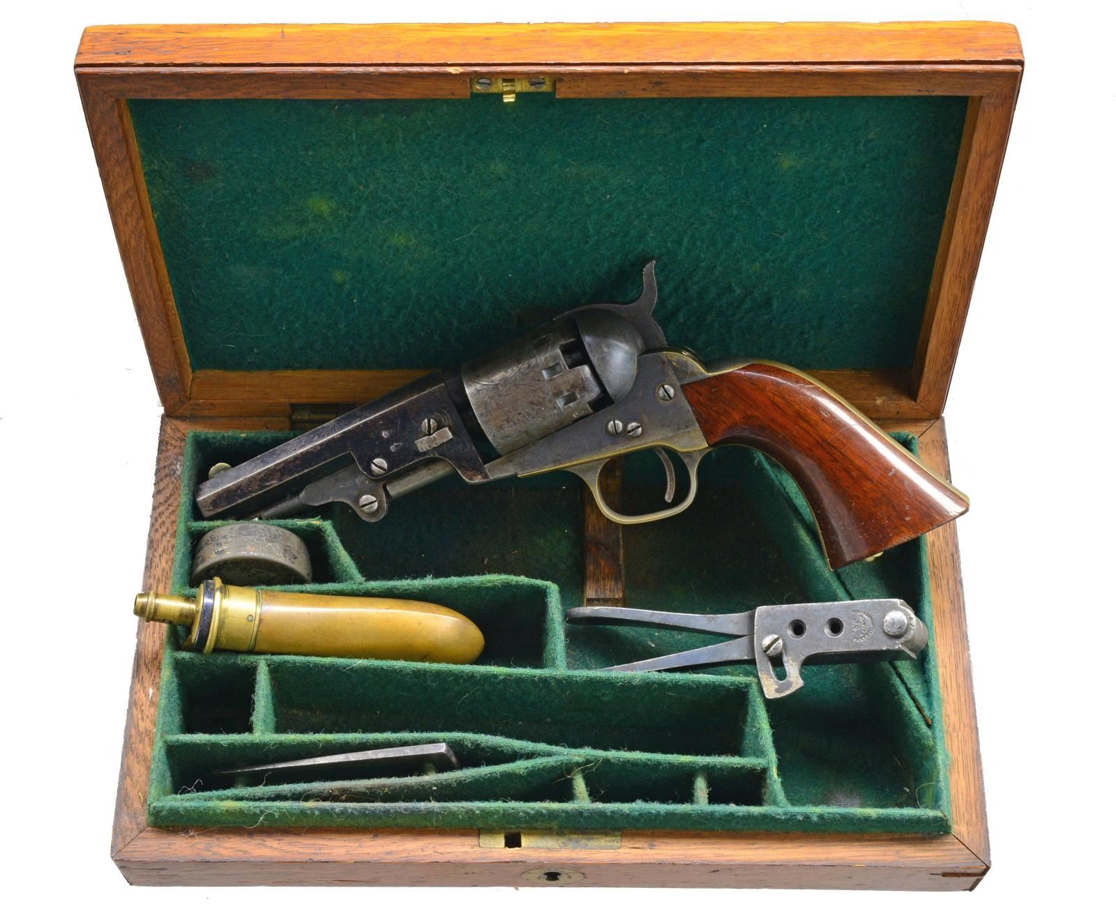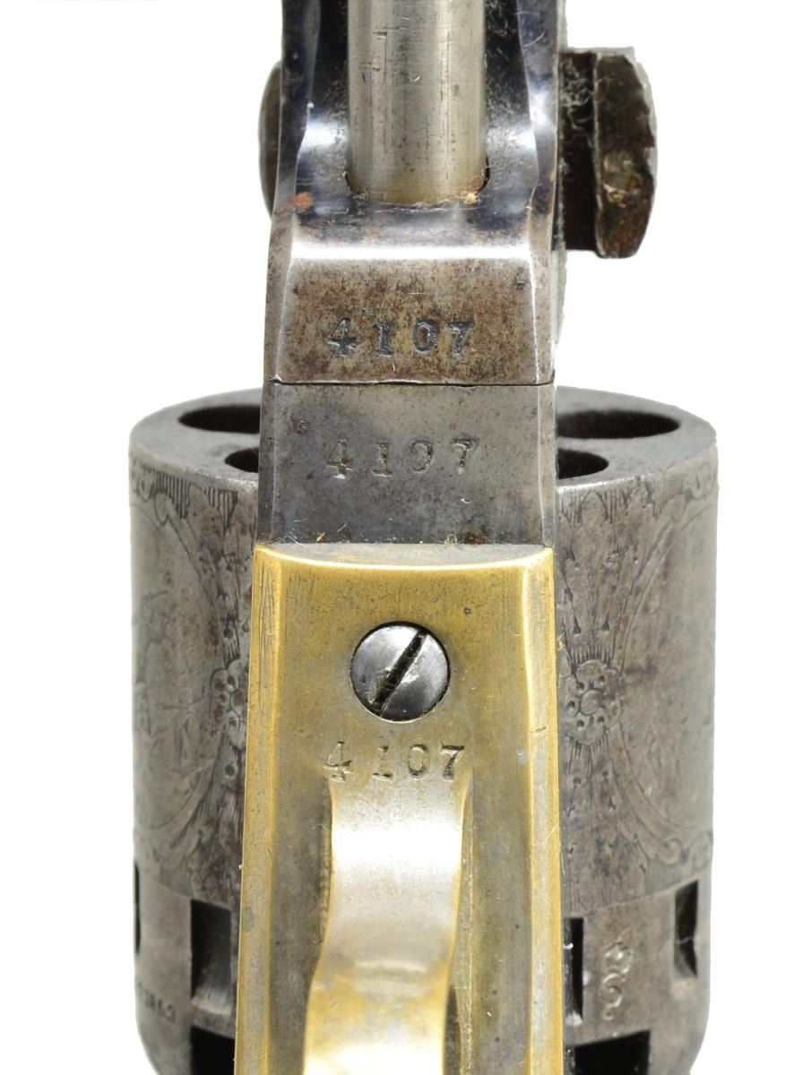 REVOLVER. Cal. 36. S# 4107. Bbl. 4" oct. marked on top flat: “MANHATTAN FIREARMS CO. NEW YORK”, small German silver blade front sight, left side of bbl. housing has British proofs as do each chamber of 6 shot cyl. w/ 12 stops of Manhattan’s design. Cyl. is roll engraved w/ 5 different panel scenes & “PATENTED DEC 27, 1859”. UNATTACHED ACCESSORIES: English agency cold style oak casing w/ green baize lining compartmentalized for mold, flask, cap tin, screwdriver. CONDITION: pistol overall is fine, all matching & complete, bbl. retains about 60% bright blue w/ scuffing & nicks around wedge slot. Cyl. has traces of finish, frame has dull muted dark case color. Grip frame retains about 20% silver plate. Grips retain over 90% original factory varnish w/ moderate edge wear, mechanically fine w/ crisp bright bore w/ light pitting near muzzle. Casing is good overall, lid slightly warped, lining soiled & worn. 2 Cavity mold has about 20% blue finish & marked “MANHATTAN FIREARMS / MANF / CO / NY”. Small Dixon bag flask has light mustard patina, Ely cap tin is good, “L” shaped combination nipple wrench screwdriver has traces of finish, overall gray w/ pitting. PROVENANCE: The Estate Collection of Gary Parietti. (01-19224/JS). ANTIQUE. $2,000-2,500.