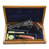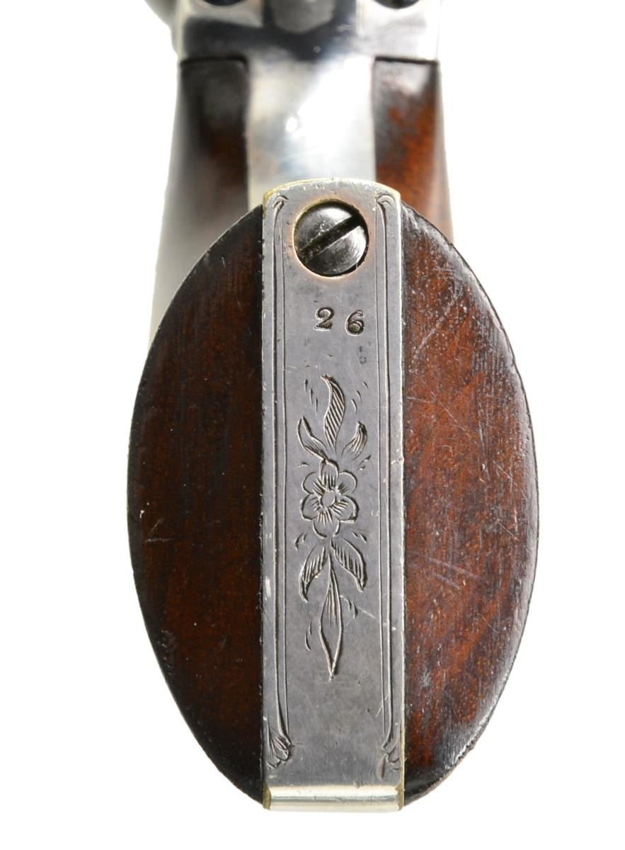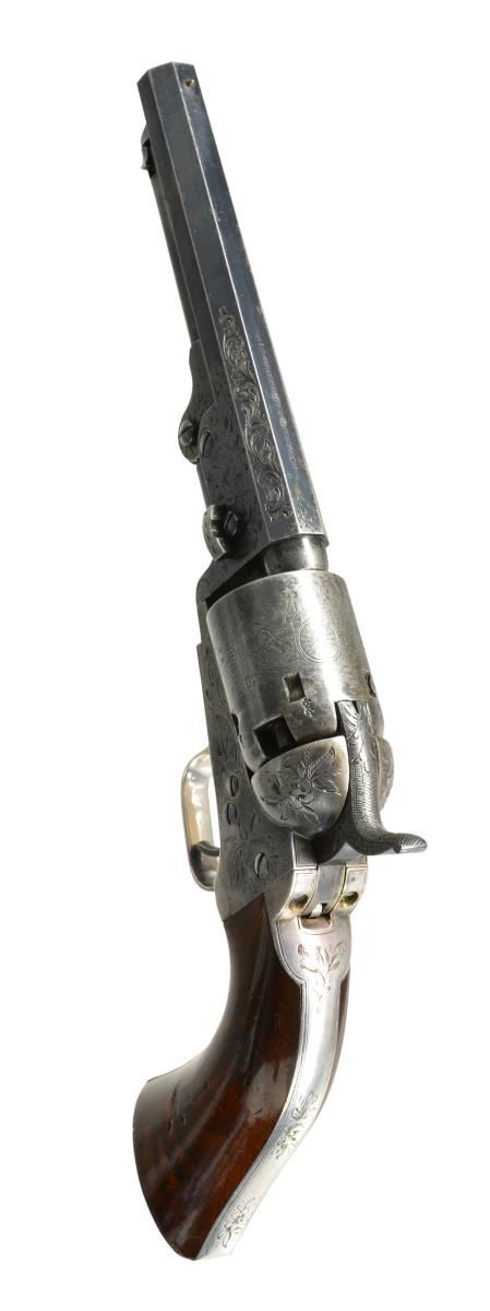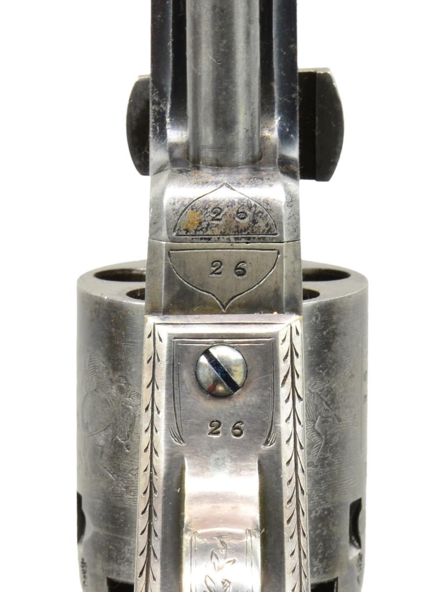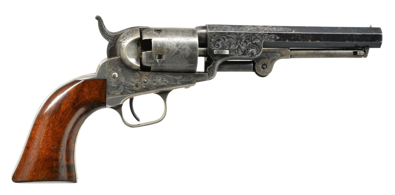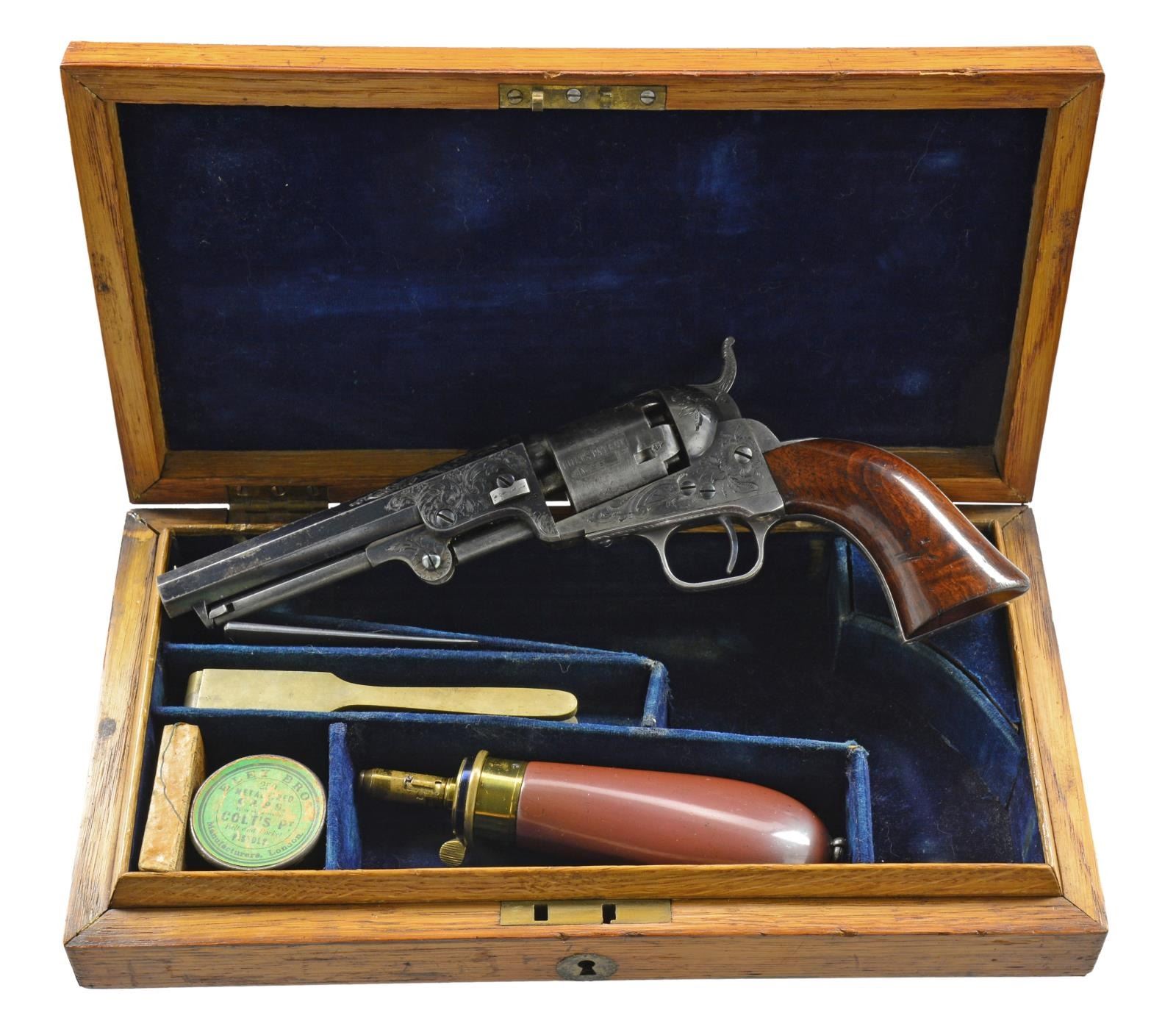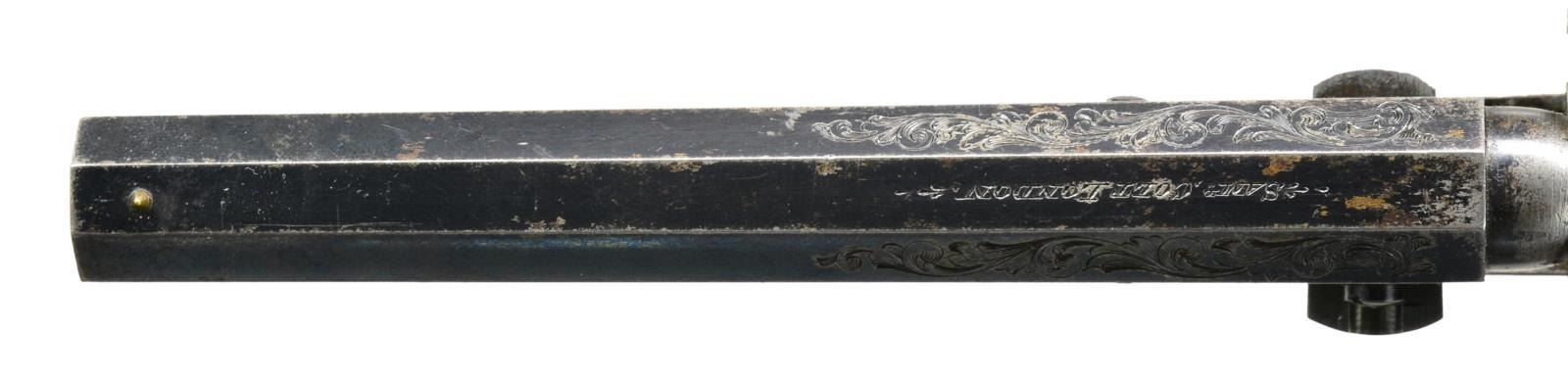 EXPOSITION, COLT LONDON POCKET MODEL PERCUSSION REVOLVER. Cal. 31. S# 26. Bbl. 5". This is a very rare & beautifully engraved Colt Model 1849 most likely made for the Dublin Exposition of 1853. The engraving style is unique w/ floral and rococo designs. The bbl. address is hand engraved in unique small lettering not seen on any other revolver. London proofs were added after engraving as the normal proof on right side of bbl. housing is found in unengraved area below wedge slot which is not noted on any other specimens. Deluxe grips are nicely burled w/ fine color. The casing also has unique carved mother of pearl flower shaped compartment knob not seen on any other specimen. Larry Wilson in his Colt Engraving text shows this gun & states there are 3 types of London engraving & cites this example as being the rarest, few examples & under 100 serial range on pocket models. Gun appears original, complete & authentic as manufactured though serial number on cylinder does not match balance of gun though still two digits “95”. There are other Colt exhibition guns known w/ unserialized cylinders, this gun possibly was rushed for the exposition & this was the cylinder available. Most likely this is the only Model 1849 w/ this style of engraving as made for the Dublin Exposition in 1853 & this 2 digit gun was first year produced in London. UNATTACHED ACCESSORIES: rare early London oak casing; has no provision for cleaning rod, & no mortise cut for bullet mold sprue cutter. Case contains near new Dixon bag flask w/ virtually all of its original varnish, a 2 cavity "COLTS PATENT" brass bullet mold, L-shaped combination gun tool, original pack of caps w/ Eley Brothers paper label & original 5 cartridge pack of Colt cartridges. Also included in this lot is a copy of “Fine Colts, The Dr. Joseph A. Murphy Collection”. CONDITION: extremely fine overall, all matching w/ exception of cylinder as noted. Bbl. retains about 95% bright blue finish w/ crisp markings. Cylinder has traces of thin blue w/ crisp, complete rolled “Stagecoach Holdup” scene w/ balance silver/blue patina. Frame & hammer retain most of their original muted case color w/ balance silver/gray. Trigger guard & backstrap retain virtually all their silver plate. Grips retain virtually all their original factory varnish w/ light edge wear & a few sm. dents. Accompanying case is very good overall w/ vacant scalloped brass plaque, blue velvet interior is very good w/ light fading, there are several repairs to velvet lining wear worn through apparently in revolver compartment, sides to lidded compartment are bowed out slightly w/ old glued repair. Mold & gun tool are both very good & smooth overall, gun tool retains about half its finish. Cap tin is empty but discernable label, cartridge pack is very good & complete. The pre-Colt contract Dixon flask is excellent retaining virtually all varnish & bright fire blue to spring. PROVENANCE: Raymond Kendall Collection; pictured on pages 230, 239 & 240 of Wilson’s “Colt Engraving Book Volume I” (Though Wilson misidentifies serial number); Pictured on page 87 of the 1999 “Fine Colts, The Dr. Joseph A. Murphy Collection” as front is showing this example as epitome of English engraving of London Colts. (01-17677/JS). ANTIQUE. $10,000-15,000.