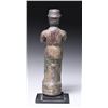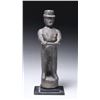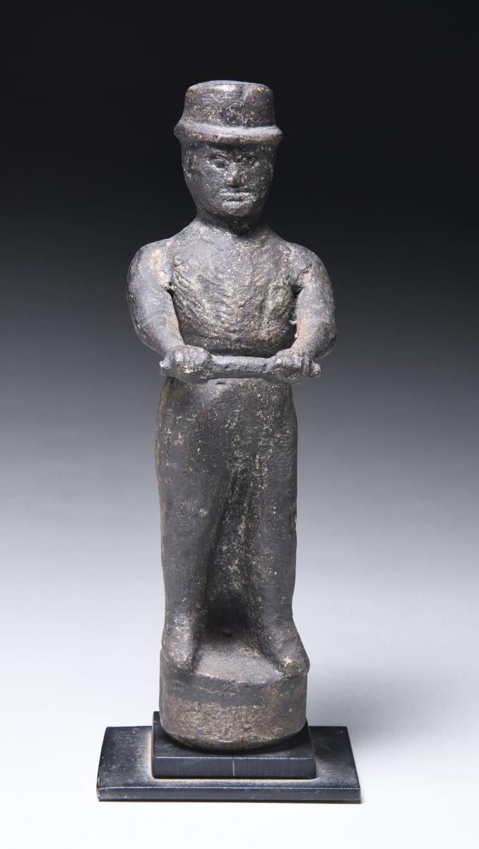 Early 19th century, eastern Pennsylvania. Designed to fit on a post, this unusual figure depicts a standing figure with riding hat and jacket, posed with arms outstretched in front of his body holding a bar to which one would attach the reins of a horse. The body with traces of original paint. SIZE: 12 1/2" h. CONDITION: the figure with normal weathered surface and in use wear. PROVENANCE: From a Pennsylvania Estate Collection. (05-820/TG). $600-800.
