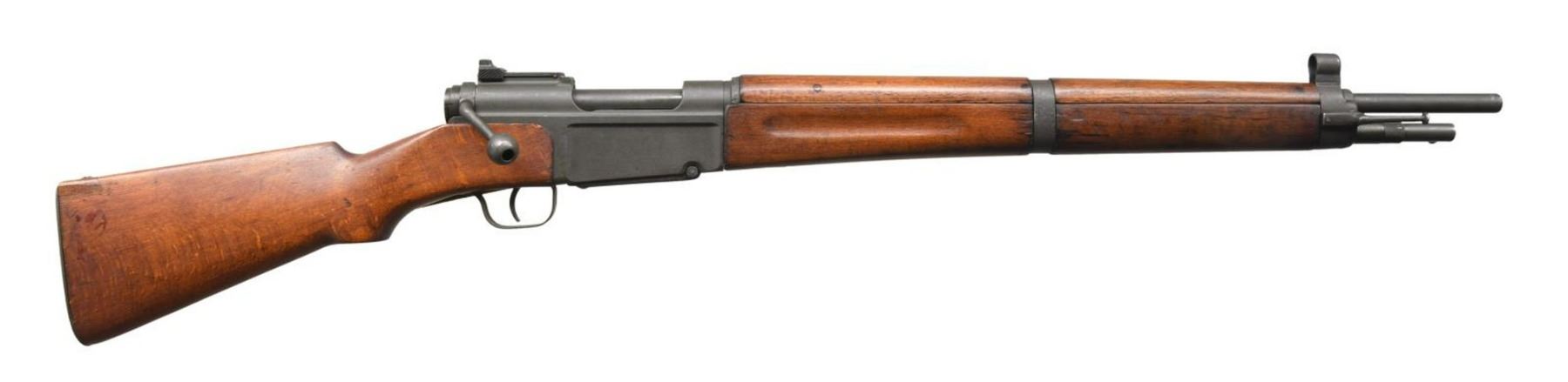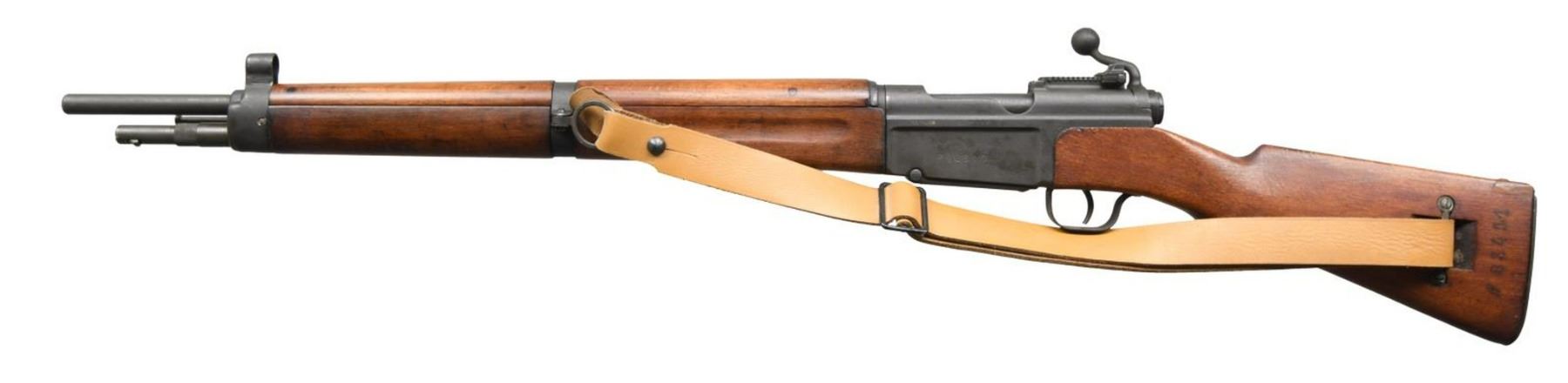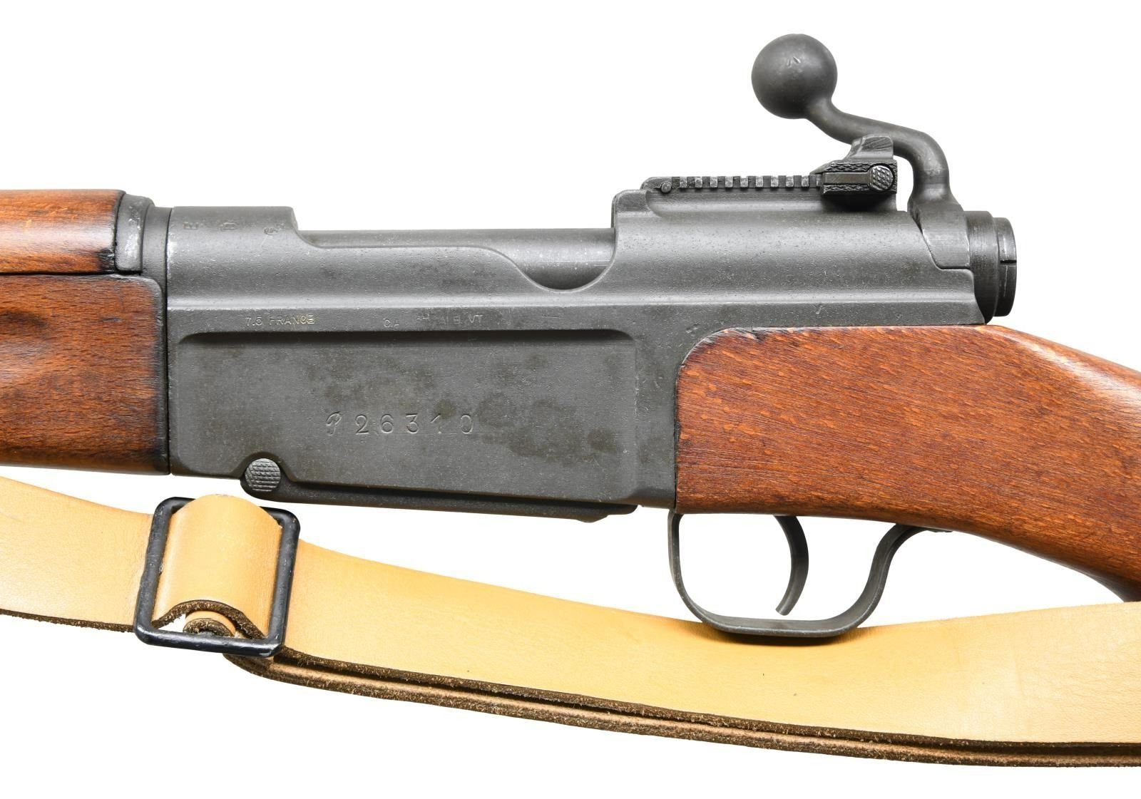 Cal. 7.5mm French. S# P26310. Bbl 23". MAS 36 bolt action rifle manufactured by St. Etienne on a Chatellerault (MAC) manufactured receiver. While primarily a manufacturer of machine guns, Chatellerault manufactured MAS 36 receivers from March to October of 1945. Approximately 16,000 receiver were produced by MAC before it was discovered that the receivers were out of tolerance and production was terminated. Of the 16,000 produced, only 6,101 receivers were found to be in spec, with the remaining MAC receivers being scrapped. This example is stamped with "E", "B", and "G" inspector proofs on the left side of the chamber, with a Century Arms International import stamp on the left side of the receiver above the serial number. Rear of receiver is stamped "MAC" just below the rear sight assembly, indicating manufacture by Chatellerault. Metal components exhibit a phosphate finish, with the furniture consisting of solid wood. Matching numbers are present on the receiver, bolt, floorplate, trigger guard, as well as on the forend. Buttstock and spike bayonet do not match. CONDITION: metal components retain the majority of their arsenal phosphate finish overall, with some small areas of wear and some superficial handling marks that show through to mild silvering. Very bright bore, exhibiting some scattered spots of minor pitting and retaining strong rifling throughout. Wood furniture shows some scattered marks and minor impressions from storage and handling, but is otherwise fine. Buttstock exhibits an arsenal repair at the rear of the comb. A nice example of a rare MAC receiver MAS 36 rifle. (23-2567/MLW). CURIO. $500-800.