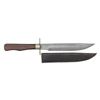 This rare and desirable knife measures 13 3/4" overall with an 8 1/2" blade with a 3 1/2" false edge. John, Charles, and Richard Buck were born and trained in knifesmithing in the famous British city of Sheffield. They established themselves in the town of Worcester, Massachusetts around 1850 and produced some of the finest side knives carried by Union soldiers in the American Civil War. This example is stamped on the blade horizontally "BUCK BROTHERS CAST STEEL". There is a double lobe crossguard that appears brass but was likely plated at one time. The ferrule and rivets also appear to be plated brass. The 1-piece grip appears to be tightly grain walnut and the sheath is leather with a diagonal belt loop. UNATTACHED ACCESSORIES: information about Buck Brothers knives. CONDITION: blade shows light wear with a very tiny chip to the edge. Hilt shows light wear except for a small splinter missing that extends from the top for about 1". Sheath is quite strong and shows very light wear. (02-25888/BF). NON-GUN. $3,000-4,000.