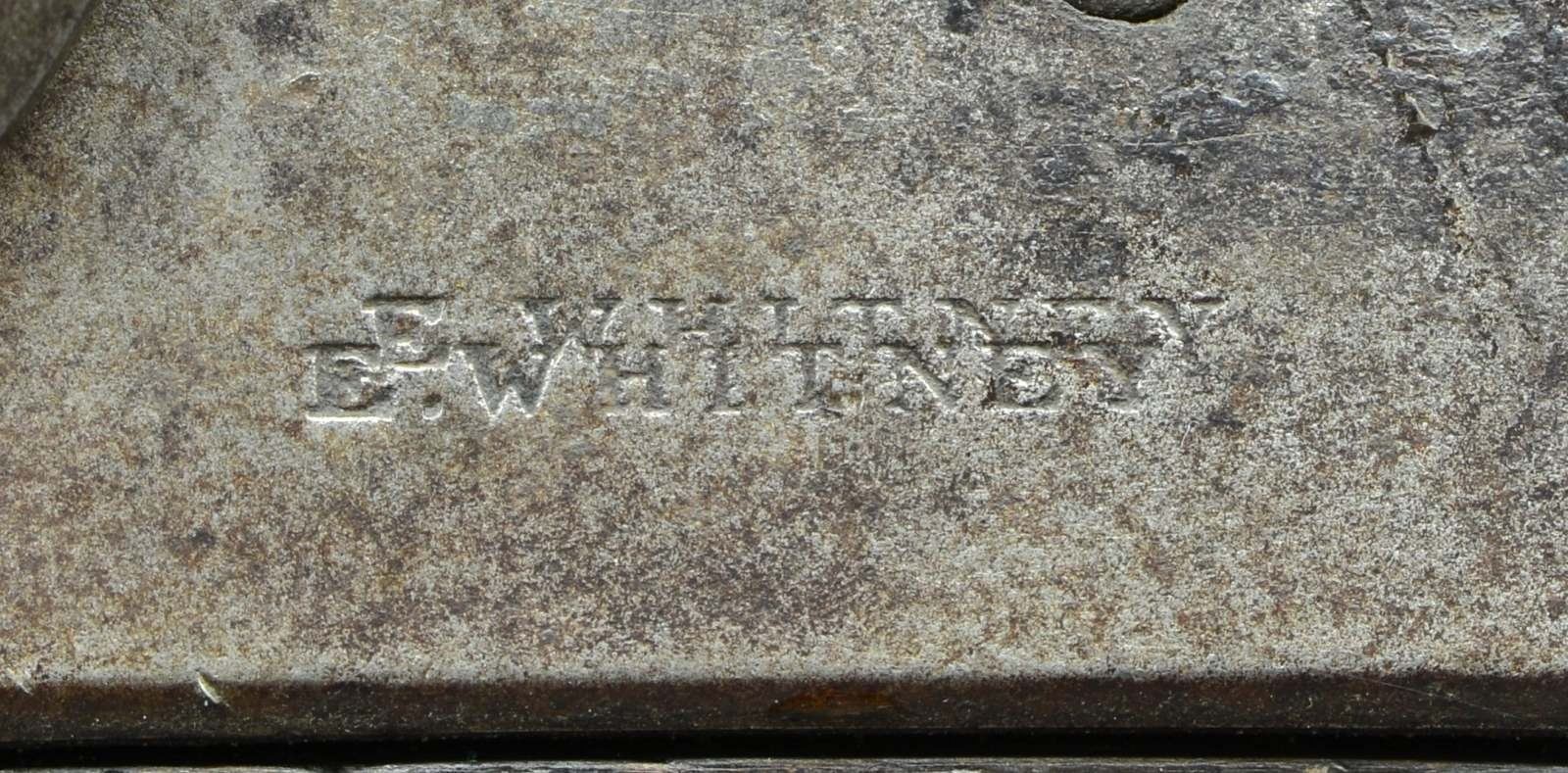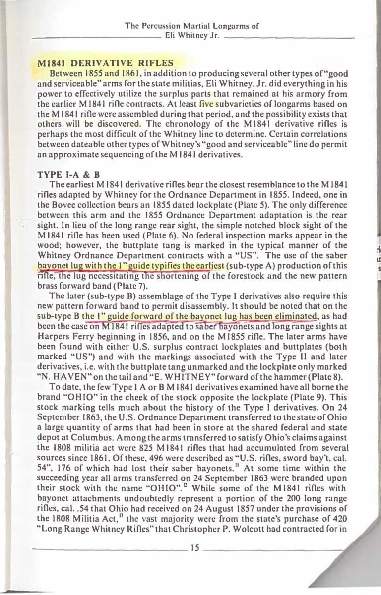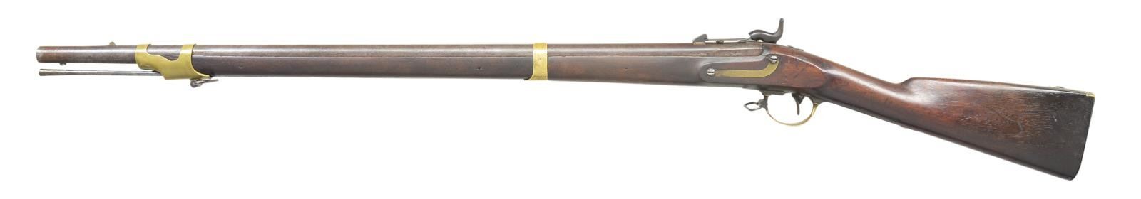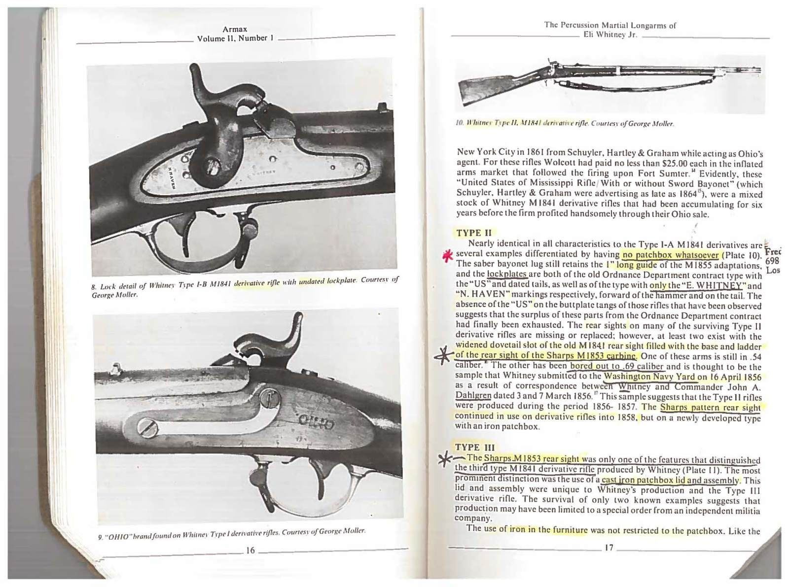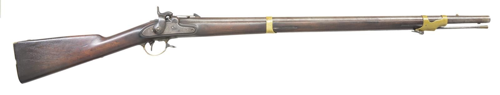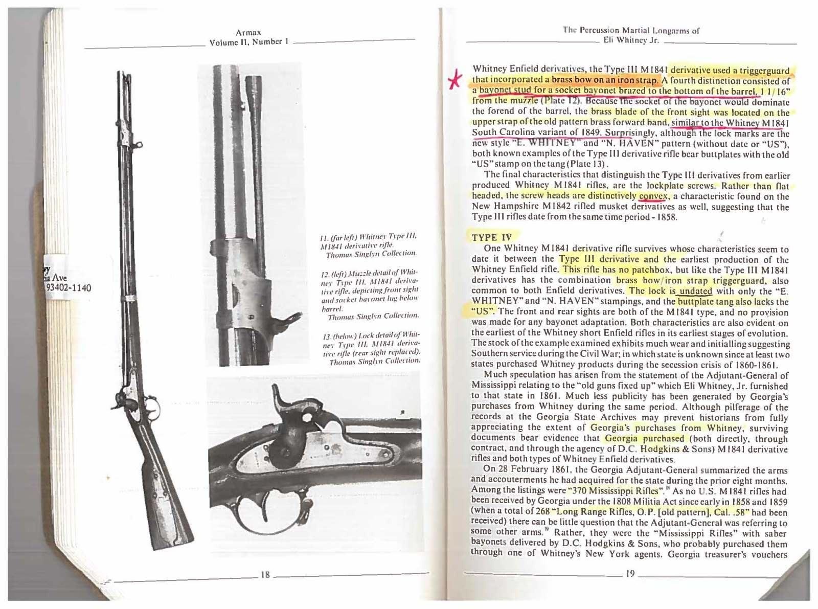 Cal. 60. NSN. Howard Madaus wrote excellent in-depth monograph on these rare & exotic guns in 1988 Journal of The Winchester Arms Museum “The Percussion Martial Longarms of Eli Whitney, Jr.” Here he gives examples of these rarely seen variants made with surplus parts from US military contracts. South Carolina, Mississippi & Georgia were among militias who purchased hundreds of these guns in the late 1850s up till 1861. Differences between the standard production Model 1841 Mississippi rifle include solid stock with no toolbox, steel trigger plate with brass trigger guard bow, convex instead of flat headed screws throughout, Sharps ladder type rear sight, unsurcharged buttplate has inset cut for toolbox lid, devoid of proofs or dates, lock only marked “E. WHITNEY” & “N. HAVEN” and double struck. Derivative guns generally did Not have provision for bayonet. this example has an angular bayonet stud on bottom side of barrel numbered “A38”, Confederate type 1841 ramrod. This exact rifle is pictured George Moller’s “American Military Shoulder Arms, vol. 3, pages 464 & 465. UNATTACHED ACCESSORIES: ARMAX w/ associated article on this rifle. CONDITION: good to very good overall, appears complete and original, mottled iron and brass patinas, solid stock. mechanically fine with smooth clear bore. PROVENANCE: Ex-George Moller collection, Fred Novy collection. (01-23108/JS). ANTIQUE. $2,000-3,000.