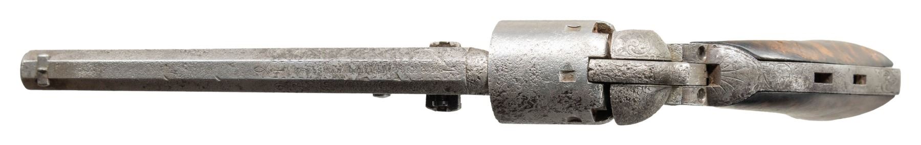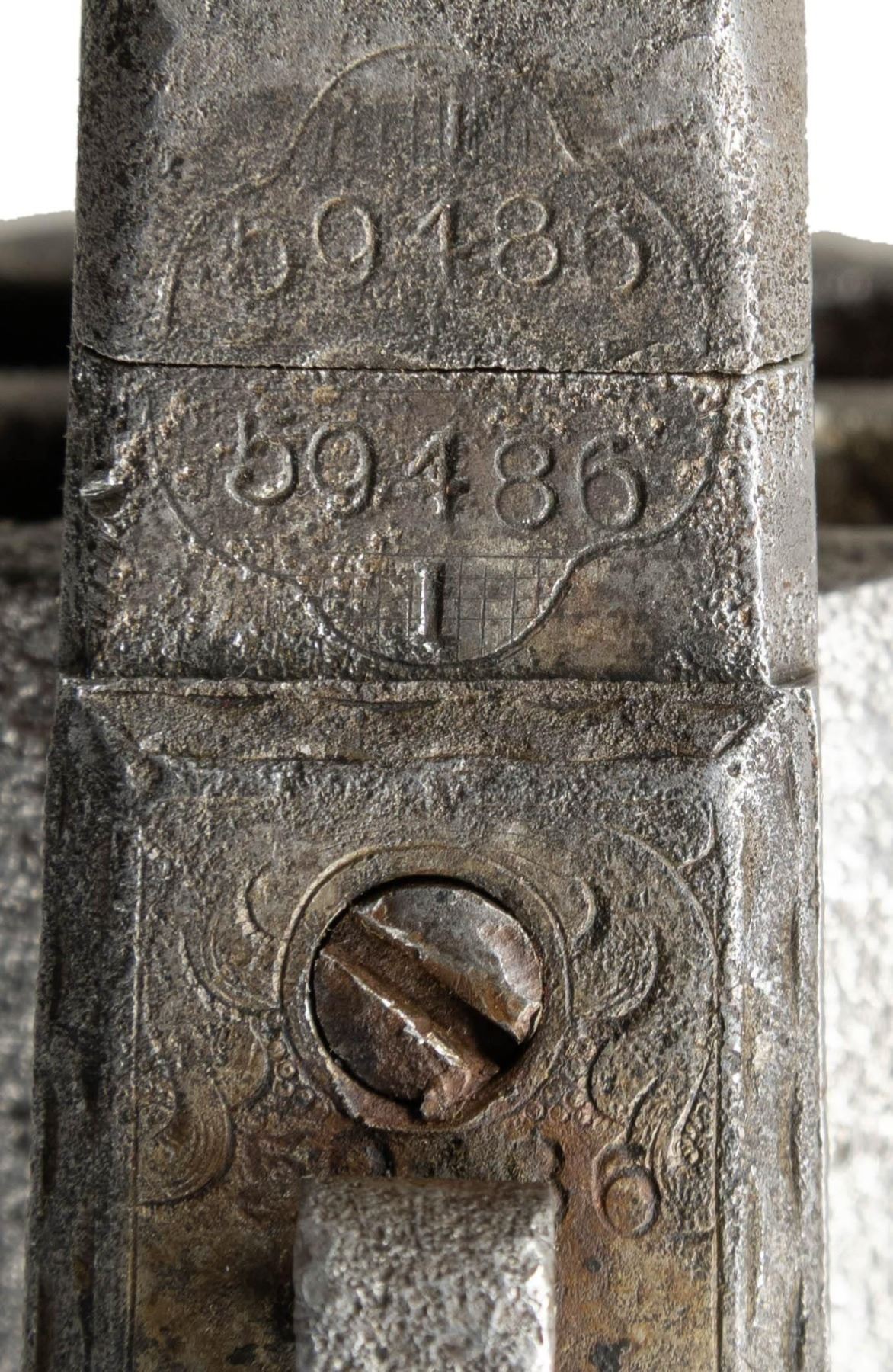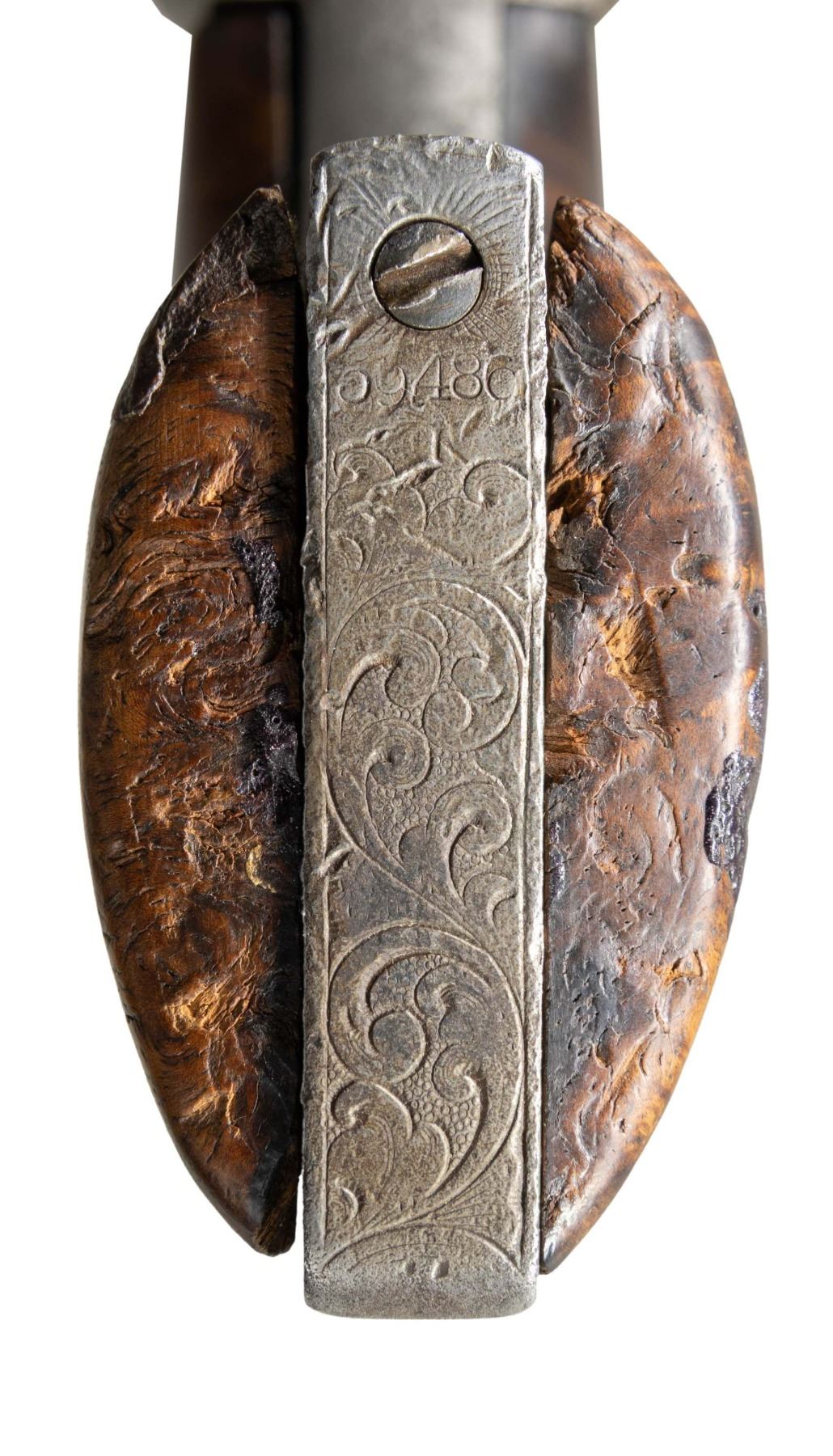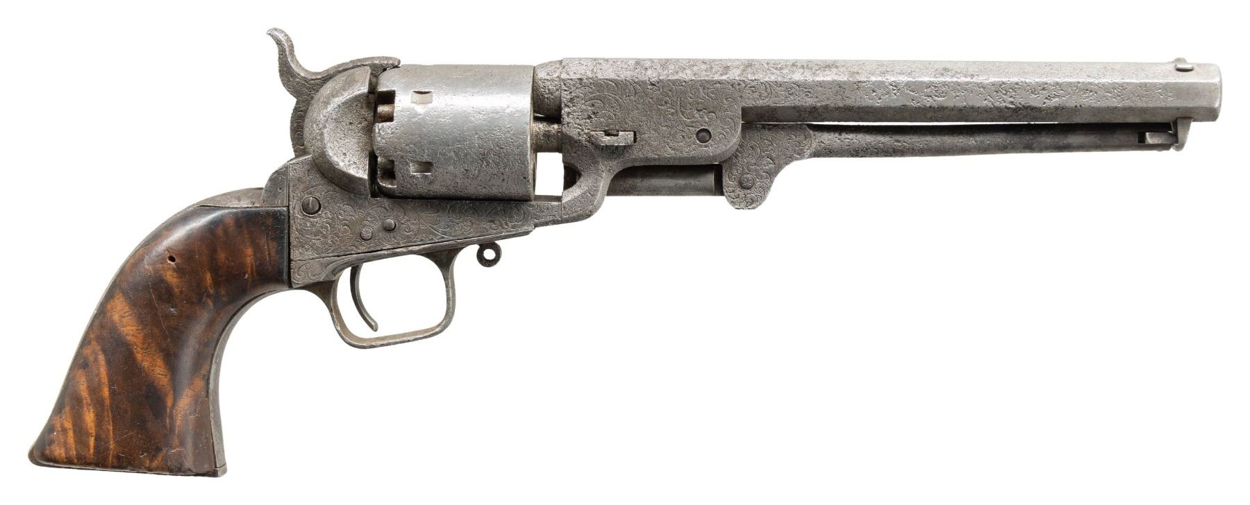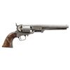 MODEL 1851 NAVY REVOLVER, MADE FOR 1ST MODEL STOCK TO GENERAL WILLIAM S. HARNEY. Cal. 36. S# 59486. Inscribed inside grip frame on triggerguard tang: "Gen'l Harney / with / Col. Colt's Complts". Revolver made in 1856. Standard configuration 7.5" octagonal barrel, New York address, "COLTS PATENT" engraved in arc on frame, full coverage engraving of Gustav Young-style scrolls terminating in flowers and serpent's head on left barrel lug, burl walnut grips, iron grip frame with sling swivel stud forward of trigger bow, backstrap slotted for 1st model shoulder stock. Bob Jordan in his census of 1st model cut for stock navies, lists 11 S#s, all large iron trigger guards, including S# 59492 only 6 S3s away. 1st model stocked navies are very rare as it did not fare well with use, later models soon had later supporting features: notched butt & milled cutouts of recoil shields.William Selby Harney (1800-1889) lifelong army officer, commanding troops in west in 1850s. At the outbreak of the Civil War Harney was commander of the Department of the West, with headquarters in St. Louis, and was one of only four generals in the regular United States Army. Although a Southerner in sympathy marrying into a wealthy slave owning Missouri family, Harney remained with the United States Army in 1861. He retired from active duty on August 1, 1863, but received a final brevet, to Major General, on 13 Mar 1865, "for long and faithful service." Appointed as Indian peace commissioner by Andrew Johnson in 1865, Harney was instrumental in the negotiation of the important Medicine Lodge Treaty of 1867. He is buried in Arlington National Cemetery. UNATTACHED ACCESSORIES: binder of research, collection tags, biography on General Harney. CONDITION: good overall, complete, original & matching other than screws. Revolver is heavily pitted and most original screws were replaced and revolver restored to good functioning condition, pitted bore. PROVENANCE: The Esteemed Norm Greenberg Collection. (01-27652/JS). ANTIQUE. $4,000-6,000.