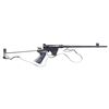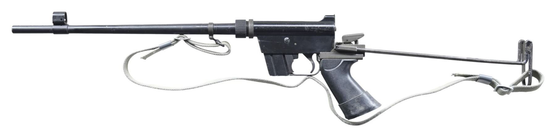SURVIVAL RIFLE. Cal. 22LR. S# 92846-1. Bbl. 16". Mfg. 1959-1973. The ArmaLite AR-7 Explorer is an interesting .22LR Rifle that lives on in the Charter Arms & Henry Repeating Arms library and is familiar to many firearms enthusiasts. Traditionally offered w/ a large plastic stock that doubled as a storage compartment & flotation device, the example we have here is a bit different. A shipment of AR-7s was shipped to Israel where they were modified to their specifications & issued as Pilot Survival Rifles. Their modifications included adding a collapsible wire stock, an FAL Pistol Grip, a barrel shortened to 13" in length & the addition of Israeli 98K rifle front sight. In the mid 1990s approximately 200 of these rifles, and some parts kits, minus the receiver, were reimported from Israel by Bricklee Trading Co of CA & fitted w/ a 3" permanent muzzle brake to comply w/ USA barrel length laws. The receivers were scrubbed of the Israeli markings, leaving only the serial number, and the ArmaLite company info on the barrel, along w/ the abbreviated importer markings. These were interesting & collectable 30 years ago, and even more so today, when they infrequently find their way to the market. This example is sporting a green canvas sling & rubber cover over bottom of pistol grip. Right side barrel markings include; "ARMALITE AR-7 EXPLORER CAL. 22 LR / COSTA MESA, CA. MADE IN U.S.A. / B.T.C. S.E.M.CA.". Adjustable peep rear sight. MAGS: 1 steel 8 rd. CONDITION: While the receiver & barrel still retains a high amount of its finish, there are scattered areas of thinning & drag lines. Right side of receiver appears to have been refinished which would coincide w/ the sterilizing they underwent before leaving Israel. Wire stock locks tightly in the extended position. Bright bore w/ strong rifling. Fire control mechanism appears to function correctly when cycled by hand. (25-2238/JZ). CURIO. $500-800.