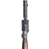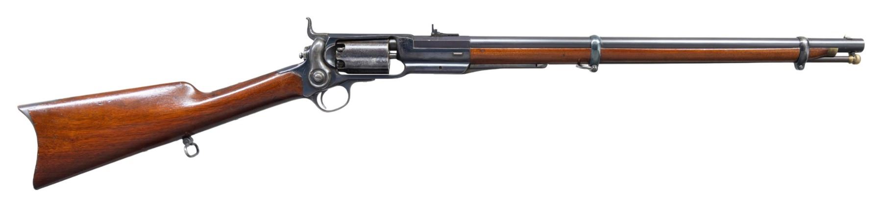 RIFLE. Cal. 44. S# 2341. Bbl. 24" rnd. with octagon shank. Dovetail fastened semi-circular blade front sight. Rear sight has 1 standing leaf with 200 and 400 yard folding leafs. Fluted 6-shot cyl. Receiver top strap is marked "COL. COLT HARTFORD CT. U.S.A.". Left side of frame is marked "COLT'S PATENT/ Nov. 24th 1857". Blued finish with case colored hammer, trigger, and loading lever. 2-band fastened musket length forearm and straight grip walnut stock with crescent steel buttplate. Additional fittings include sling swivels, brass forearm cap, and brass tipped steel ramrod that threads into a carrier tube. Matching serial numbers are found on the bottom of the frame, trigger guard tang, as well as on the buttplate. Serial numbers for the Model 1855 are complicated as they were serial numbered in ranges by calibers, which also included the half-stock sporting rifle, military rifle, and revolving carbine. As few as 100 to a few hundred full stock sporting rifles were mfg. 1856-1864. CONDITION: fine. Bbl. and frame retain over 80% lightly faded blue showing scattered scratches and handling marks. Cyl. has a 50% remaining blue blending with spots of finish loss. Trigger guard tang has faded to gray. Buttplate has dull fading blue. Hammer and loading lever retain some lightly visible case colors. Stock and forearm have good original finish showing scattered scratches, marks, and light dents. Small chips are found behind the rear forearm band. Action is tight with sound mechanics. Near excellent retaining strong rifling. An outstanding, high condition revolving rifle. PROVENANCE: The Esteemed Norm Greenberg Collection. (01-27724/DS). ANTIQUE. $14,000-18,000.