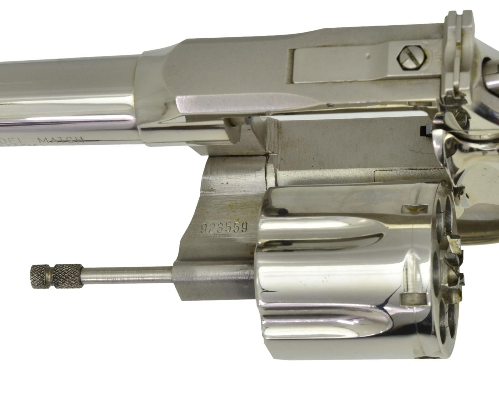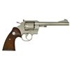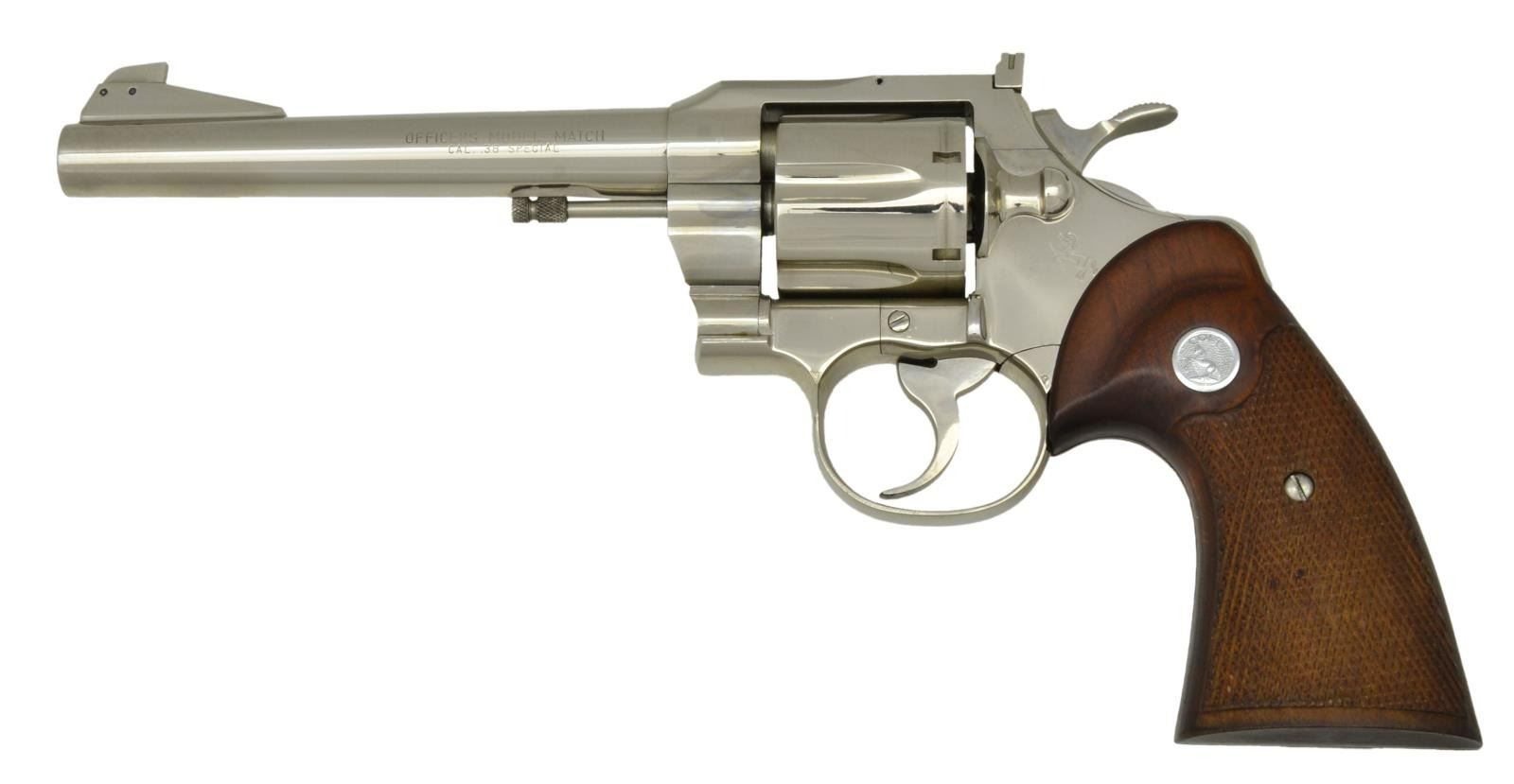 DA REVOLVER WITH FACTORY LETTER. Cal. 38 Spl. S# 923559. Bbl. 6" tapered heavy. Consignor states this was the only nickeled Officer's Model Match ever produced. While we have not been able to confirm, we have been unsuccessful in finding another example. Serrated ramp partridge front sight w/ Accro square notch adj. rear sight. Wide spur hammer. Six shot fluted cyl. Scarce full factory nickel finish. 2 piece checkered target grips w/ silver rampant colt medallions. UNATTACHED ACCESSORIES: letter from the Office of the Colt Historian detailing the following information, "Serial Number: 923559 / Caliber: .38 Special / Barrel Length: 6" / Finish: Nickel / Type of Stocks: Not Listed / Shipped To: Klein Sporting Goods Inc. / Address: 4540 W. Madison Street Chicago, Illinois / Date of Shipment: May 18, 1961 / Number of Same Type Guns in Shipment: 1". CONDITION: near excellent retaining 99% nickel finish. Cyl. shows a drag line. Very good grips. Near excellent bore. (24-951/BH). CURIO. $10,000-15,000.