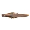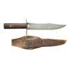 KNIFE WITH SHEATH. 14” overall, 9.25” clip point blade, 4.5” clip with beveled top edge, “BURGER & BROTHER / RICHMOND-VA” stamped on blade, 4” iron cross guard, iron pinned wood slabs on full tang, this is your classic Richmond side knife by the rarest maker and nicely marked. The sheath and frog attached with brass rivets appear original to its time of use and fits it well. CONDITION: very good overall, blade is gray/bright with old sharpening, light staining and pitting, hand worn patina to grip with old small pasted paper tag with indiscernible number. brown leather sheath is sound with scuffing as is frog. PROVENANCE: Pictured on page 193 “Accoutrements IV” by Jim Johnston. Ex-Jack Malloy Collection. (02-18172/JS). $7,000-9,000.