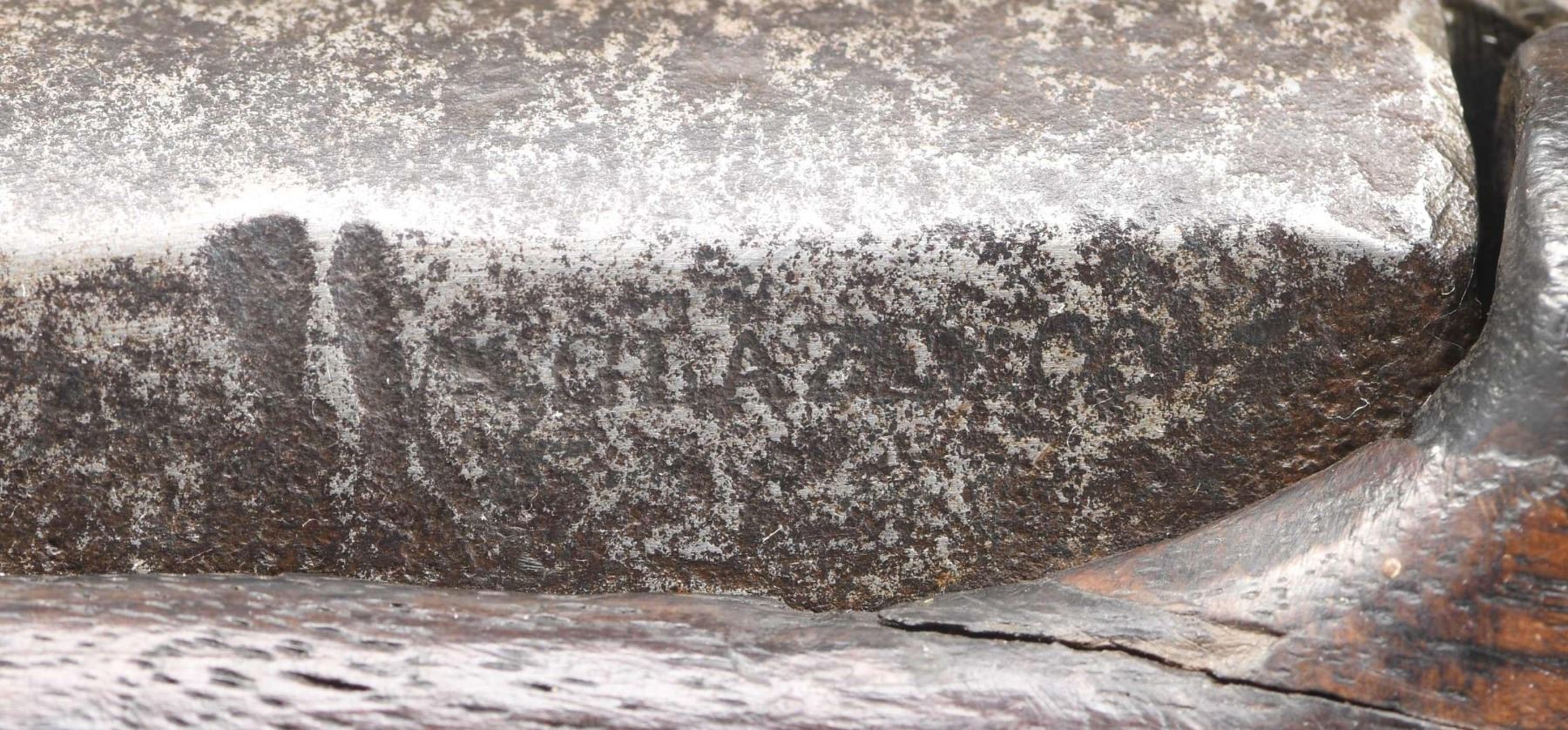 CARRIED BY "G W BROWN". Cal. 54. NSN. Among the most elusive of Confederate secondary arms is the South Carolina Palmetto Armory Model 1841 rifle, and original specimens are rarely offered. This example conforms to other known Palmetto Armory rifles: 33" barrel, .54 caliber, 7 land & groove rifling, brass furniture, unique toolbox mortise not cut for nipple, brass tipped ramrod. Lock markings: "PALMETTO ARMORY SC" in a circle around a Palmetto tree forward of hammer and "COLUMBIA / SC 1852" vertically at tail. Barrel breech marked; "Wm. GLAZE & CO." with "V / P/ palmetto tree". Buttplate has overstruck "SC" over "US" which is very clear in photos. Unique Palmetto assembly marked stock, butt plate, and barrel/barrel tang. Unique Palmetto brass blade front sight and top mounted bayonet lug, rear sight is missing from its dovetail. "G W Brown" is scratched by soldier on the left buttock. There are too many GW Browns in the Confederate army to pin rifle down to individual. UNATTACHED ACCESSORIES: copy of the American Society of Arms Collectors (ASAC) #115, "The Palmetto Rifle, An Examination of the Survivors" by Frederick G. Novy, data sheet from Dr. Novy on this rifle. CONDITION: good to very good overall, appears original and complete as used during Civil War. Markings all discernible though barrel proofs are weak from firing pitting. Stock is sound, old cleaning and sanding, but name still clearly scratched, there is nailed half inch iron washer attached below name. Mechanically functional, pitted rifled bore. PROVENANCE: Dr. Fred Novy collection. Dr. Novy is leading authority on Palmetto weapons and author of "The Palmetto Rifle" article published in American Society of Arms Collectors bulletin. He has studied most examples known in about every major institution & private collection. (01-25996/JS). ANTIQUE. $9,000-12,000.