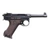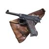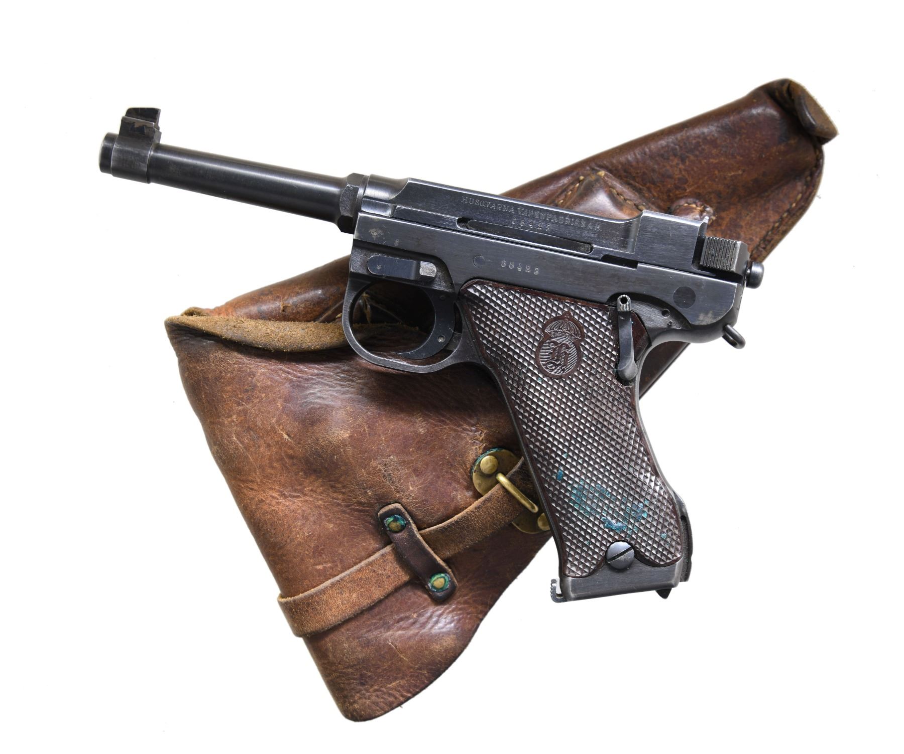 SEMI-AUTOMATIC PISTOL WITH HOLSTER. Cal. 9x19mm Parabellum. S# 68423. Bbl. 4 3/4". M/40 Lahti semi-automatic pistol mfg. in Sweden for the Danish Brigade and subsequently issued to Danish police after World War II. After the German invasion of Denmark in 1940, many Danish military personnel fled to Sweden. While in Sweden, these troops, deemed the "Danish Brigade", were trained and equipped to retake Denmark. Ultimately, the Danish Brigade was deployed on the same day of the German surrender of Denmark, and many weapons, such as this example, found their way into Danish police units. This example, falling within the appropriate S# range of 67000-69202, is marked "HUSQVARNA VAPENFABRIKS A.B." above the S# on the left side of the bbl. extension. Left side of the frame is marked with the S#, with the rear stamped with a Swedish Crown/S.S., indicating inspection by Captain Sten Stenmo ("S.S." also stamped on the interior of the bbl. extension), with a Danish police marking "Rplt. S 5223" on the right. Metal components exhibit a blue finish overall. Frame is mounted with 2-piece inverse checkered black plastic grips. All serialized parts are matching and include the frame and bbl. extension. MAGS: 2 8-rd. UNATTACHED ACCESSORIES: brown leather holster. CONDITION: very good, exhibiting some areas of light wear and thinning that show through to gray patina, as well as a few concentrated spots of mild to moderate pitting overall. Near mirror bore, exhibiting what appears to be several spots of either light surface oxidation or hardened grease, while retaining well defined rifling throughout. Grips are very good overall. Holster remains malleable, exhibiting wear overall, with some areas of crazing, but otherwise remains sturdy and serviceable. An extremely intriguing "Danish Brigade" M/40 Lahti pistol. (24-6492/MLW). CURIO. $900-1,300.