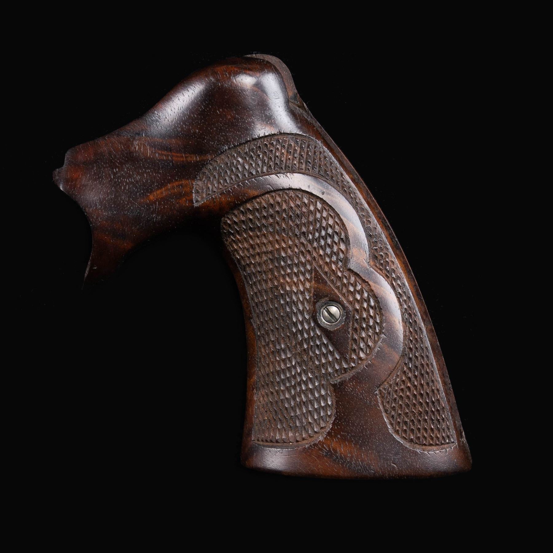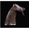 OFFICER'S MODEL REVOLVER. Attractive 2-piece set of Roper grips made for use with Colt's Officer's Model revolver. Grips are constructed of wood, featuring checkered panels on either side, with the left grip being slightly elongated along the top left of the panel. Interior of grips are hand etched "47316". CONDITION: very good to excellent, exhibiting some light wear to the checkering, as well as some scattered superficial marks and minor impressions overall. (02-25490/MLW). NON-GUN. $800-1,200.
