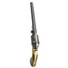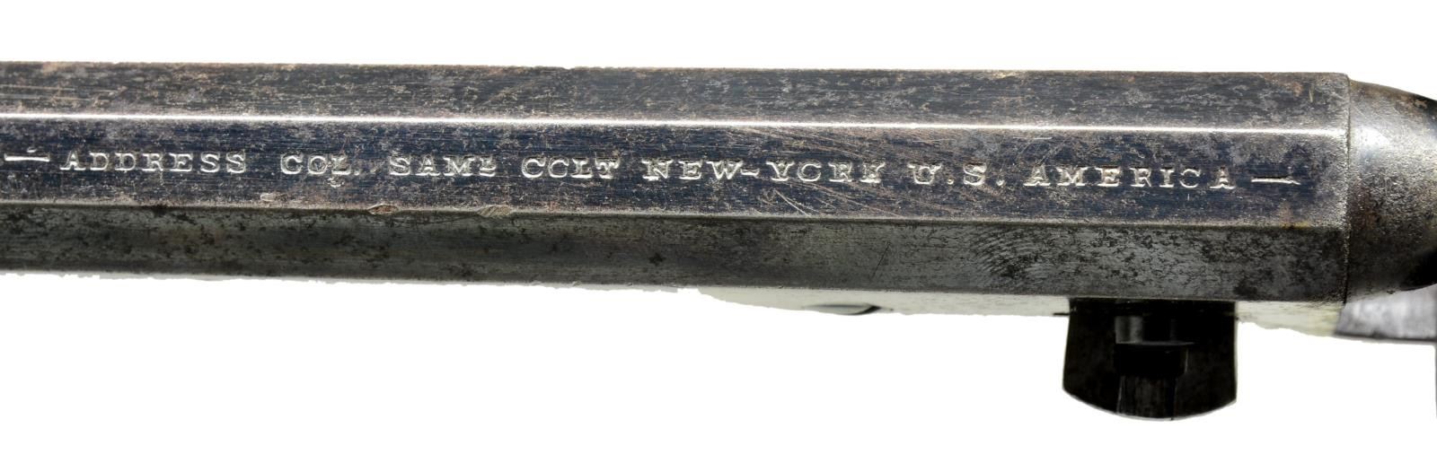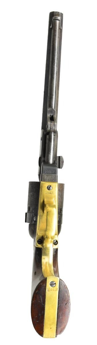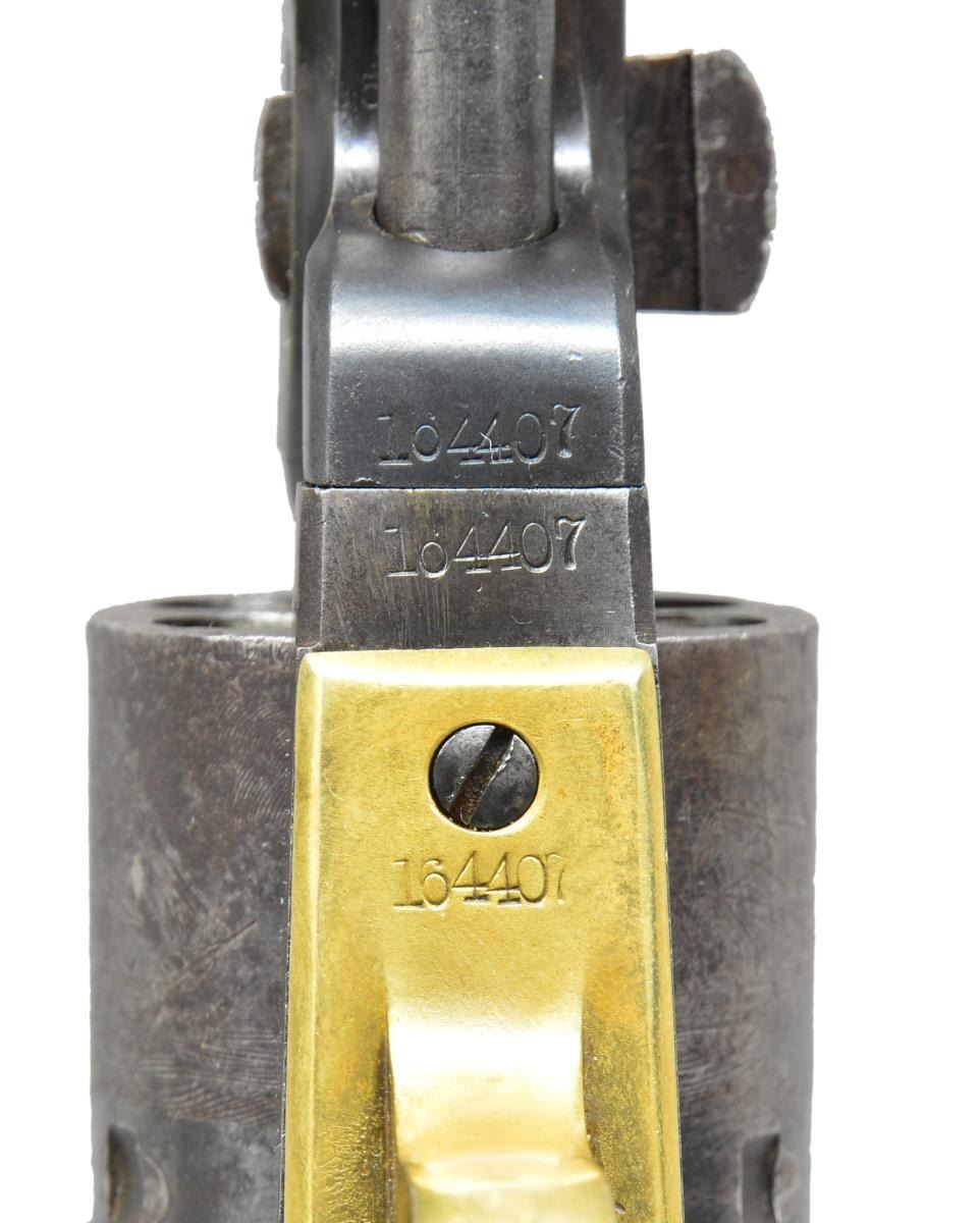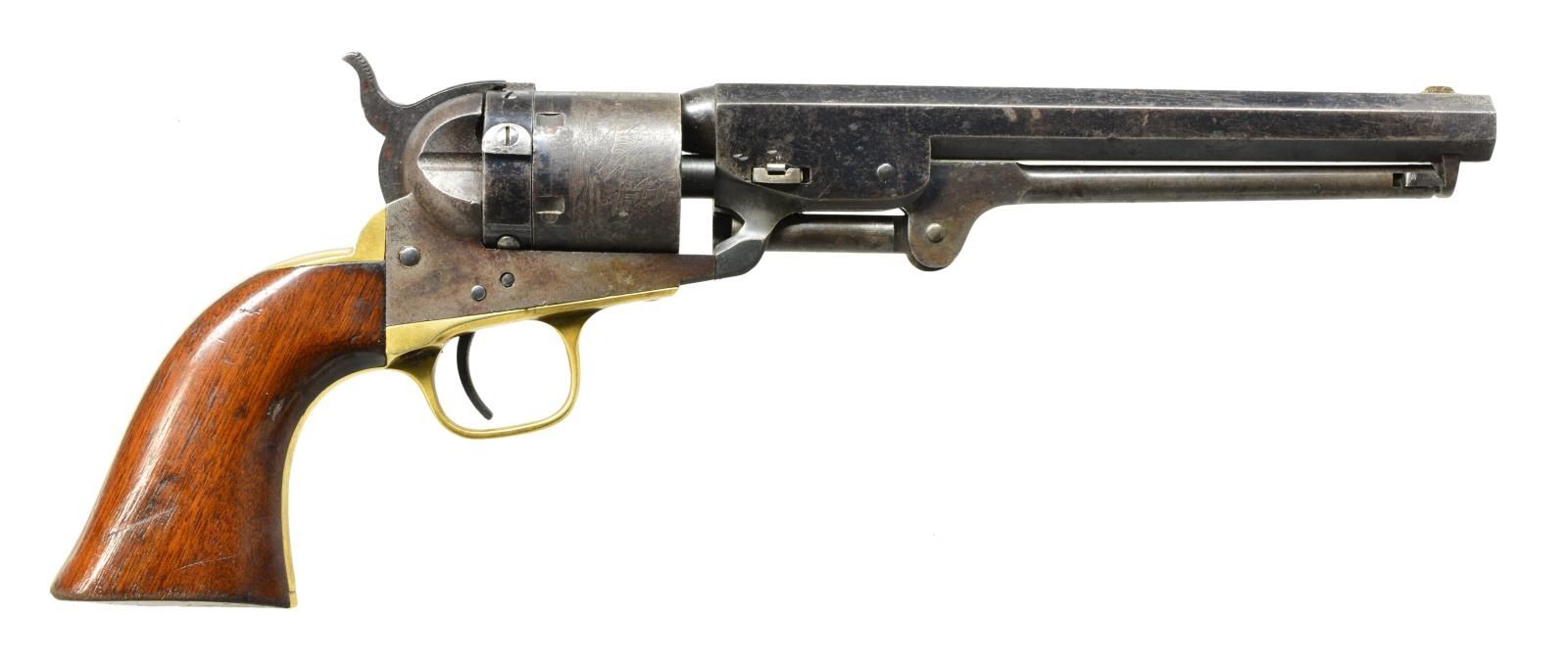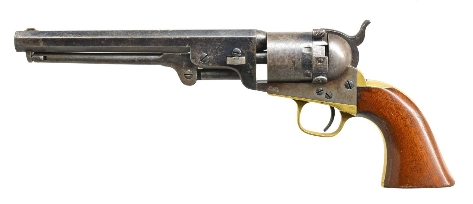 NAVY REVOLVER. Cal. 36 Thuer Centerfire. S# 164407. Made between 1869 & 1872 w/ a total production of approx. 5,000, this was Colt's first revolver chambered for a metallic cartridge. This cartridge was made of brass & tapered to be loaded from the front of the cyl. in normal percussion fashion. The original 7 1/2" oct. bbl. marked "ADDRESS COL. SAM l COLT NEW-YORK U.S. AMERICA" is unaltered except for hand filing a loading channel on right side of assembly lug area. The original loading lever is also used, but the face of the rammer is threaded to accept Thuer priming punch. New cyl. is bored to accept tapered cartridges which needed to be made to very close tolerances. The conversion ring has 1868 patent date & is fitted w/ firing pin. It pivots to the right to be in firing position & to the left to be in eject position w/ slot at top, engraved "E". When in this position, lowering the hammer on a secondary "firing pin,"actuates dbl. cams in the conversion ring which push on the bottom of cartridge initiating extraction. The ring & cyl. are both stamped w/ assembly number "2". Left forward part of frame stamped "COLT'S" "PATENT". Brass grip frame stamped "36 Cal". One piece walnut grips are varnished. CONDITION: fine to very fine. Bbl. retaining approx. 60% bright blue. Lever retains about 50% case hardening color. Cylinder has strong scene. It & conversion ring retain about half of their original blue. All blued surfaces have scattered light freckling & some pitting. Frame & hammer show traces of case hardening color, but are mostly gray to brown. Grip frame brass is a golden yellow to brown. Grips retain most of their original varnish w/ some added on right side. All #'s match except cyl. which is numbered "6144". (Probably due to misreading of S# when stamping new cyl. by an employee.) Bore is good, lightly pitted. Mechanically good. Action screws appear to be replaced at time of conversion. PROVENANCE: The Estate Collection of Gary Parietti. (01-19046/MGM). ANTIQUE. $4,000-6,000.