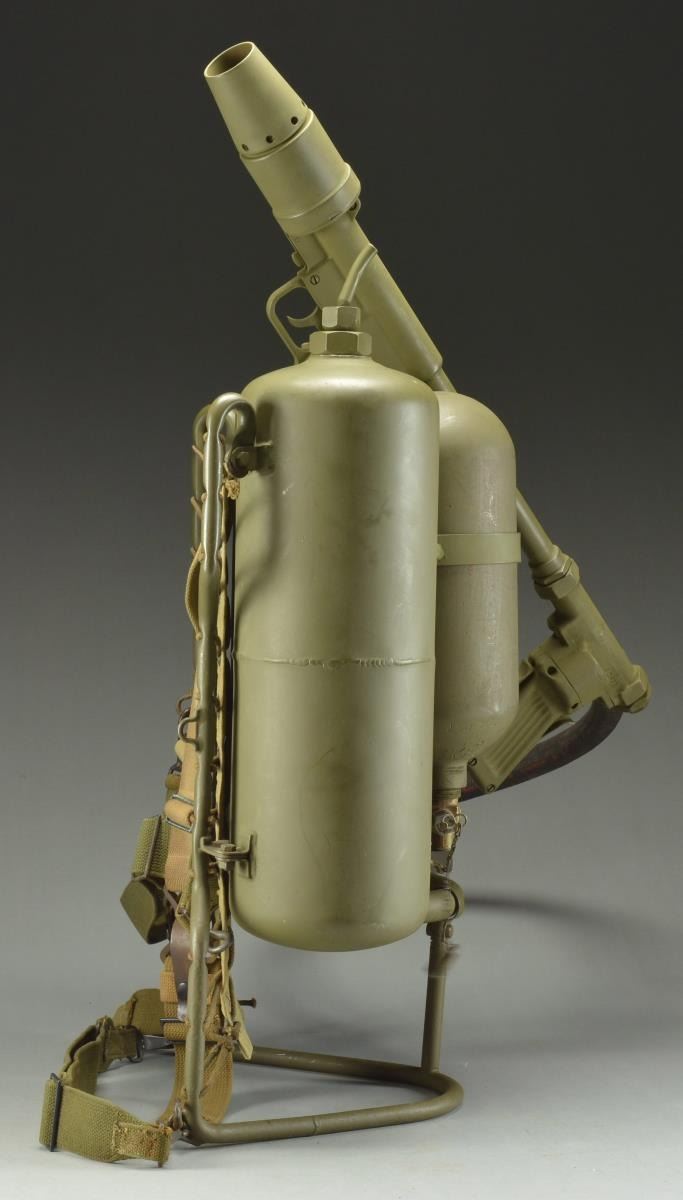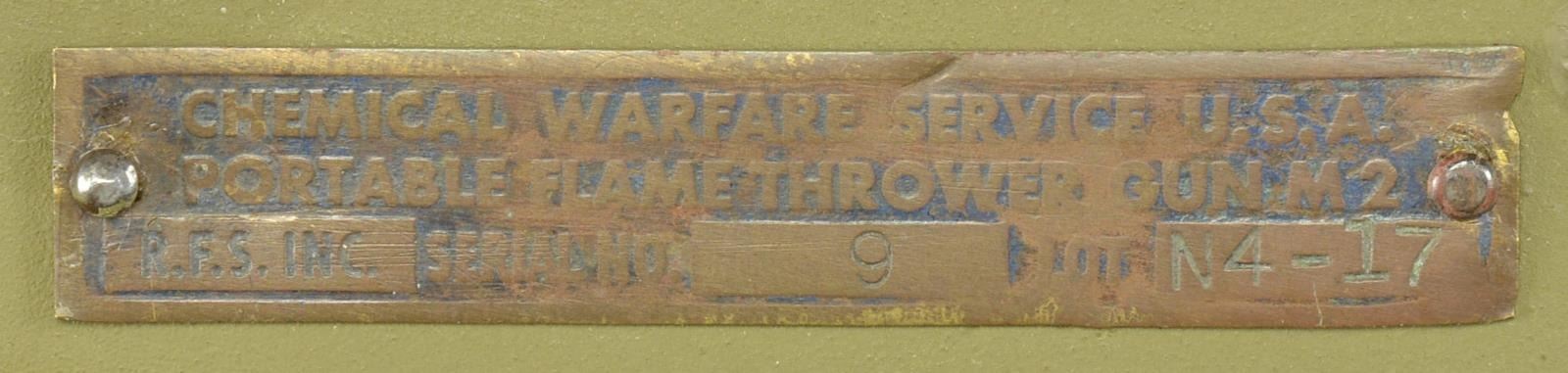 S# 9. The portable flame thrower fielded by U.S. Soldiers & Marines in World II and Vietnam is one of the most fabled devices ever utilized in combat. Its simple mechanics have always been completely overshadowed by its capability for sheer destruction. Anytime one is fielded at a military demonstration the lines of spectators are long and deep. Adding to its mystique of fable & lore is the powerful heat wave that can be felt by bystanders far behind and out of range of the operator, and always remains a vocal highlight of any personal demonstration. Capable of use with liquid fuel, or thickened fuel, they never fail to completely engulf their target in a massive stream of flame. This particular piece, the early M2 was discontinued prior to the WWII invasions of Iwo Jima & Okinawa, & it was later replaced by the M2-2, The M2A1-7 & finally the M9A1. It appears quite complete, including the ignition head (the business end) of the M2 which would be placed forward of the barrel, valves, hose & iconic tanks. It still wears the blue & brass ID tag marked w/ the following; "CHEMICAL WARFARE SERVICE U.S.A. / PORTABLE FLAME THROWER GUN M2 / F.F.S. INC. / SERIAL NO. 9 / LOT N4-17". CONDITION: the triggers still moves freely under heavy spring tension, both on the ignition head as well as the valve lever & grip safety. The latch operates correctly, locking the ignition shield tightly, as indexed by the outer case pin. The trigger rod moves freely. Backpack frame includes web gear. All accessible valves appear to move freely. Tanks appear free of any outwardly noticeable damage or blemishing, currently wearing a coat of matching OD green paint. Main feed hose remains pliable (02-18112/JZ). NON GUN. $15,000-20,000.