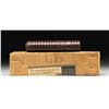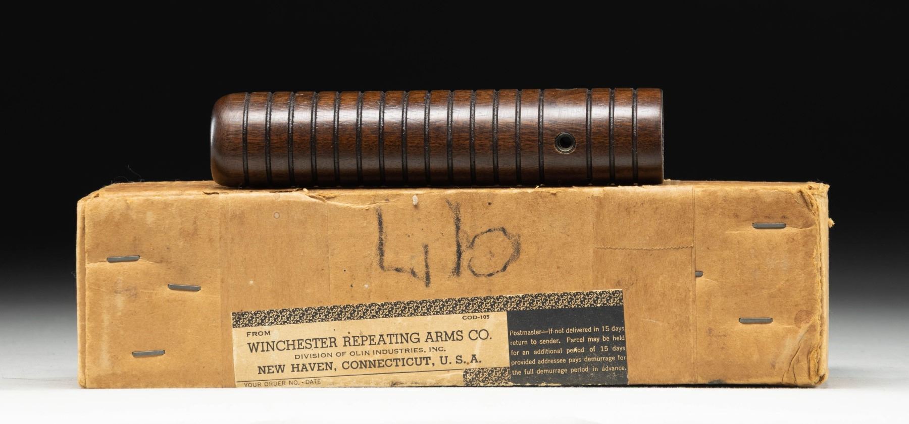 FOREARM WITH FACTORY SHIPPING BOX & RECEIPT. 3-screw grooved wood forearm mfg. by Winchester, as commonly found on the Model 1893 and early production Model 1897s. The 3-screw forearm is found on the earlier "C Series" 1897 production shotguns, but was discontinued in favor of a more durable design, which was less prone to cracking and breakage. UNATTACHED ACCESSORIES: Winchester factory shipping box faintly dated in penciled on the left side of the label "4/29/52". Box contains its original packing slip / receipt dated "4/22/52", indicating purchase of x6 "M/97 ACT. SLIDE HOOK SCREWS", x6 "M/97 MAG BAND BUSHING SCREWS 12GA", x1 "M/97 ACT. SLIDE HANDLE STD" (standard forearm), x1 "M/97 ACT. SLIDE HANDLE STYLE C" (3-screw forearm), and x1 "M/97 ACT. SLIDE HANDLE SCREWS". Stapled to the receipt is a handwritten letter from Enderle's Gun Shop in East Peoria 8, Illinois, dated 04/18/52, requesting the aforementioned parts. Forearm screws are absent. CONDITION: forend is very good, showing few discernible handling marks overall. Forward "bridge" of handguard exhibits 2 small cracks, neither visible when installed. Box is good, showing general overall wear and some small scattered spots of staining, but otherwise remains sturdy and serviceable. Label shows some wear and minor losses, but otherwise remains intact and legible. With 3-screw forearm production appearing to have been terminated around 1904 with the introduction of "D Series" Model 1897, it is highly unusual and intriguing to find an original factory 3-screw forearm with its 1952 dated receipt. (02-25393/MLW). NON-GUN. $200-300.