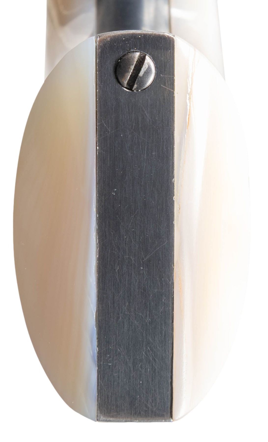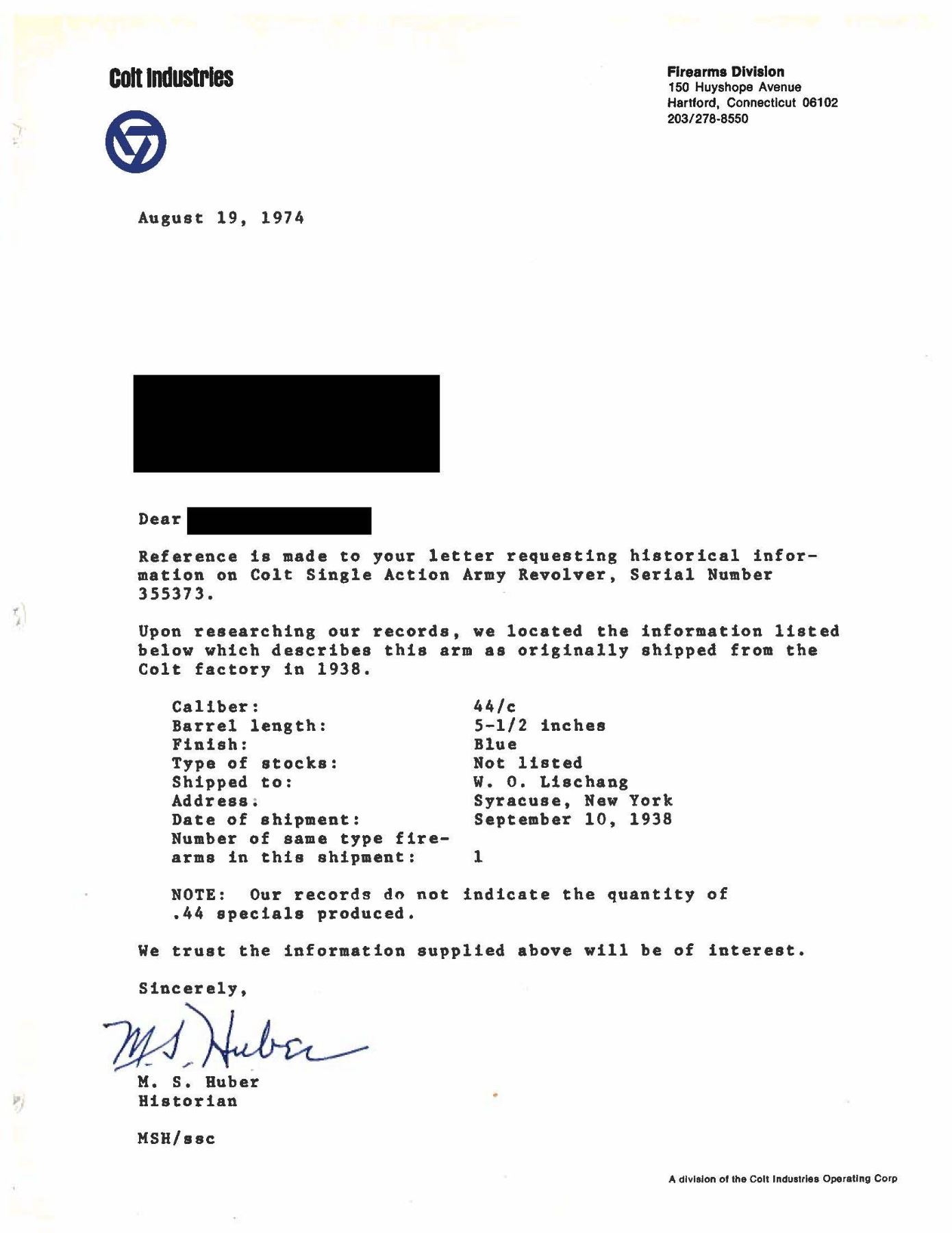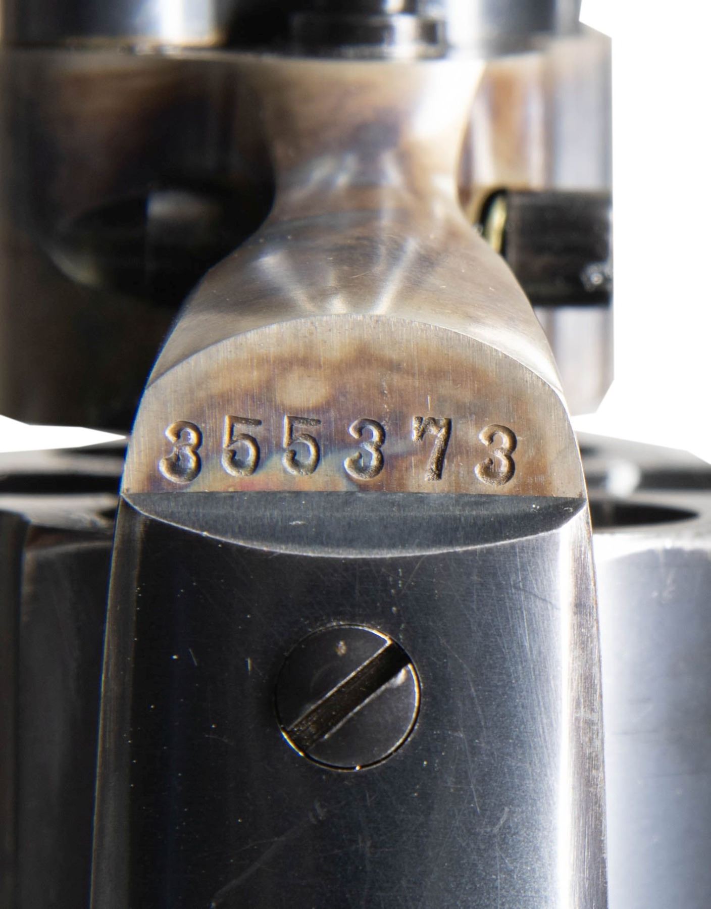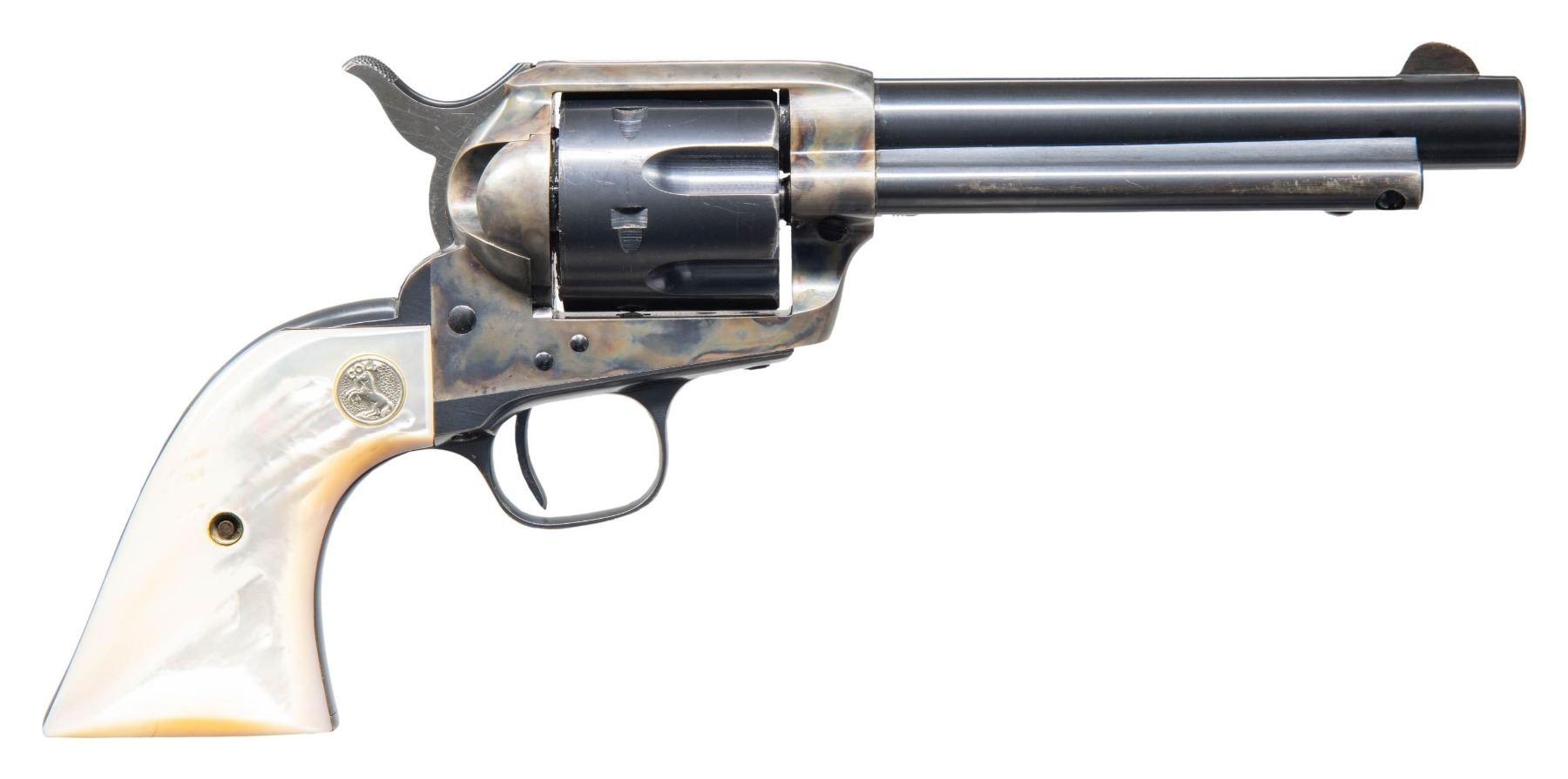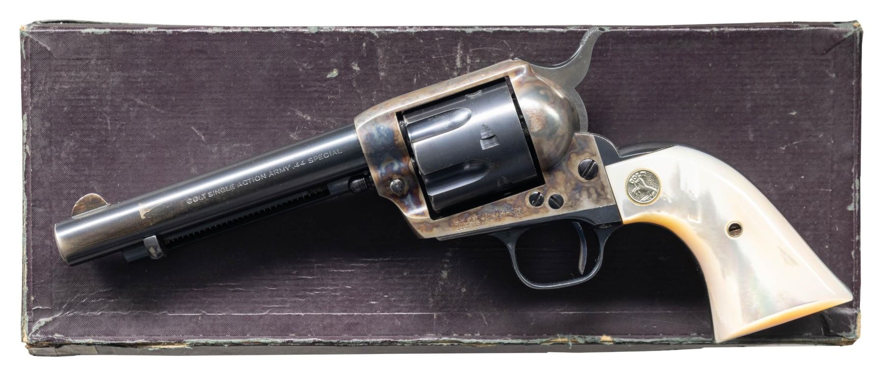 44 SPECIAL WITH ORIGINAL BOX. Cal. 44 Special. S# 355373. Bbl. 5 1/2". Single Action Army revolver mfg. by Colt in 1940. "THE 36 CALIBERS OF THE COLT SINGLE ACTION ARMY" by David M. Brown Page 82 states that only 506 revolvers were mfg. in this caliber. Left side of the bbl. is marked "COLT SINGLE ACTION ARMY .44 SPECIAL", with Colt's single line address marked across the top. Left side of the frame is marked with Colt's -line patent information, followed by the Rampant Colt logo. Frame features a case color hardened finish, with remaining metal components exhibiting a blue finish overall. Trigger is nitre blued, with the sides of the hammer being polished in-the-white. 2 Piece mother of pearl grips with Rampant Colt medallions. Blade front sight with frame notched rear sight. All serialized parts are matching and include the frame, trigger guard, and rear grip strap (both appropriately numbered on the right side beneath the grip panel). Matching assembly # "811" is present on the frame (beneath right grip panel) as well as on the loading gate. UNATTACHED ACCESSORIES: Colt factory letter dated August 19, 1974 "Caliber .44/c / Barrel Length 5-1/2"/ Finish Blue/ Type of Stocks Not Listed/ Sold & Shipped to: W.O. Lischang / Address Syracuse, New York / Date of shipment September 10, 1938 / Number of same type firearms in / in this shipment. one". This example is also accompanied by its original factory box, which matches via the full S# in pencil on the underside of the bottom panel. Box is appropriately marked with a "S&W CARTRIDGE" end label on the lid. Box contains shooting instructions and brush. CONDITION: blued parts retain 95% original finish with high edge wear and spot of thinning finish 1 3/8" from muzzle. Frame retains 90%+ bright original case colors. Grips & bore near excellent. Mechanically fine. (25-6045/BH). CURIO. $11,000-15,000