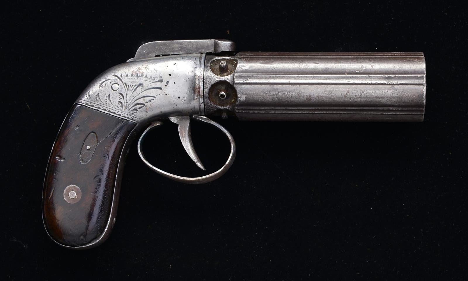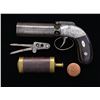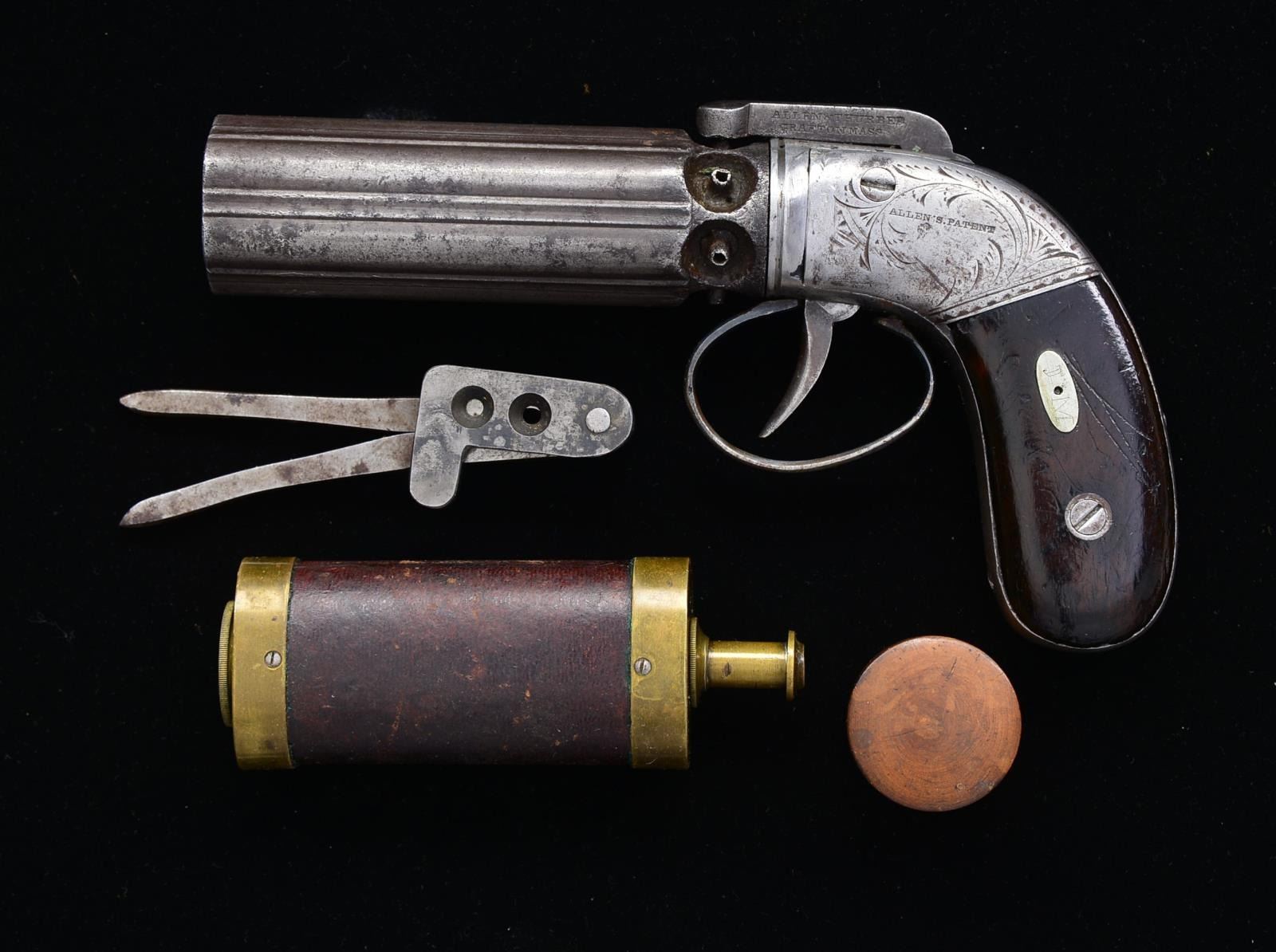 PEPPERBOX PISTOL COMPLETE WITH ACCESSORIES, SN 1. Cal. .31. S# 1. Bbl. 3.25” 6 - cluster, “ALLEN’S PATENT” stamped on left side of sparse engraved frame, unmarked early thin fluted bbl. ribs, “ALLEN & THURBER / GRAFTON MASS” stamped on left side of bar hammer, early flattened slim grips, production 1837, no more than 150 made. UNATTACHED ACCESSORIES: Allen patent flask, cap container & 2-cavity mold. CONDITION: good overall, complete & matching, SN “1” found on frame, sideplate, trigger, & hand. Cylinder screw is restored. Mottled gray patina, grips refinished, one German silver escutcheon as initials “JM”. Mechanically functional, smooth bores. Accompanying 3 compartment Allen patent flask is very good as is wood screwed cap container and 2 cavity mold. PROVENANCE: ex-collection Phillip Van Cleave, ex-collection Paul Henry 1989. Lifelong collection of early Allen pistols. (01-18588/JS). ANTIQUE. $500-800.