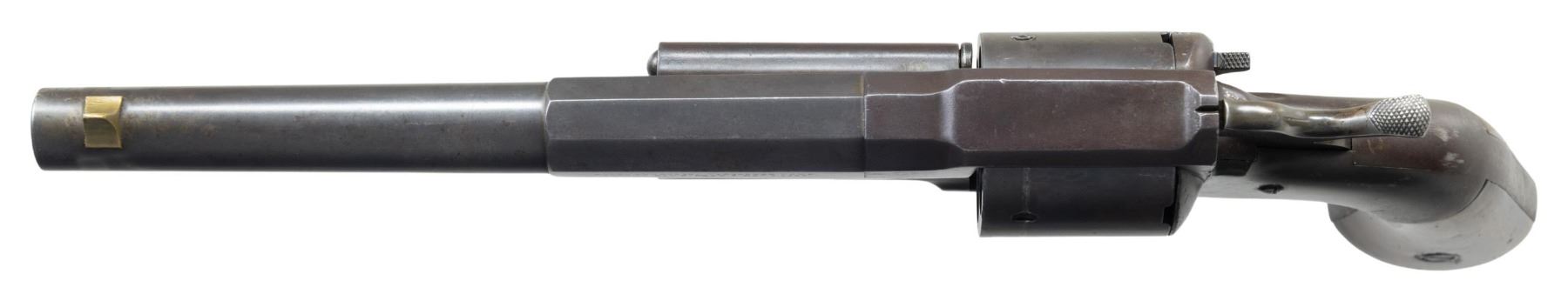 ARMY REVOLVER. Cal. 44. S# 307. Large frame, 13.5" overall, 7.5" half octagon to round barrel, 6-shot cylinder with notches for cartridge lips at rear wall, made 1861-1862 and there are thought to be no more than 250 made, production ended due to patent infringement lawsuit brought by Smith & Wesson. Very similar to center hammer percussion army, that were purchased by US government in the Civil War and produced after this rare model. CONDITION: very good overall, thin blue retained on barrel, overall plum patina, crisp markings, grips retain most of their high polish varnish, mechanically fine, bright shiny rifled bore. PROVENANCE: The Esteemed Norm Greenberg Collection. (01-27636/JS). ANTIQUE. $2,000-3,000.