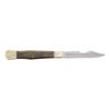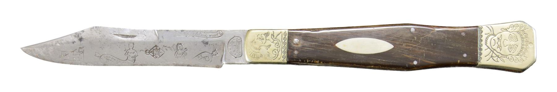 11"overall, 4.75" clip-point blade, stamped cyphers of Chinaman, Neptune, mermaid, amulet, "I SURPASS [ALL]" "[TRY] ME" and "ALABAMA HUNTING KNIFE". Ricasso stamped "S. WRAGG / No 25 / FURNACE HILL / SHEFFIELD". Handle has dark brown horn slabs with vacant German silver escutcheon. The solid German silver front bolsters are stamped with grotesque fanciful Indian heads with serpents and tomahawks. This is a rarely offered large circa 1845 Wragg folder. UNATTACHED ACCESSORIES: Custom protective sleeve. CONDITION: very good overall, blade is worn, cleaned & sharpened which removed some of cypher markings. PROVENANCE: Larry W. Williams lifetime collection-purchased 1975; pictured in Gun Report, July 1977. (02-23273/JS). NON-GUN. $2,000-4,000.